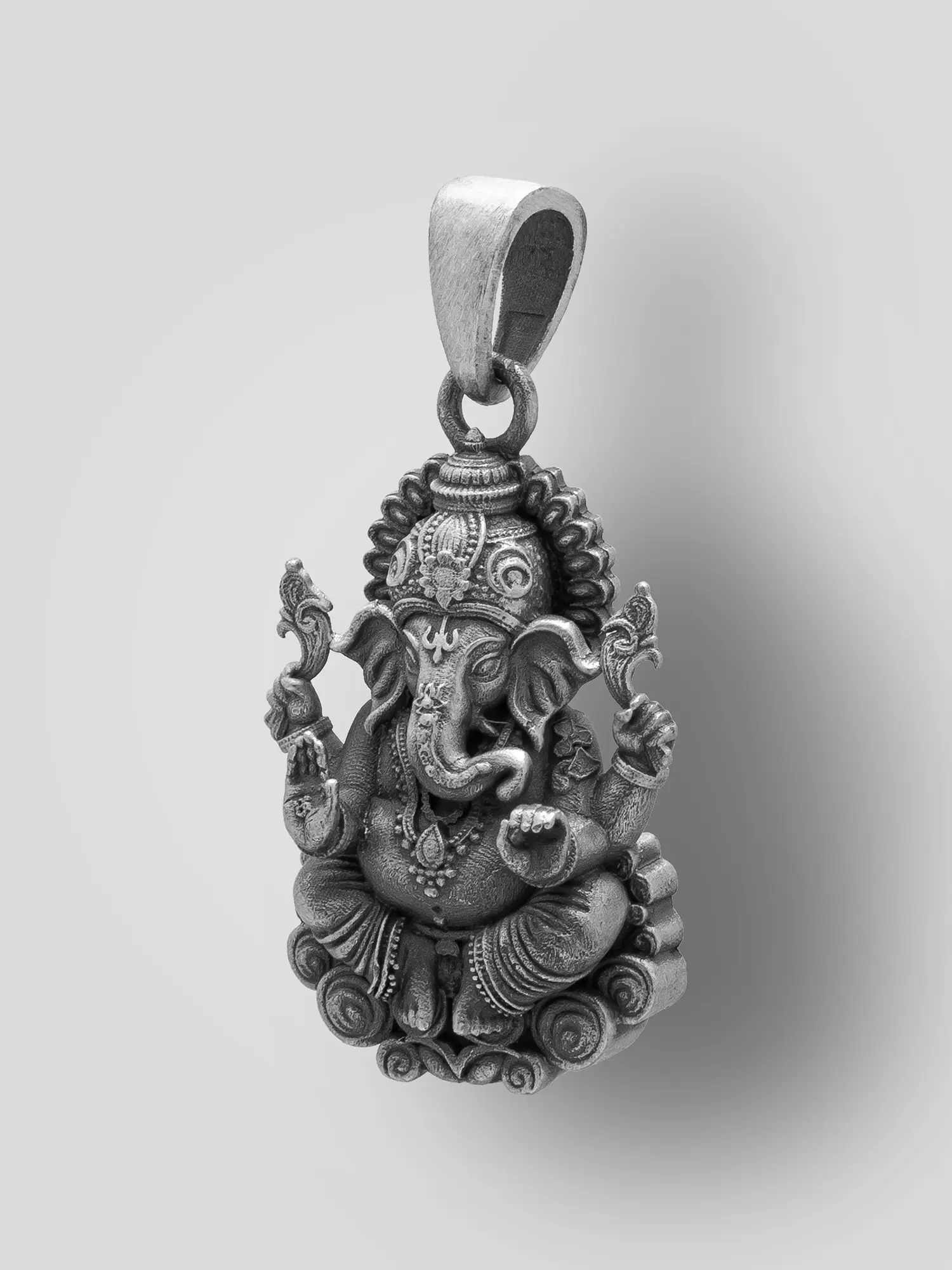 Meticulously fashioned from fine sterling silver, this pendant showcases a detailed depiction of Ganesha, seated in a pose of tranquility and grace. The intricate detailing brings the deity to life, from the folds of his garments to the delicate features of his face. The durable sterling silver construction ensures that this is a piece you can cherish for years to come. The pendant's design captures the essence of Ganesha, symbolizing his role as the patron of arts and sciences. He is a powerful symbol of new beginnings.