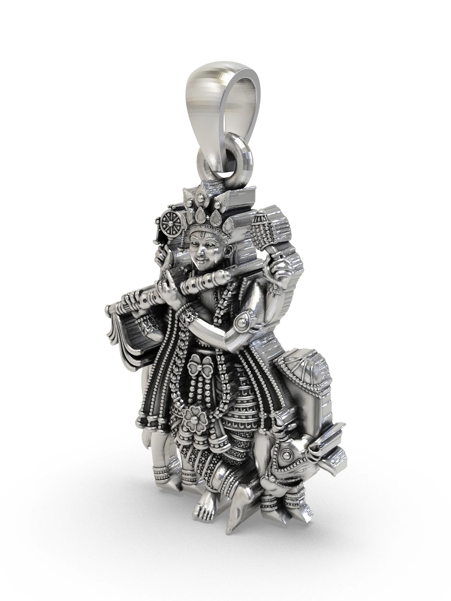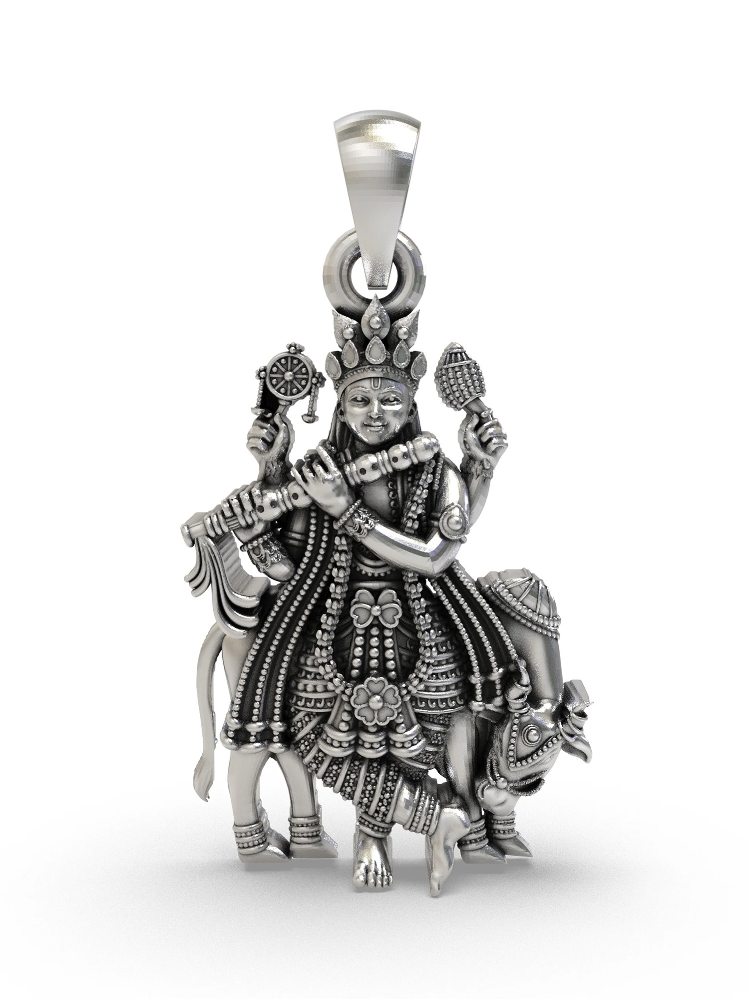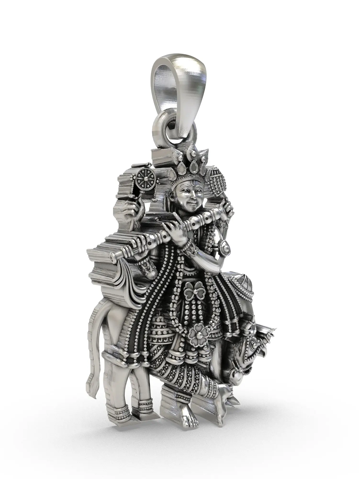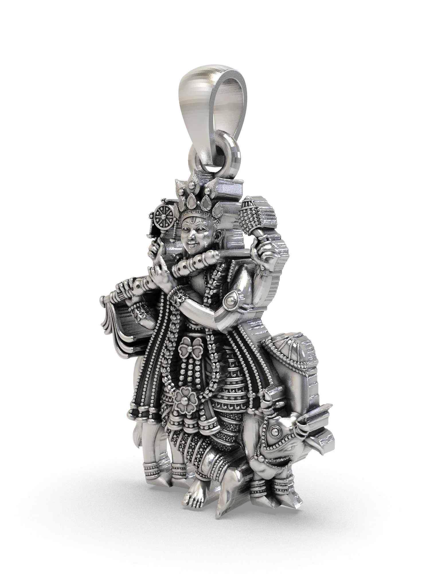 This exquisite pendant captures the divine essence of Lord Krishna in his form as Venugopala, the divine cowherd. Crafted from lustrous sterling silver, this piece is a testament to intricate artistry and spiritual devotion. The pendant depicts a captivating tableau, with Lord Krishna standing gracefully beside a calf, a symbol of his nurturing and protective nature. His four arms are adorned with auspicious objects, each carrying profound meaning. In two hands, he plays the enchanting melody of his flute, the Bansuri, believed to captivate the hearts of all beings. Another hand holds the Sudarshana Chakra, the discus of divine retribution and cosmic order, while the fourth grasps a mace, representing strength and authority.