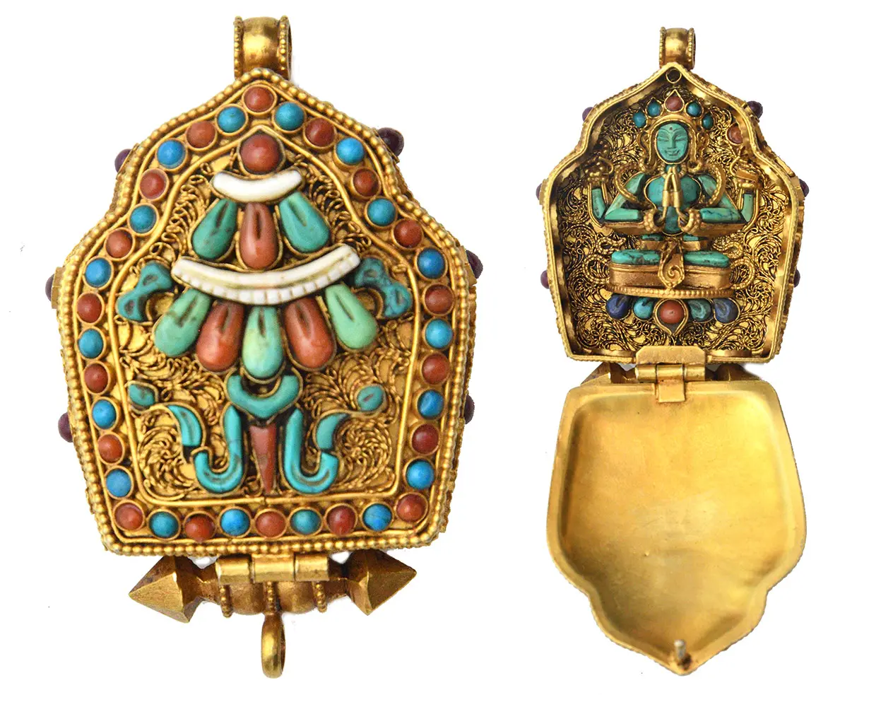 In Nepalese culture jewellery holds a significant place in evaluating people’s dresses, spirituality and life; it is worn not only as a style statement but also like an amulet having its unique properties. This pendant holds a great auspicious content as the presence of three semi-precious stones of Coral, Turquoise and Lapis Lazuli forming an authentic umbrella (parasol) at the front side of the lid and representing one of the eight Ashtamangala signs, symbolic of protecting beings from harmful forces and illness with a temple shaped border and superfine work at the base.