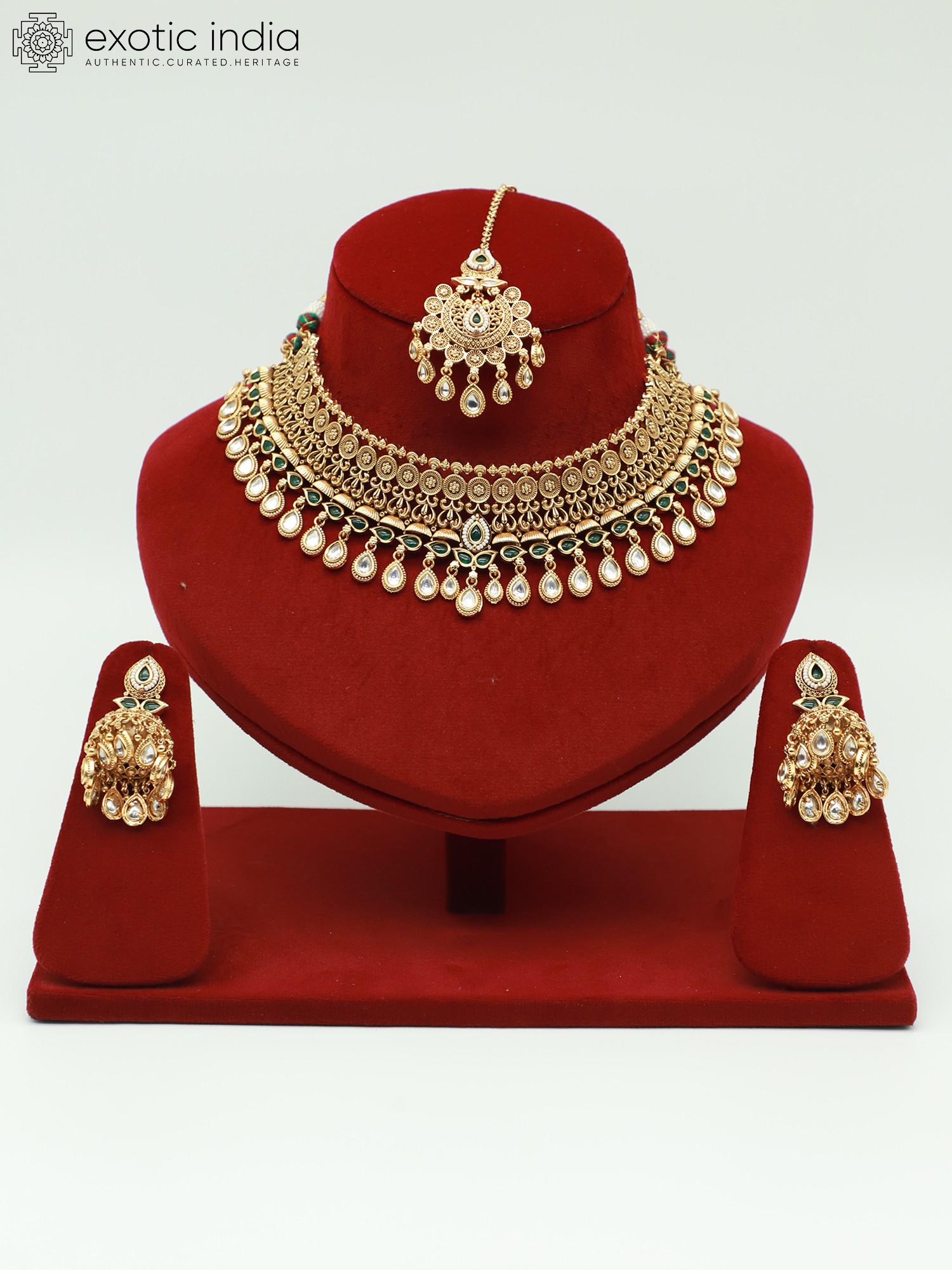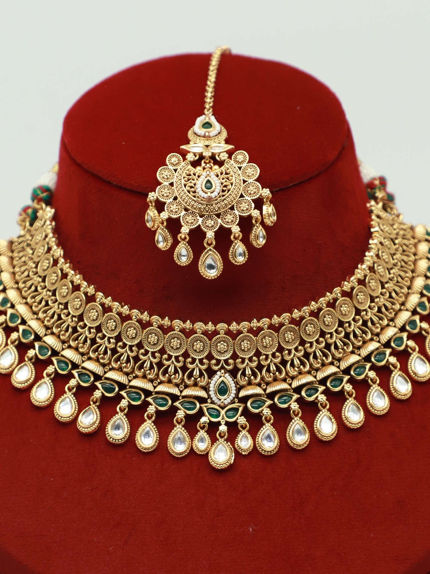 Embellished Carving Necklace Set With Attractive Mangtika And Earrings