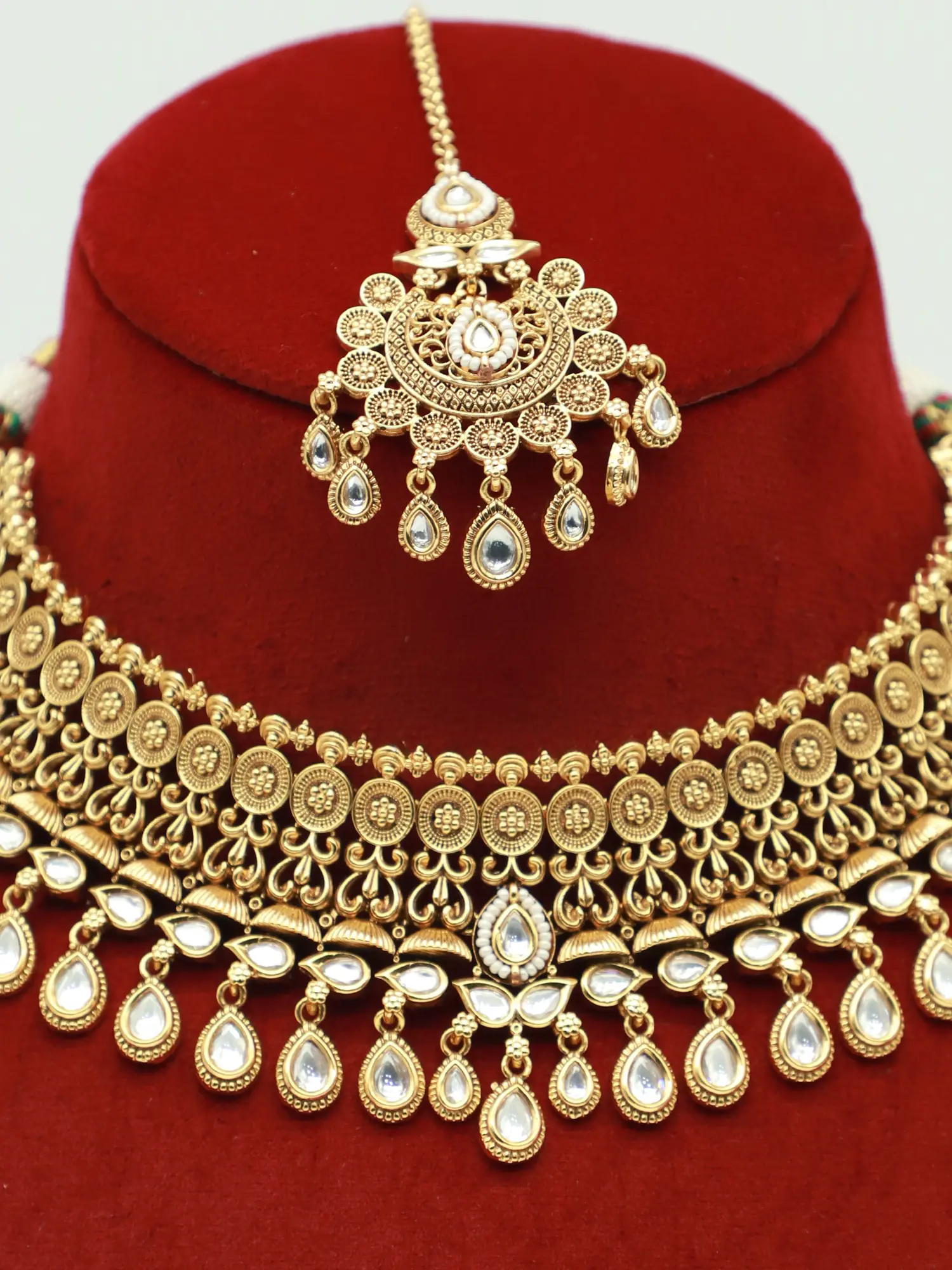 Stunning Stone Studded Heavy Choker Necklace With Matching Earrings And Mangtika