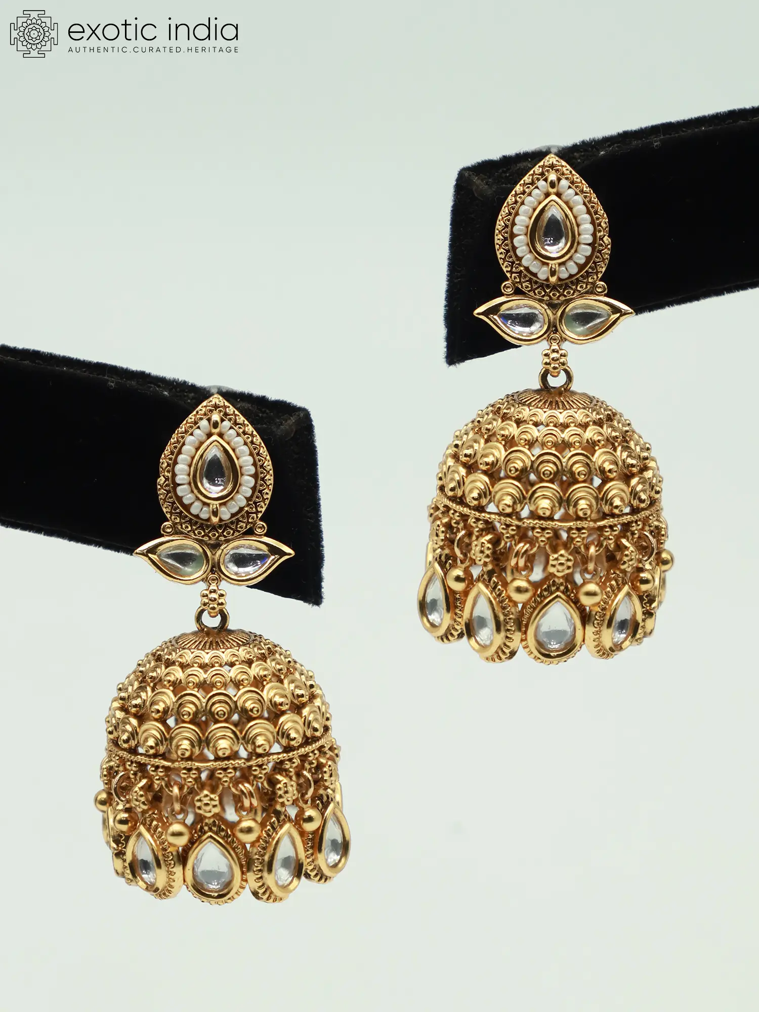 Attractive Kundan Stone Necklace Set In Brass With Mangtika And Hanging Beads Earrings For Bride