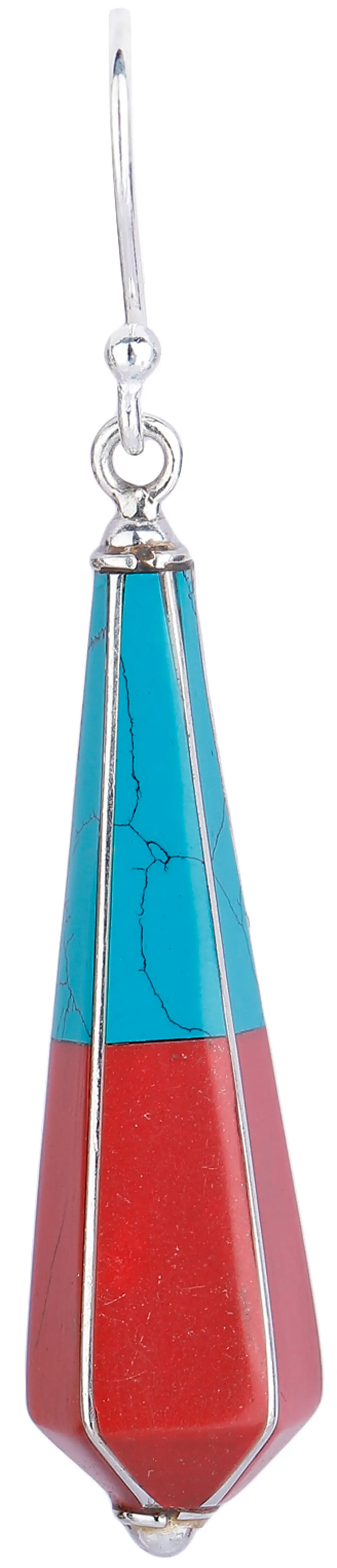 The heart of these exquisite earrings lies in their stunning combination of colors. A vivid turquoise hue graces the upper portion of the cone, reminiscent of clear desert skies or tranquil ocean waters. This captivating blue is perfectly complemented by a rich, earthy red that adorns the lower section, evoking the warmth of terracotta or a sunset's glow. The interplay between these two distinct colors creates a visually arresting contrast, making these earrings a true statement piece. Each stone is carefully selected and meticulously inlaid, showcasing the natural beauty and unique character of the materials. Subtle, intricate crackling within the turquoise adds an organic depth and a hint of authentic character, promising a one-of-a-kind aesthetic.