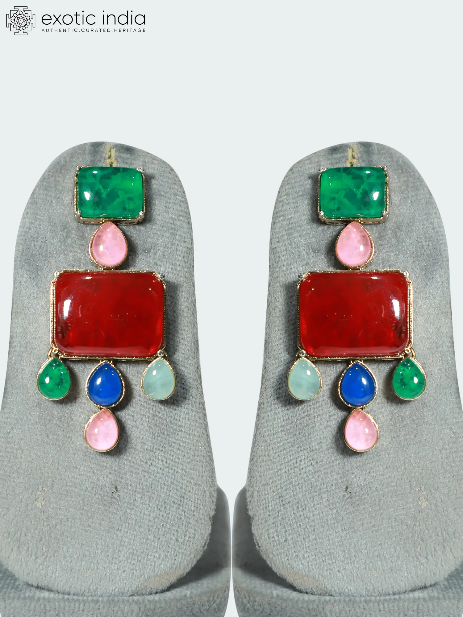 This breathtaking necklace set is a true masterpiece, meticulously crafted to capture the essence of Indian artistry. The vibrant hues of the stones, the intricate Kundan work, and the rich copper base combine to create a piece that is both elegant and captivating. It's perfect for adding a touch of regal splendor to any occasion, whether it's a wedding, a festive celebration, or a special evening out. Each element has been carefully selected and placed to ensure a harmonious balance of color and design, resulting in a stunning visual experience.
