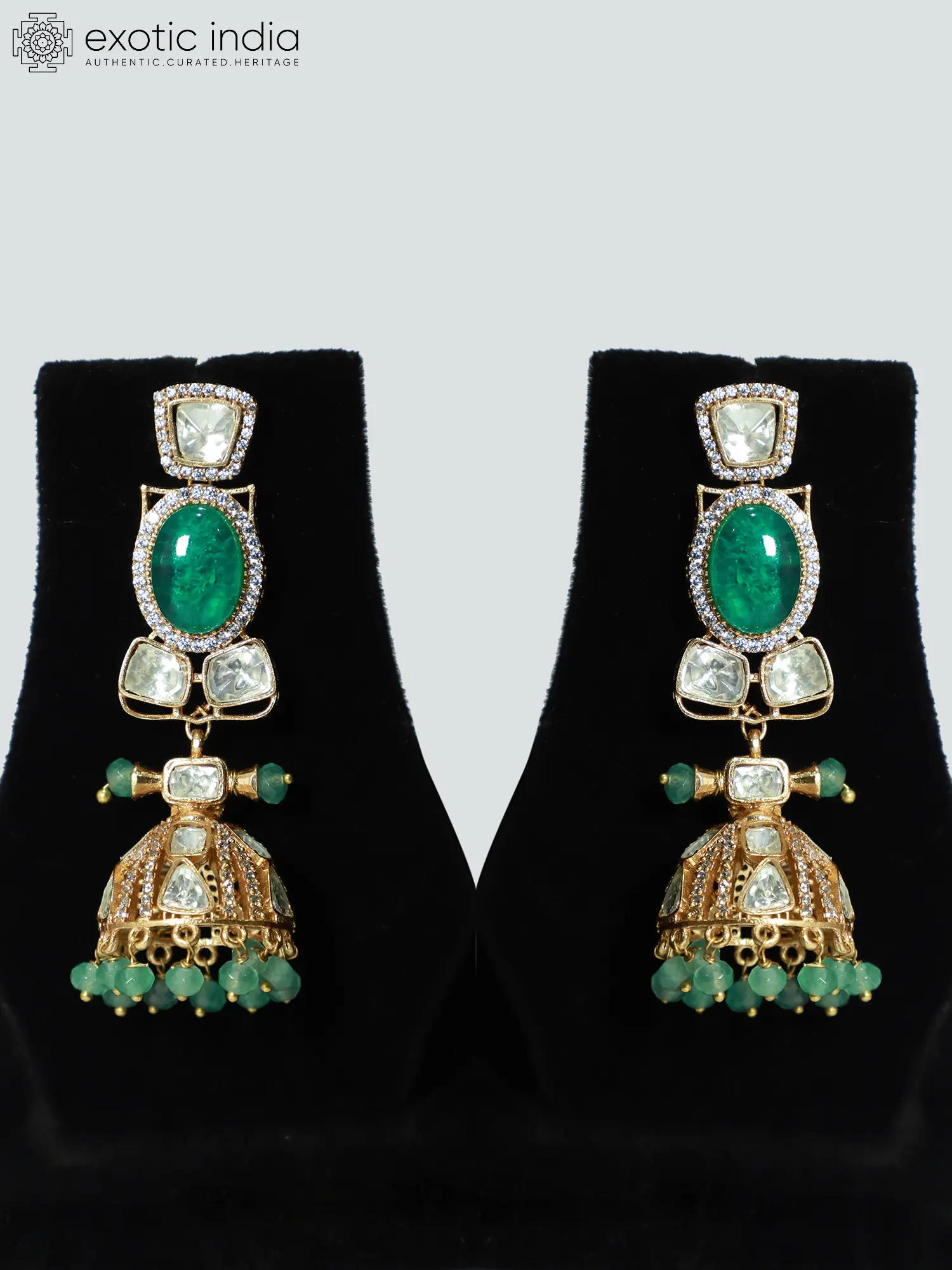The exquisite necklace is further enhanced by a pair of matching earrings, equally rich in detail and charm. These 2.2-inch high by 1-inch wide earrings mirror the necklace's design elements, featuring the same striking combination of emerald green and white Kundan. The jhumka (bell-shaped) design adds a touch of traditional grace, creating a cohesive and visually stunning ensemble. The earrings dangle delicately, adding a subtle movement and captivating shimmer that perfectly complements the necklace.