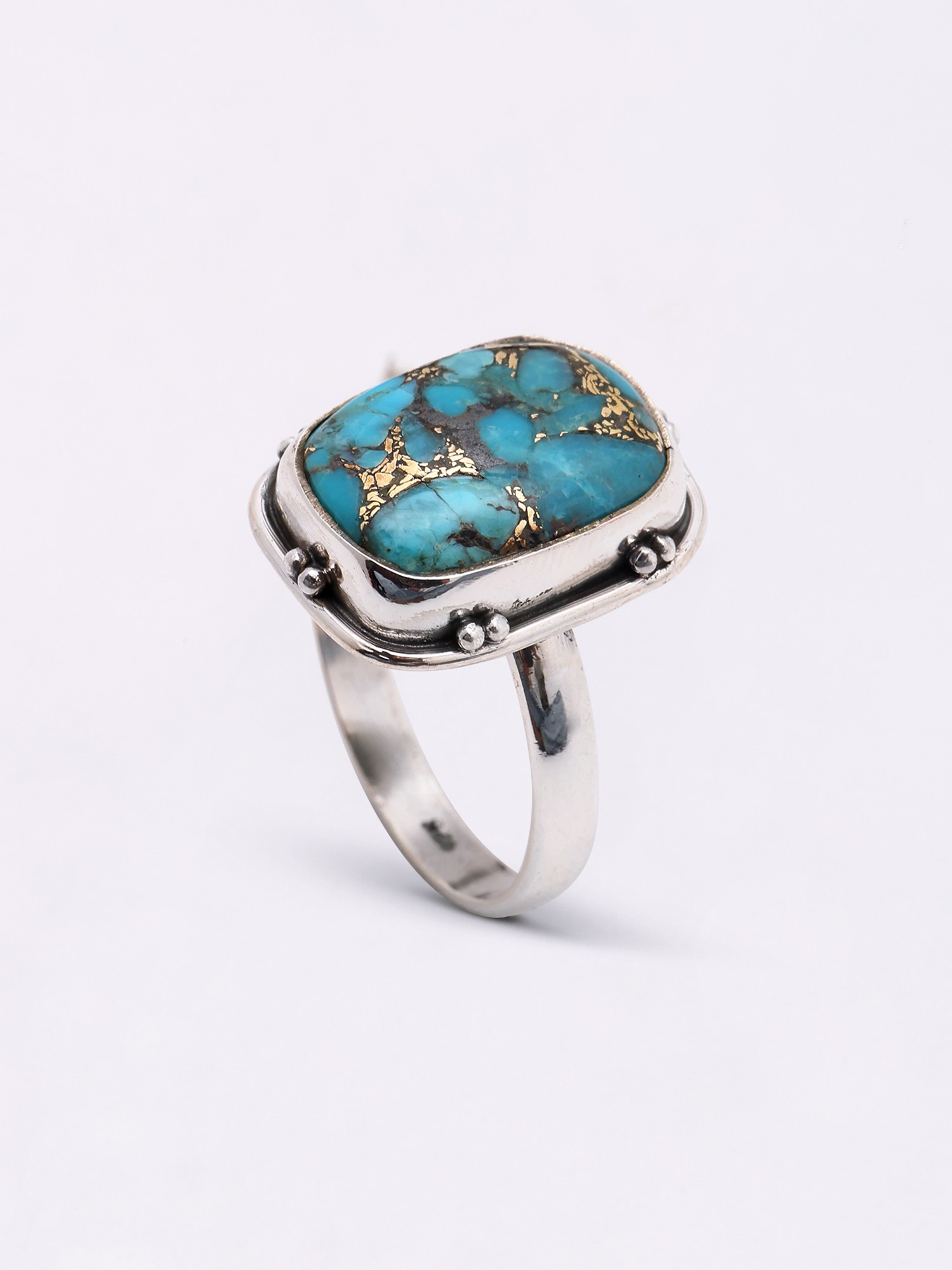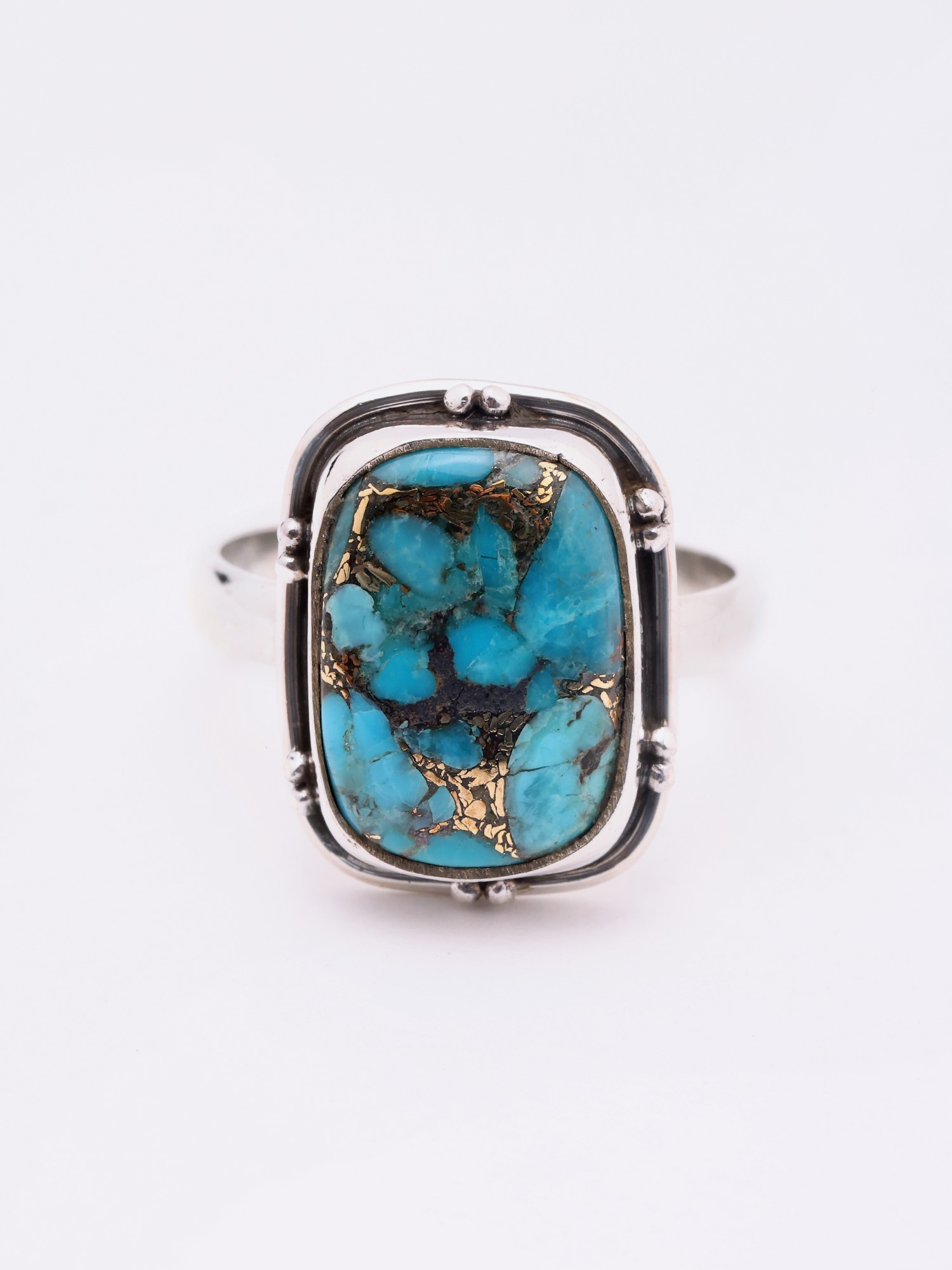 The gemstone is expertly set within a robust sterling silver band. Sterling silver, known for its durability and timeless appeal, provides a cool, lustrous contrast to the warm, rich tones of the copper turquoise. The setting itself is designed with meticulous attention to detail, featuring a subtly defined border and small, decorative bead accents that add a touch of artisanal charm. This combination of materials ensures not only a visually stunning piece but also a piece that is built to last and be cherished for years to come.