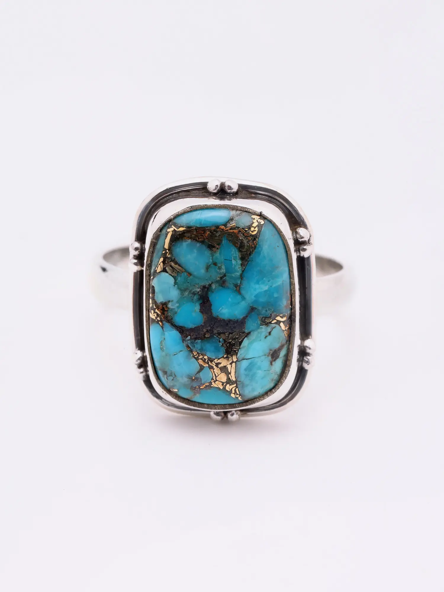 Discover a piece that brings the beauty of the earth to your fingertips. This exquisite ring features a captivating copper turquoise gemstone, showcasing a breathtaking mosaic of vibrant blues and earthy coppers. Each stone is unique, offering a one-of-a-kind pattern that tells its own geological story. The rectangular cut of the gemstone is precisely framed, enhancing its natural allure and creating a focal point that is both elegant and striking.