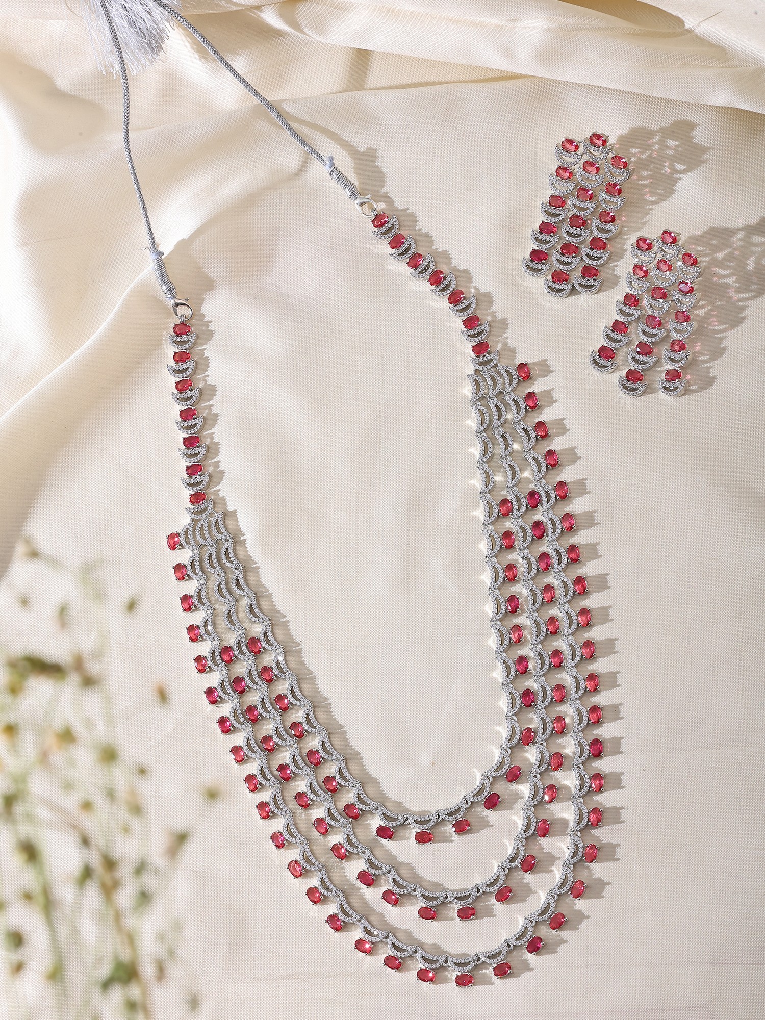 Multi-Strand Bridal Necklace Set with Square-Cut American Diamonds and Red Gemstones