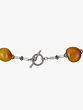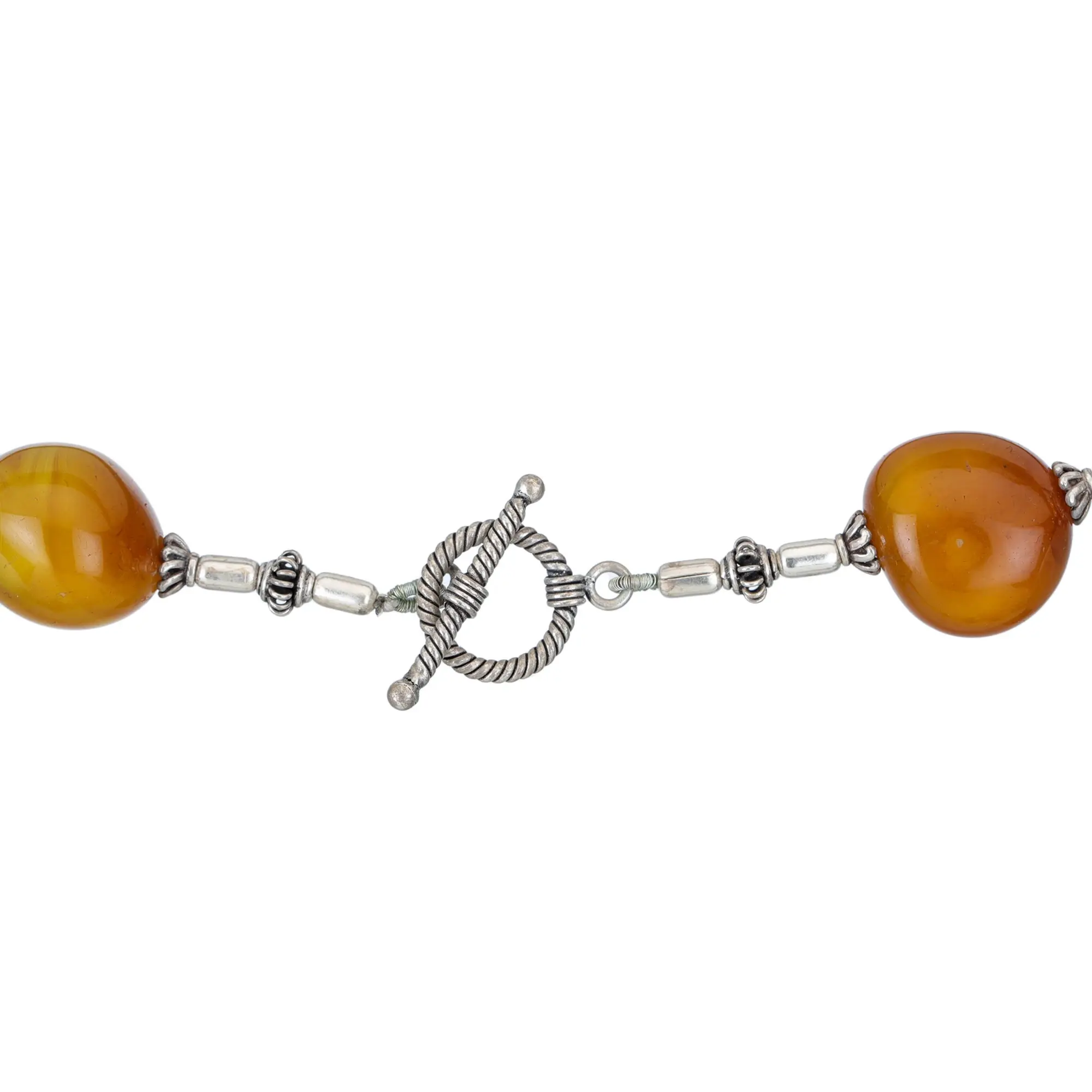 This necklace is a testament to skilled craftsmanship and attention to detail. Each chalcedony stone is securely held by intricately designed metalwork. These detailed elements not only provide a sturdy foundation for the gemstones but also contribute to the necklace's overall aesthetic appeal. The metalwork features a textured, vintage-inspired finish, evoking a sense of timelessness. The necklace is completed with a classic toggle clasp, ensuring both ease of wear and secure closure. The toggle clasp is not only functional, but adds to the overall aesthetic by blending with the metallic details within the piece.