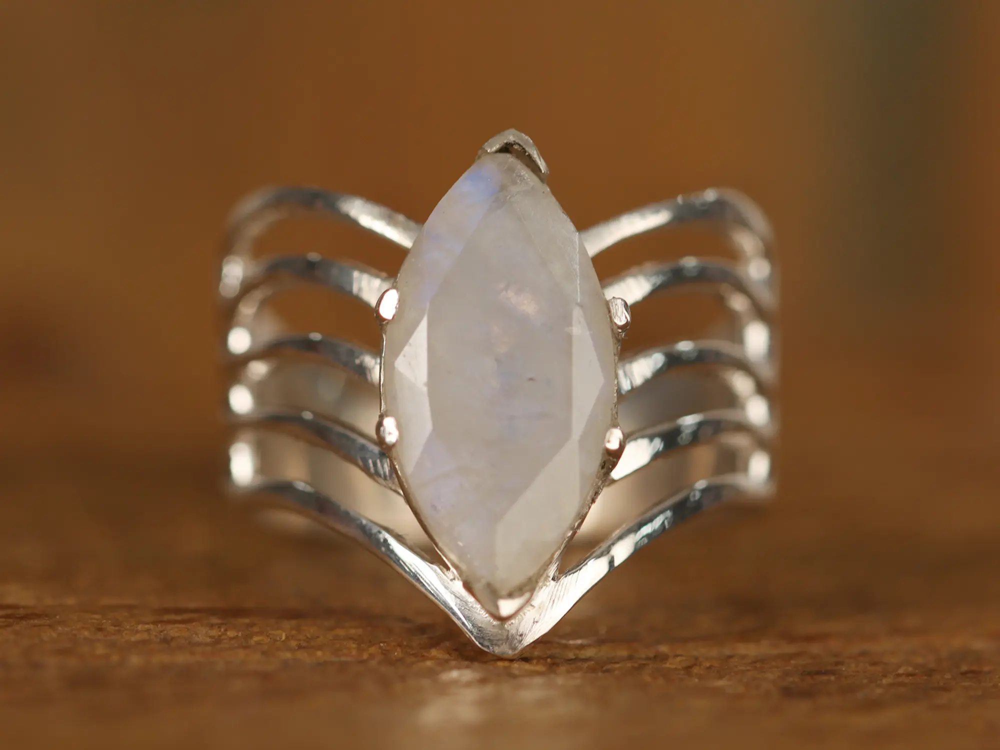 The cage design has become very popular due to its use in various forms of jewelry. It is a jaal design in the native language and looks elegant wherever used. This Designer Cage Ring with Stone is a sterling silver masterpiece that seamlessly embraces the beauty of the Jaal design. At its center, a luminous moonstone casts its ethereal glow, captivating with a serene radiance. The stone is embraced by a unique cage design, where lines of sterling silver delicately intertwine, forming an enchanting enclosure around the moonstone. This thoughtful arrangement creates a harmonious blend of celestial symbolism and contemporary chic.