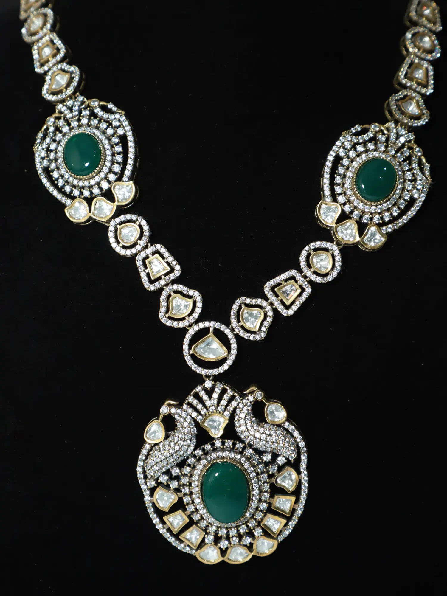 The necklace features a graceful design with intricately crafted pendants and a delicate chain. Three stunning circular Kundan stone accents punctuate the necklace, each a captivating splash of emerald green. These gemstones are masterfully nestled within a halo of sparkling white stones, creating a mesmerizing play of light and shadow. The pendant itself is a showstopper, featuring a captivating peacock motif embellished with the same exquisite Kundan stones.