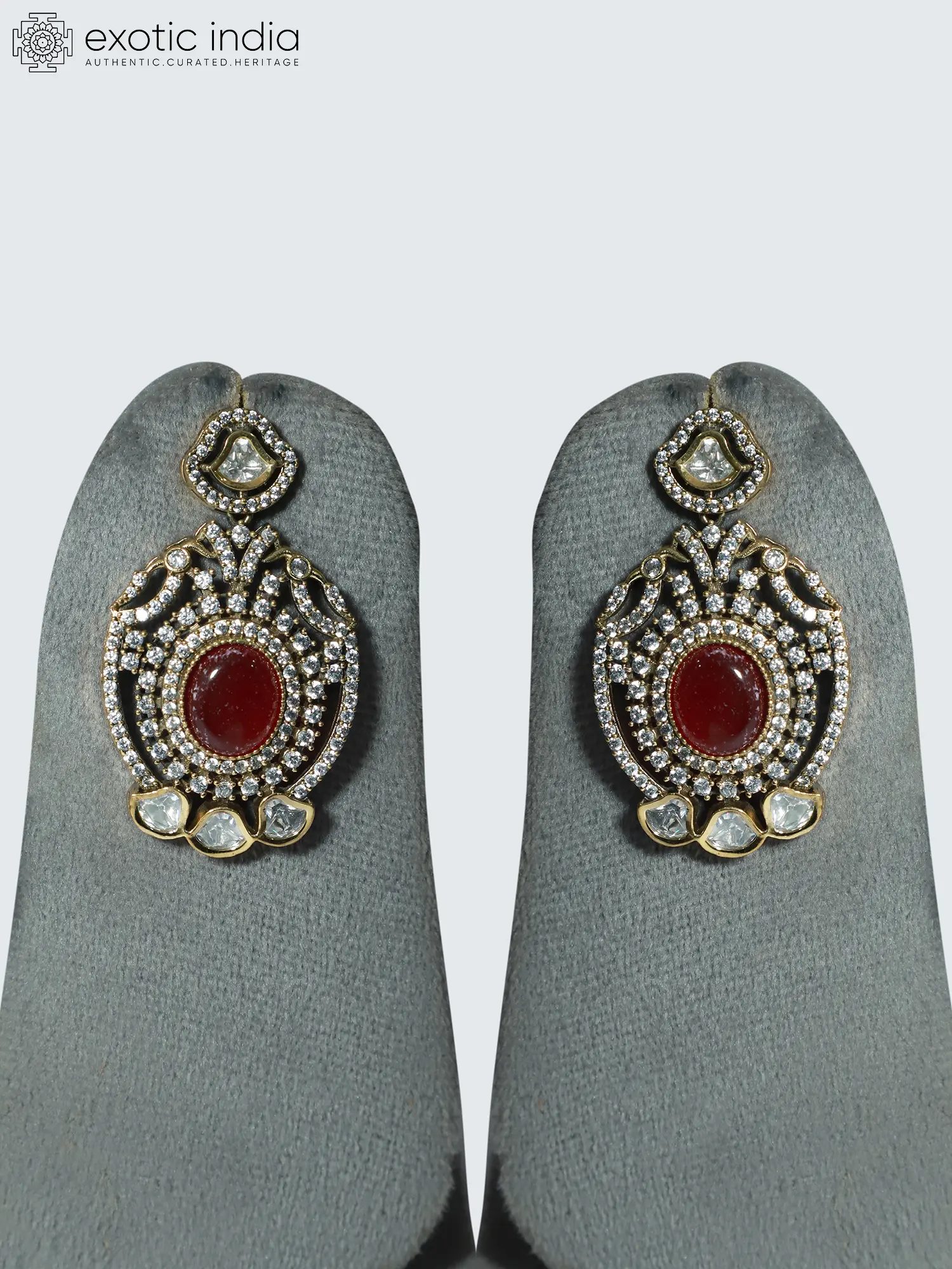 The matching earrings perfectly complement the necklace, echoing its design elements in miniature. Each earring features a similarly crafted circular Kundan stone centerpiece, surrounded by a brilliant array of white stones, ensuring your look is cohesively stunning. Their petite yet powerful design ensures they effortlessly catch the light, adding a touch of brilliance to any outfit.