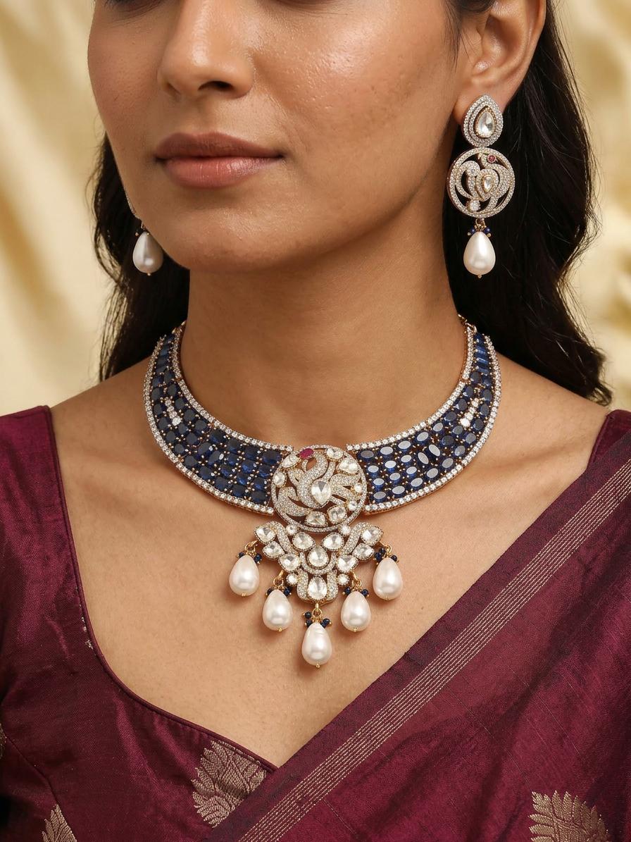 Polki Kundan Stone Studded Necklace and Earrings Set with Pearl Drop