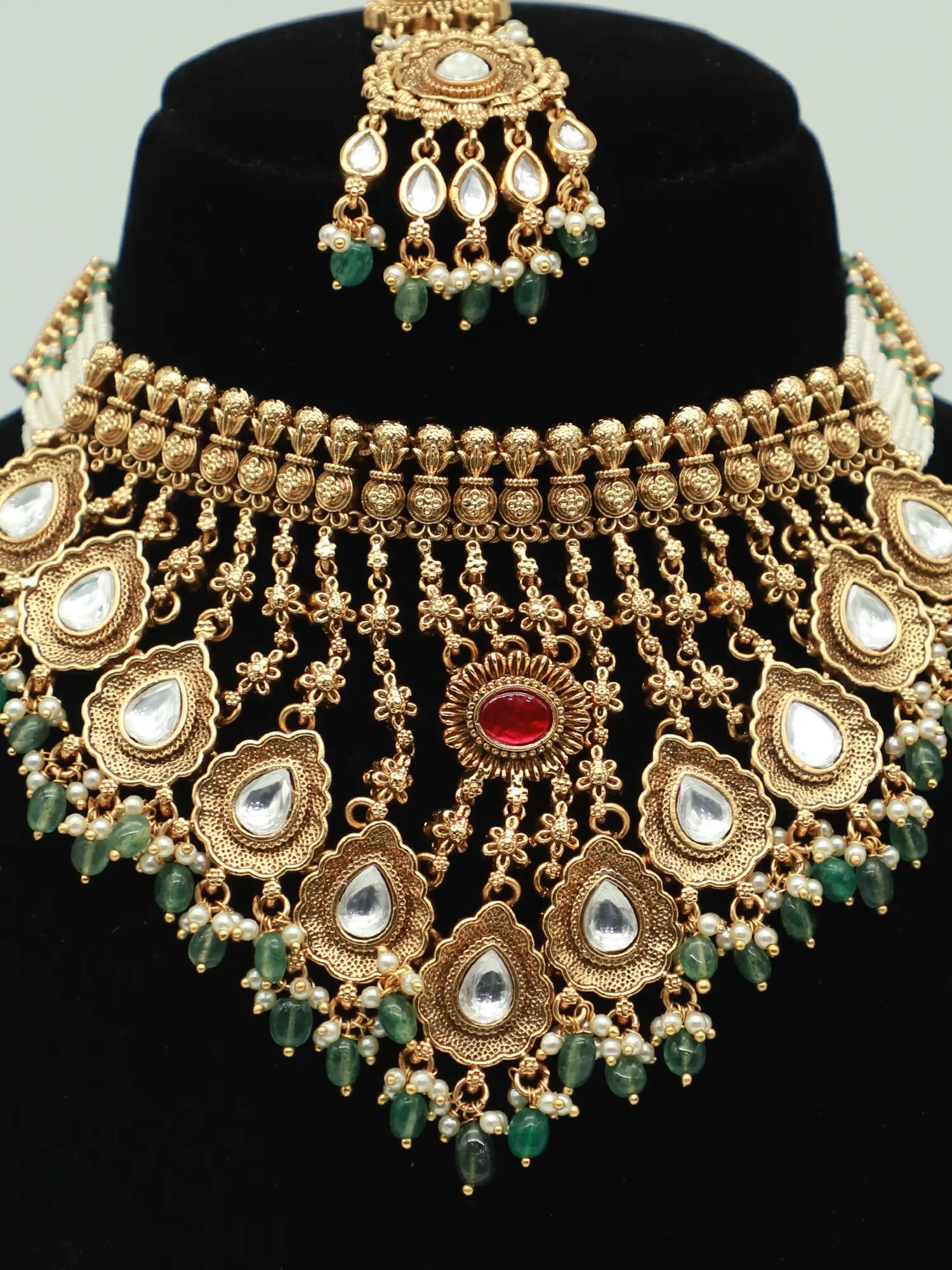 Envision yourself adorned in a piece that resonates with timeless elegance and traditional charm. This exquisite jewelry set is designed to elevate your bridal look, adding a touch of regal splendor to your special day. It's a statement of sophisticated style, perfect for the bride who appreciates intricate detailing and classic design. The set consists of a stunning necklace, a pair of complementary earrings, and a matching mangtika, all crafted with meticulous attention to detail. The overall design speaks of heritage and grace, making it an ideal choice for traditional wedding ceremonies and celebratory events.