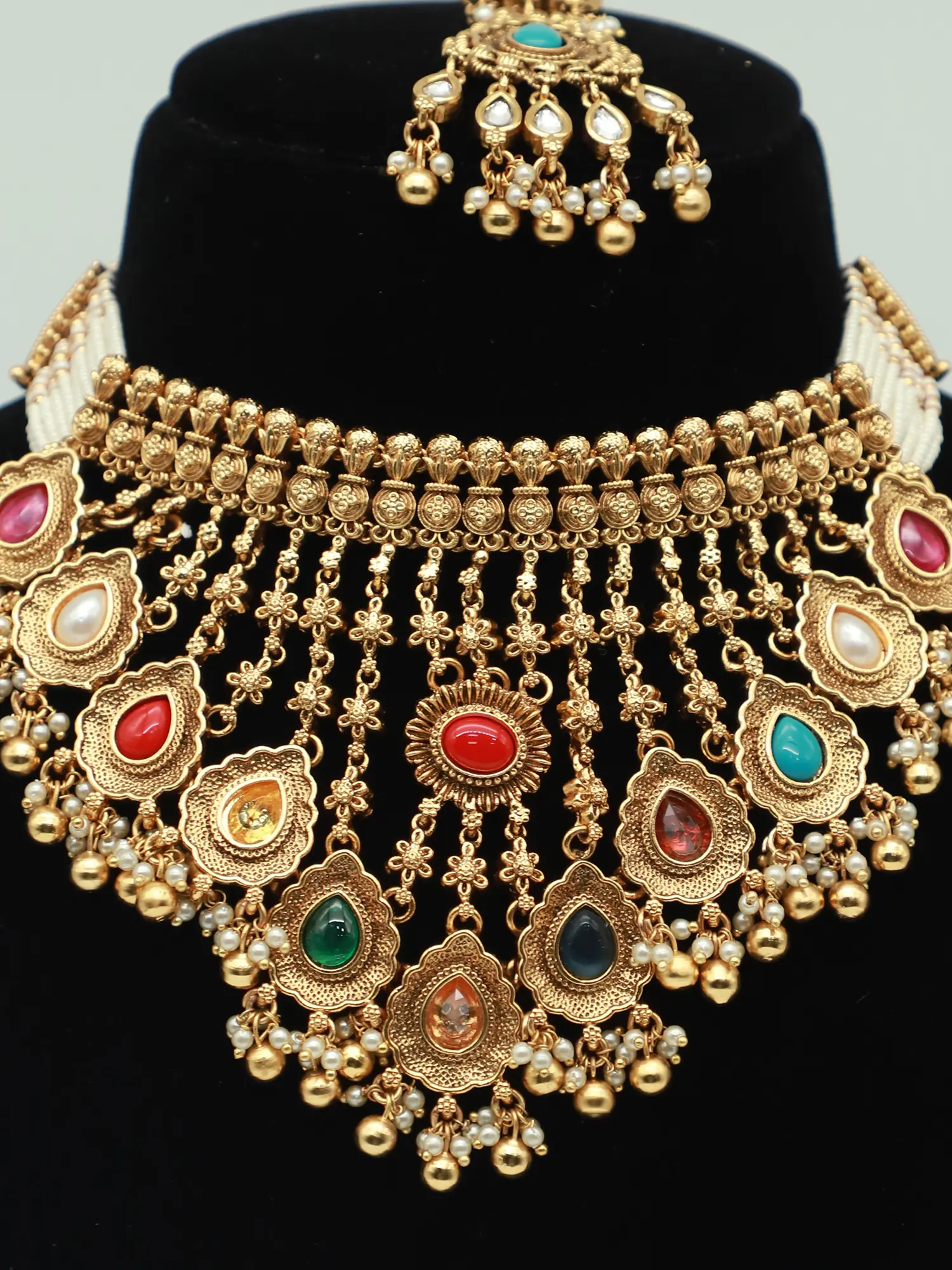 The necklace features a captivating arrangement of meticulously set accents, creating a captivating focal point. The design is enhanced by delicately hanging beads that add movement and a touch of whimsy to the overall look. The earrings echo the necklace's design, featuring similar ornate elements and hanging accents, creating a harmonious balance. The mangtika, designed to adorn the forehead, completes the ensemble, adding a final touch of regal beauty. The brass-based construction ensures durability and longevity, so you can treasure this set for years to come. While sturdy, the craftsmanship is detailed and refined. This jewelry set is more than an accessory; it's a timeless keepsake that will remind you of your most cherished moments. It is the perfect way to complete your look for your special day!