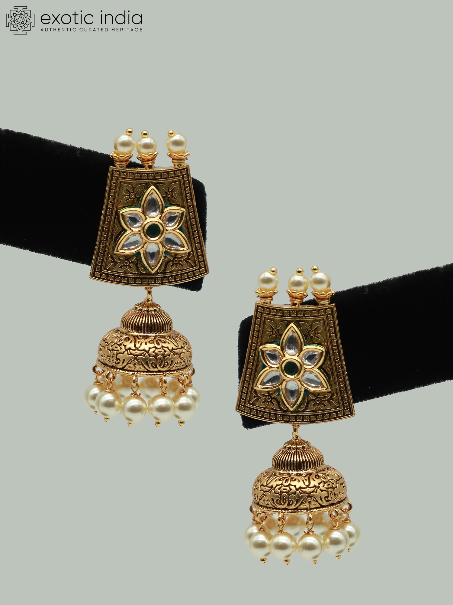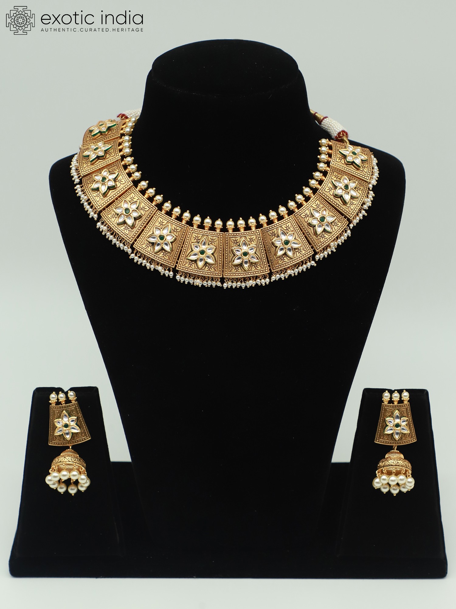 This stunning set showcases the skill of master artisans. The necklace is composed of intricately designed elements, each adorned with delicate carvings that create a mesmerizing visual texture. The earrings perfectly complement the necklace, echoing the same intricate details and design themes, ensuring a harmonious and elegant look. The shimmering of pearls, artfully arranged, provides a graceful contrast, enhancing the overall appeal and adding a touch of femininity.