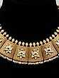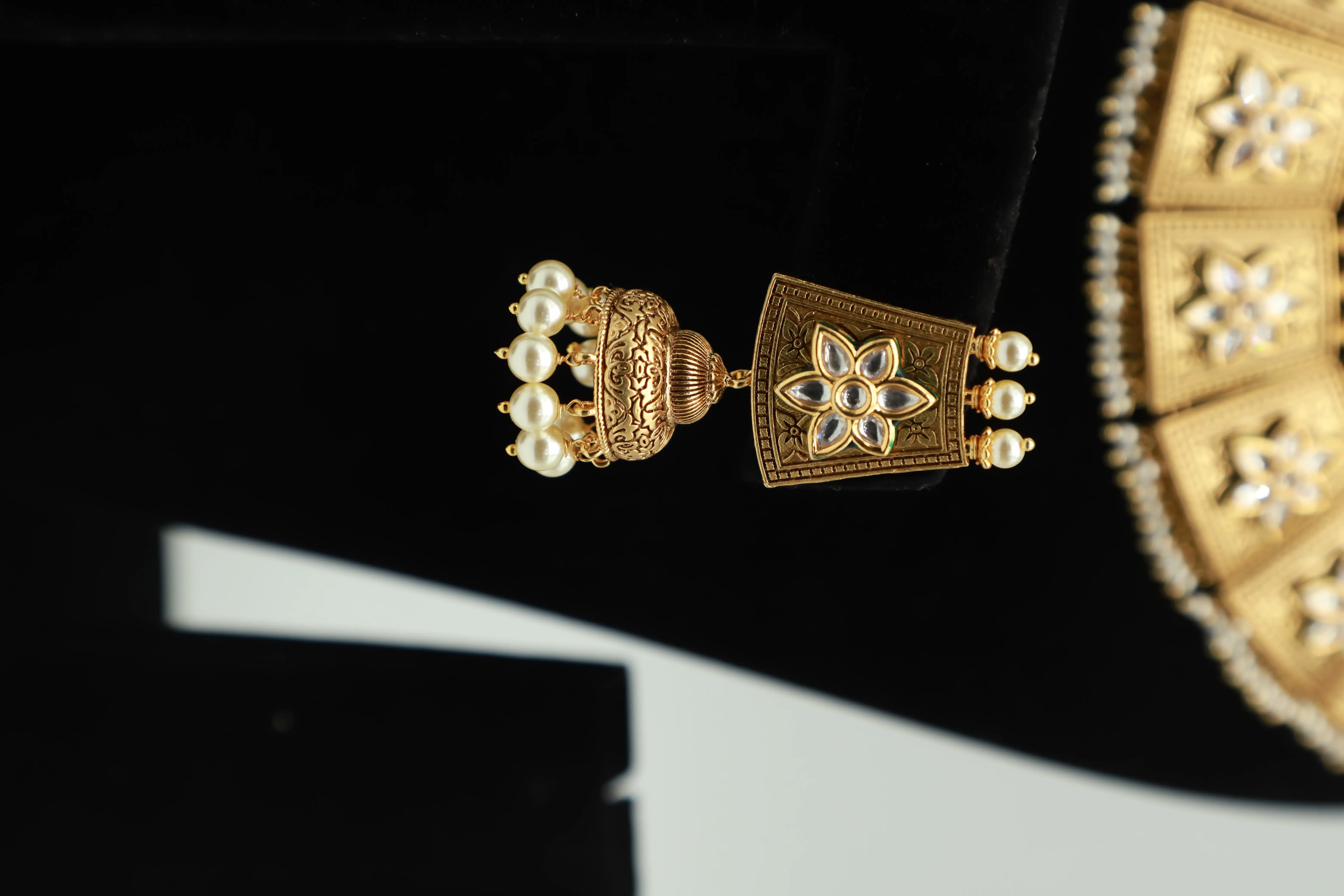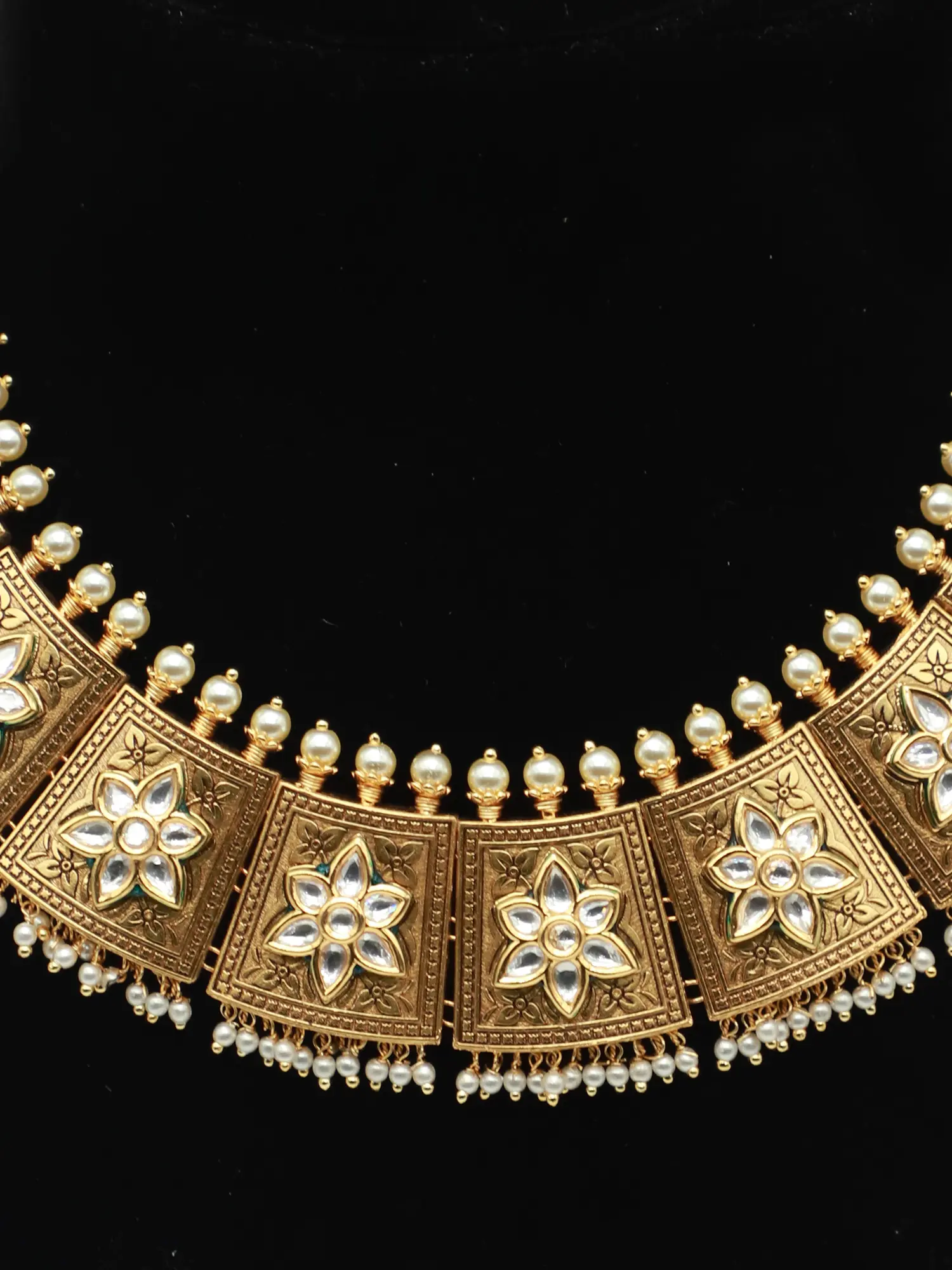 Elevate your ensemble with this captivating necklace set, a perfect blend of traditional artistry and contemporary design. This set isn't just jewelry; it's a statement piece that radiates sophistication and elevates any outfit. The matte finish adds a touch of understated luxury, making it versatile enough for both formal occasions and adding a touch of glamour to everyday wear. Every detail is carefully crafted to capture the essence of timeless elegance.