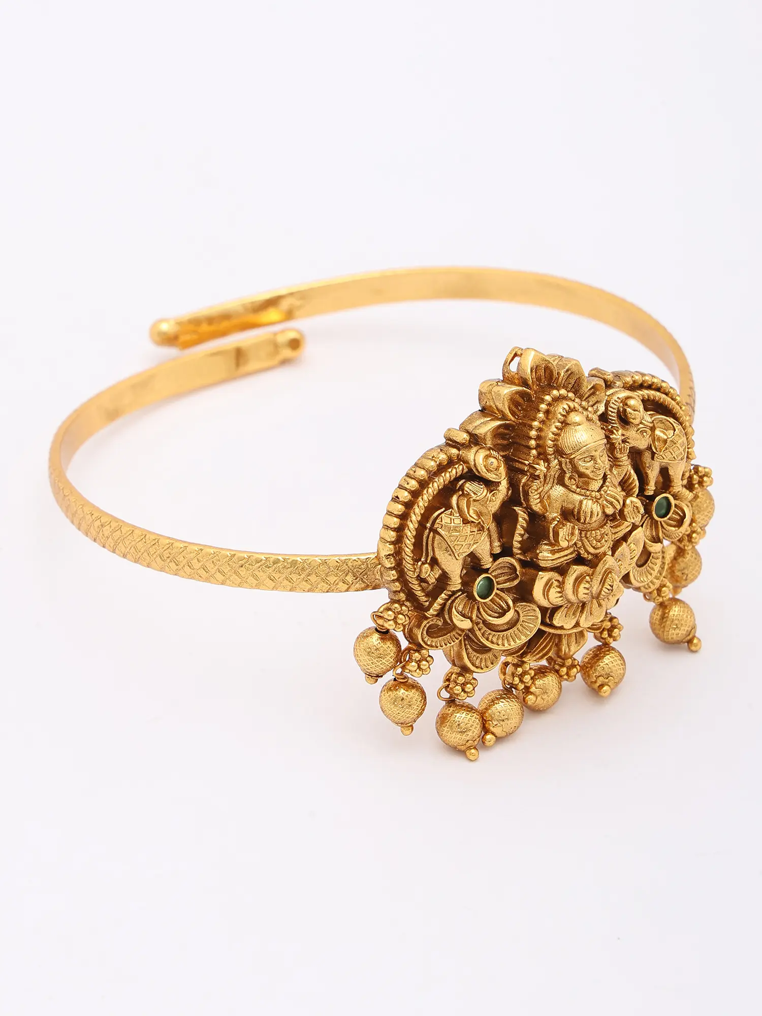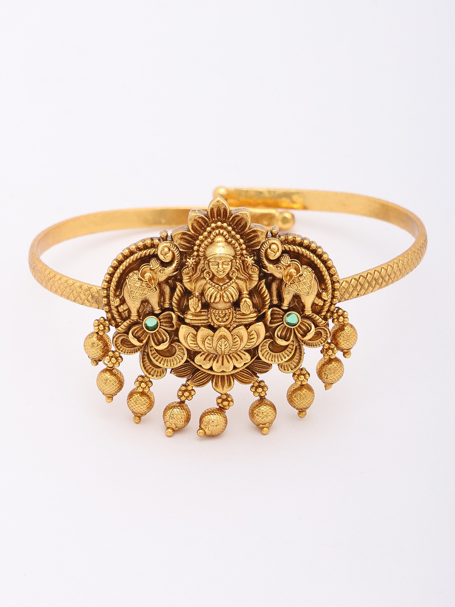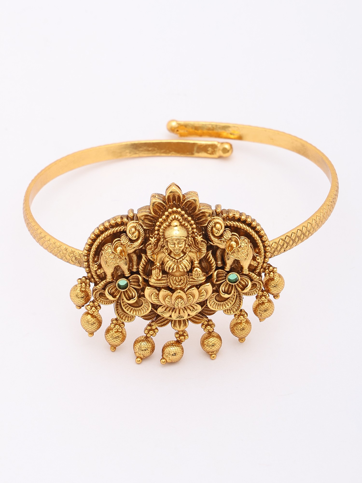 Drawing inspiration from ancient Indian traditions, this armlet pays homage to Goddess Lakshmi, the deity of wealth, prosperity, and auspiciousness. The recurring symbolism of the lotus, a symbol of purity and spiritual growth, further imbues this piece with profound cultural significance. Wearing it is like carrying a piece of history and devotion with you.