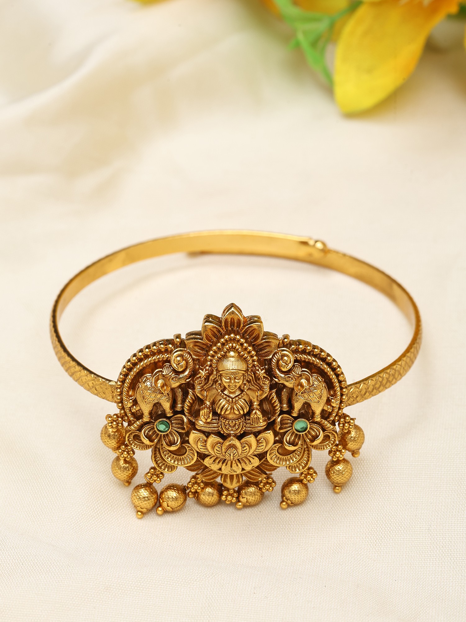 The central motif features a serene deity, flanked by majestic elephants, symbols of strength and good fortune. Lush lotus flowers bloom around the divine figure, with delicate beaded dangles cascading gracefully, creating a captivating interplay of light and shadow. The adjustable band ensures a comfortable and secure fit, designed to rest elegantly on your arm, with the centerpiece measuring an impressive 1.75 inches in height.