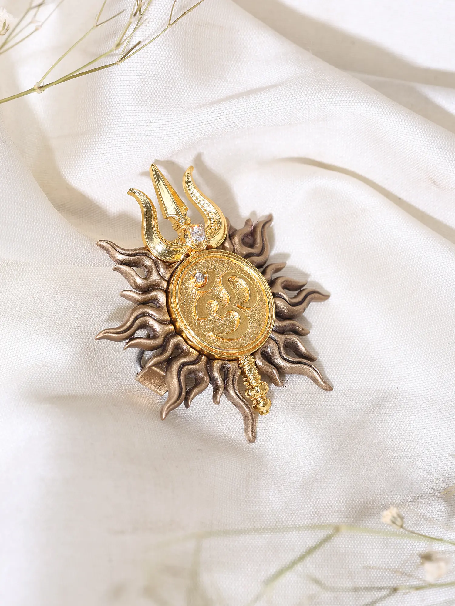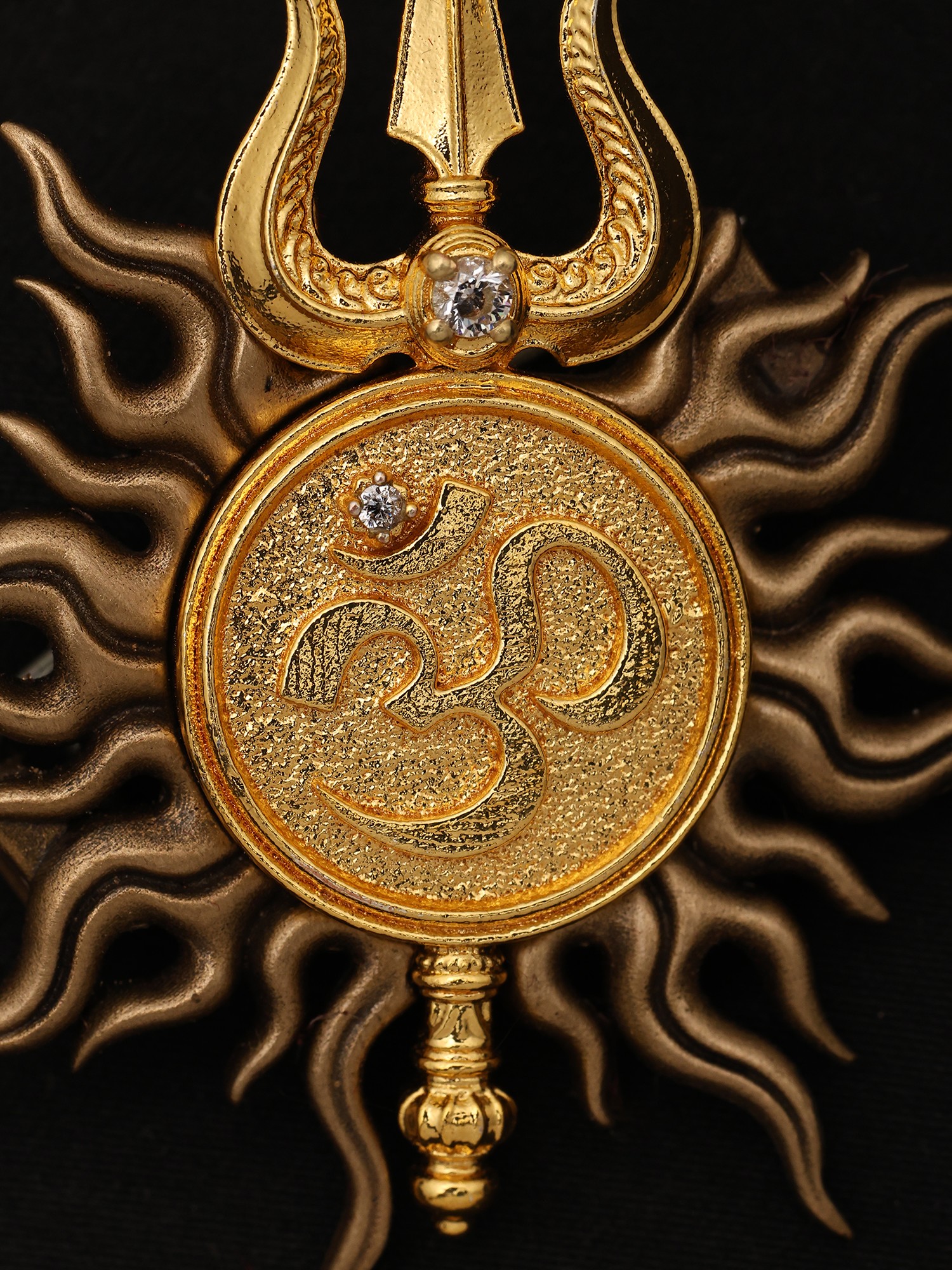 You'll notice the arresting visual harmony of the sun's radiant aura encircling a central disc, upon which the sacred 'Om' symbol is etched with remarkable clarity. Topped by the iconic trident, representing Shiva's divine power, the piece is further accented by subtle, brilliant inlays. Its dimensions, measuring precisely 1.65 inches in height and width, create a perfectly balanced focal point that is neither overwhelming nor understated.