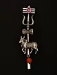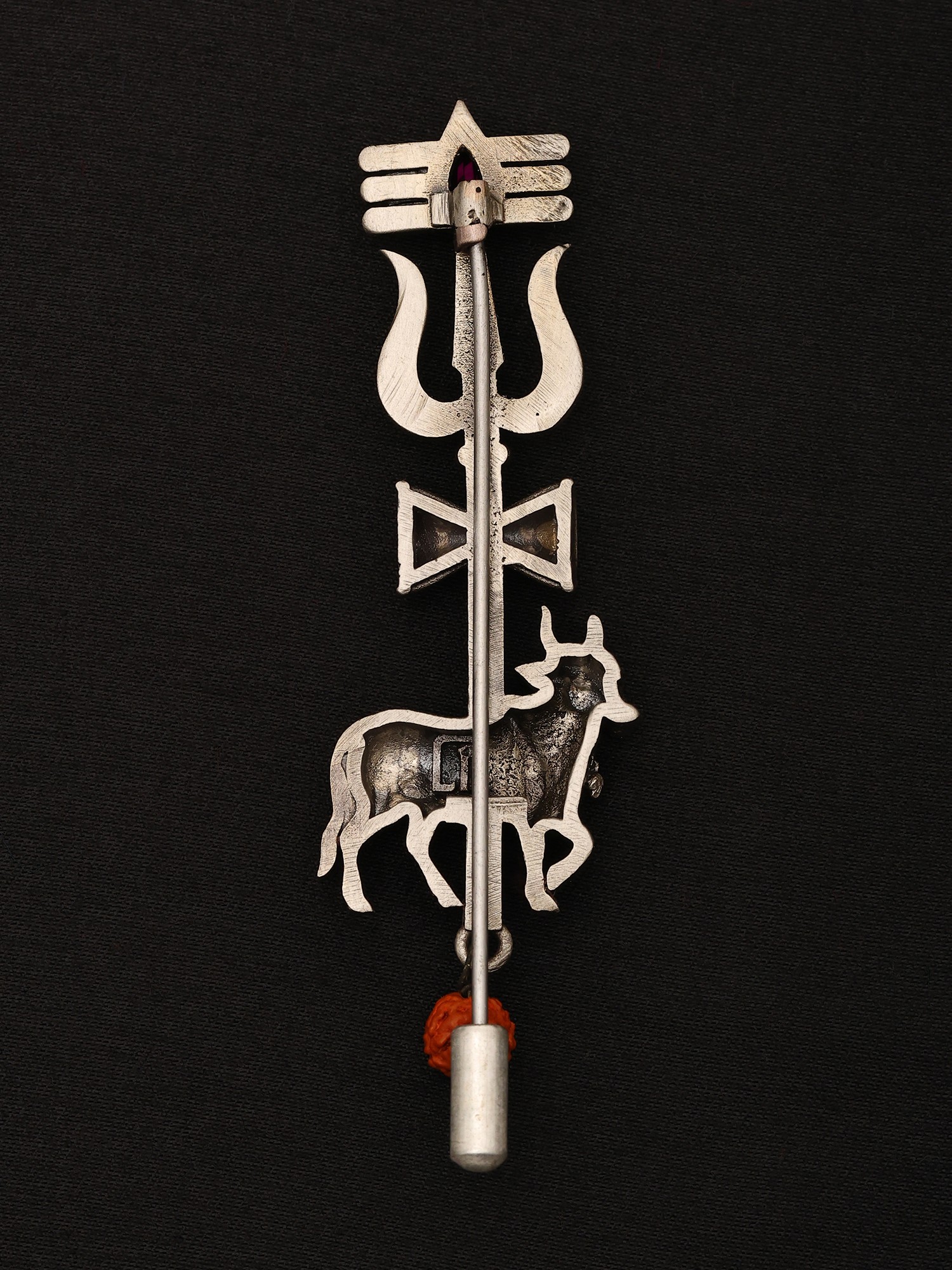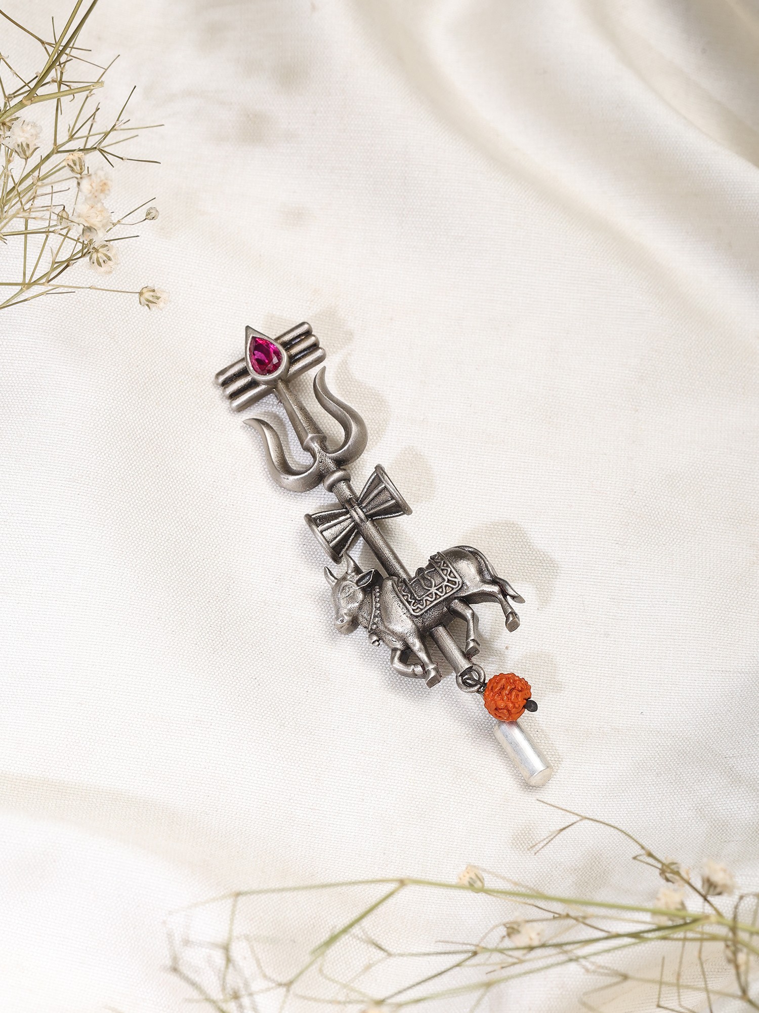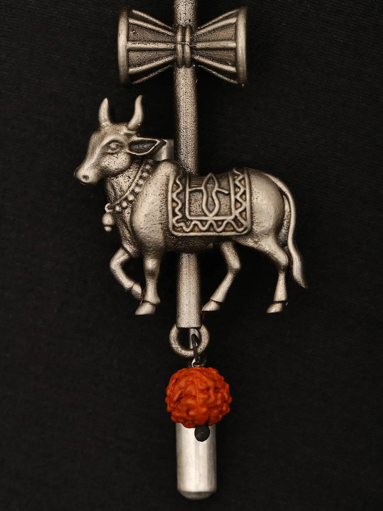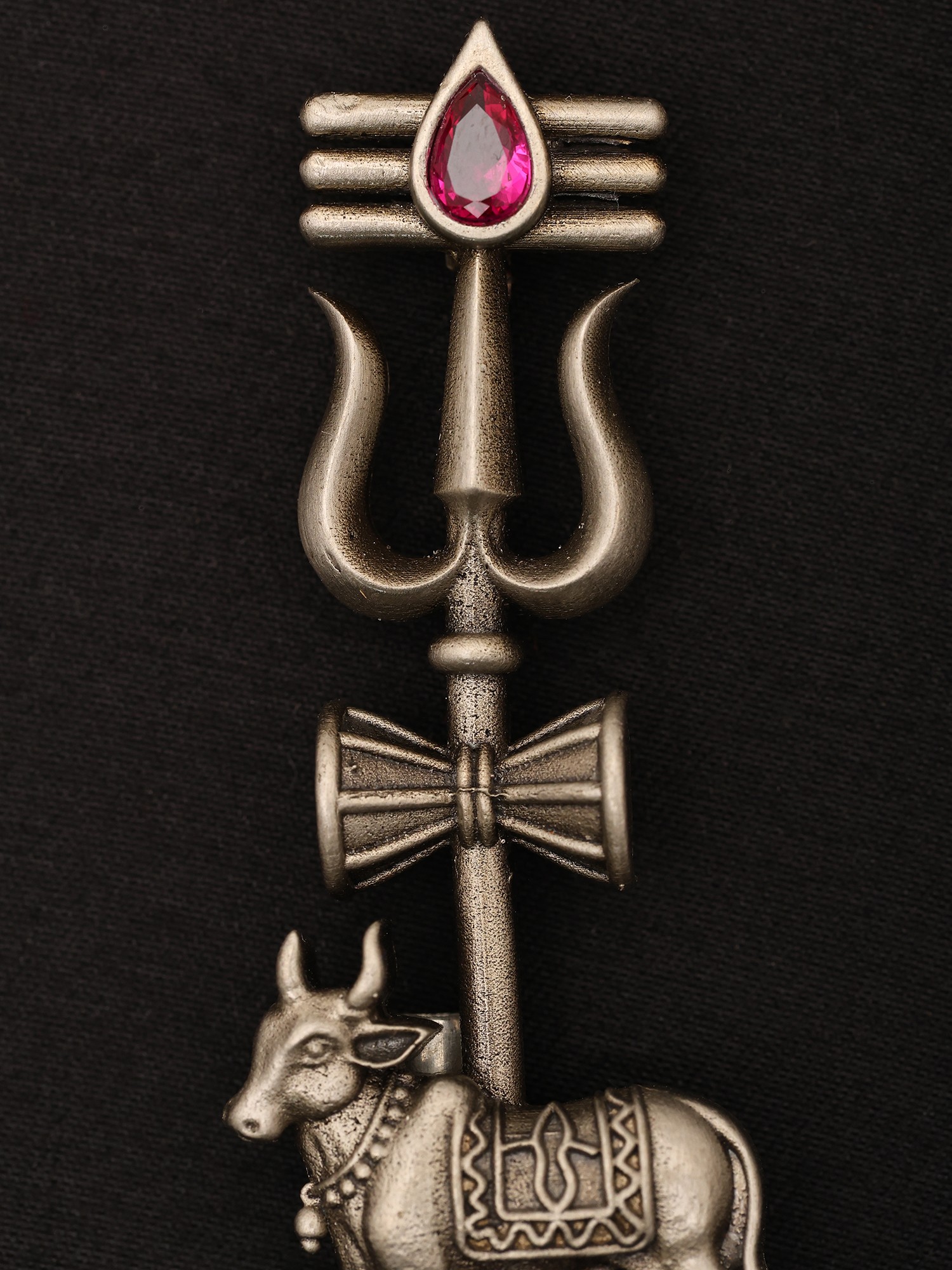 The design features a striking depiction of the Trishul, Lord Shiva's sacred weapon, topped with a vibrant crimson stone that catches the light with every movement. Below, the noble Nandi, Shiva's devoted vahana, is rendered with remarkable fidelity, complete with a finely detailed saddle. Suspended at the base, a genuine Rudraksha seed adds an authentic touch, embodying natural spirituality. This piece stands 2.85 inches tall and measures 0.75 inches wide, a commanding yet elegant presence.