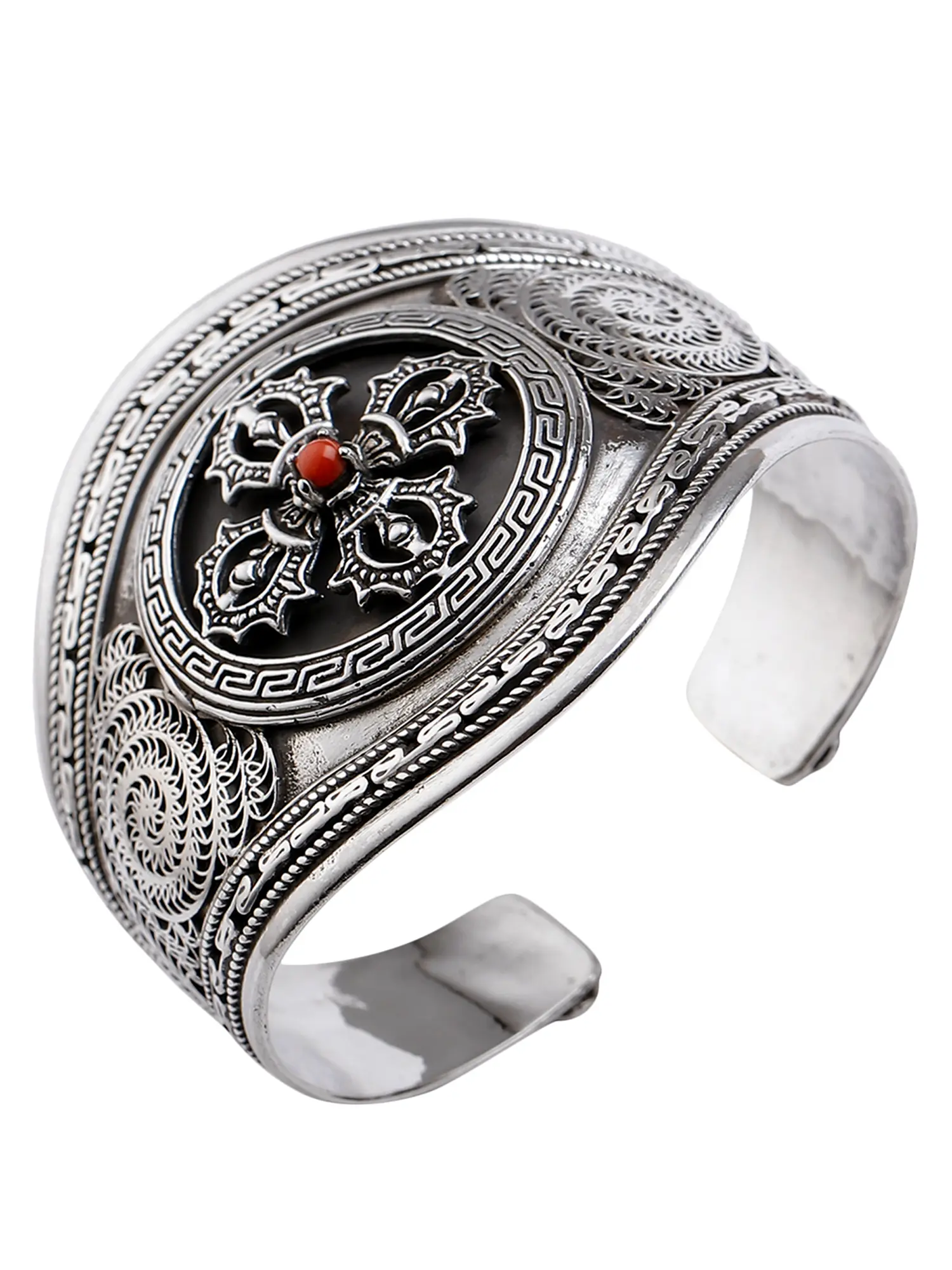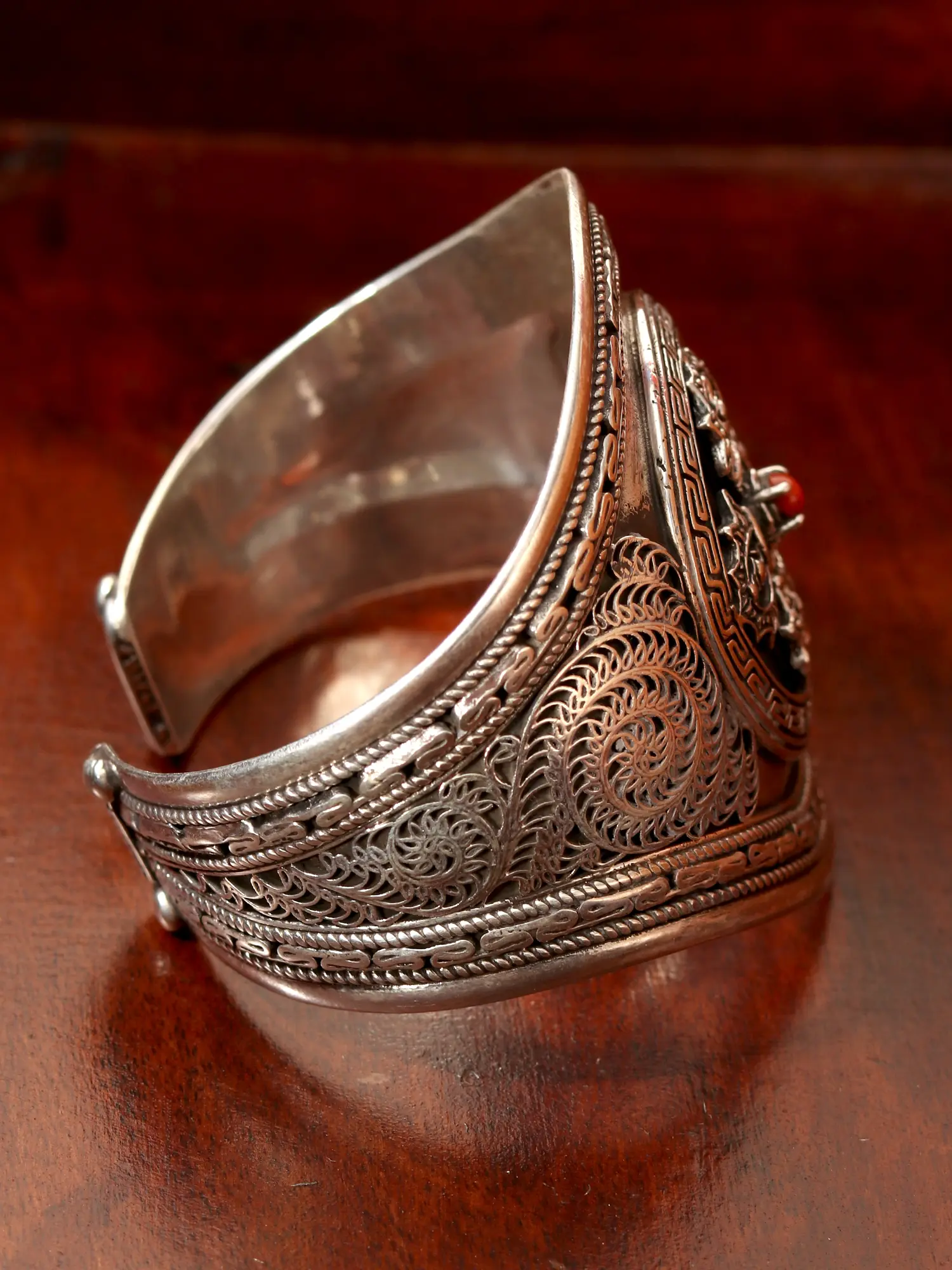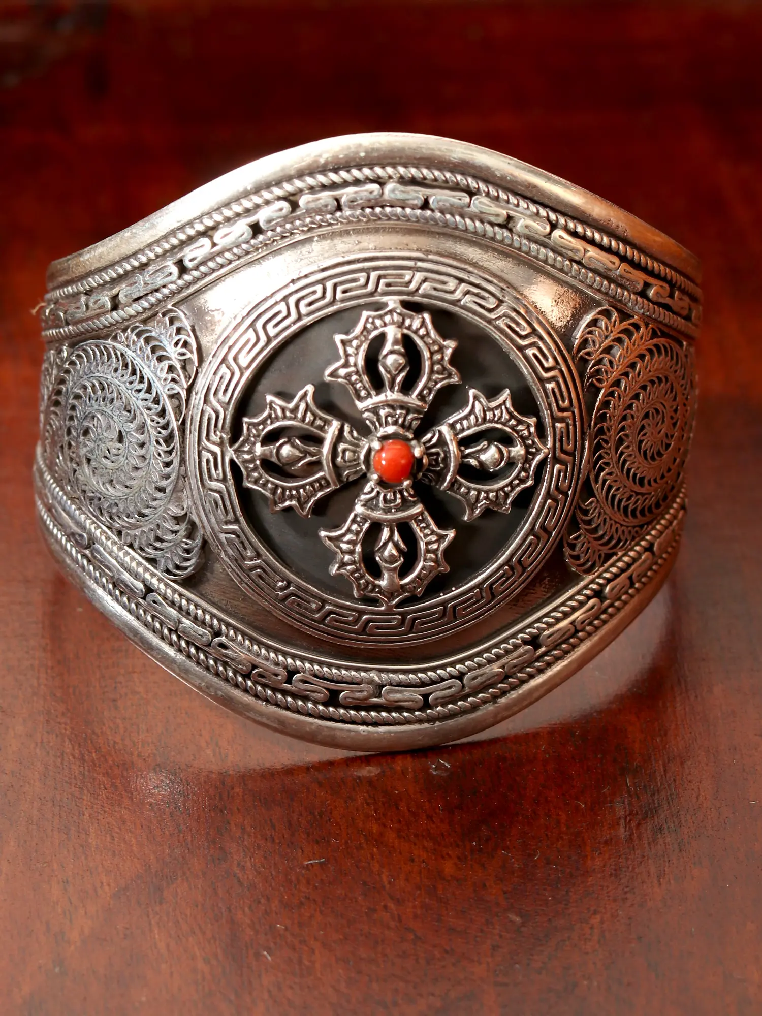 At the heart of this remarkable bracelet lies the double dorje, a powerful symbol in Tibetan Buddhism. The dorje, also known as a vajra, represents indestructibility, strength, and the ability to cut through illusion. The double dorje, or vishvavajra, amplifies these qualities, symbolizing ultimate power, stability, and the harmonious balance of opposing forces. In this bracelet, the double dorje is meticulously crafted with open cut filigree, adding depth and visual interest to its already significant meaning. A small coral gemstone is set in the center of the double dorje. In Buddhism, coral is believed to have protective properties.