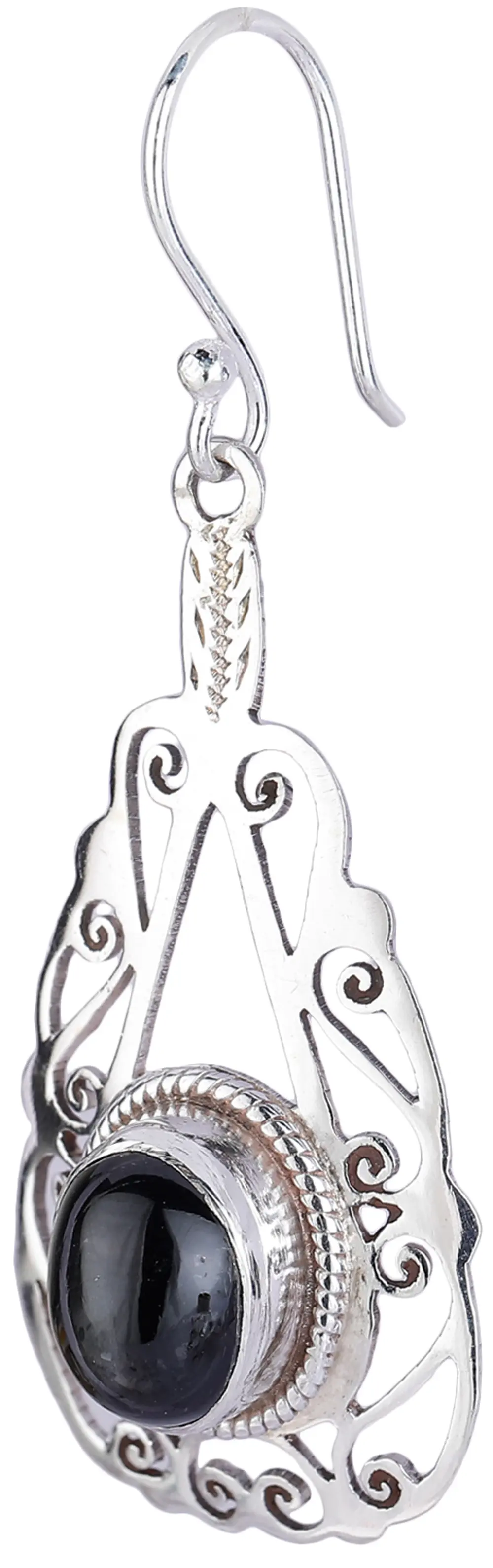 Each earring showcases a beautifully rendered drop shape, reminiscent of a teardrop or an elegant pendant. The sterling silver frame is a testament to skilled artistry, boasting openwork detailing that creates a delicate, lace-like appearance. Swirling filigree patterns add a romantic and vintage-inspired flair, drawing the eye towards the heart of the earring – the lustrous black onyx. The gemstone is securely nestled within a textured bezel, further enhancing its rich color and adding a subtle contrast to the polished silver. The sterling silver ear wire ensures a comfortable and secure fit, allowing you to wear these beauties all day and into the evening with confidence.