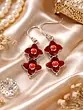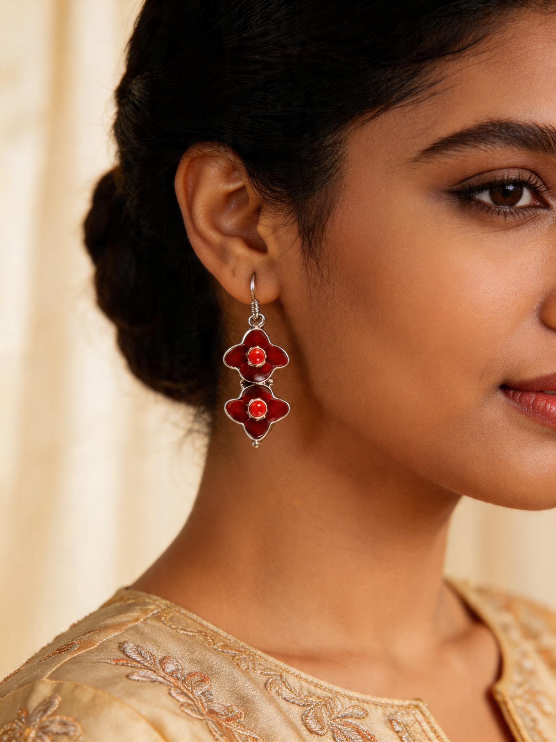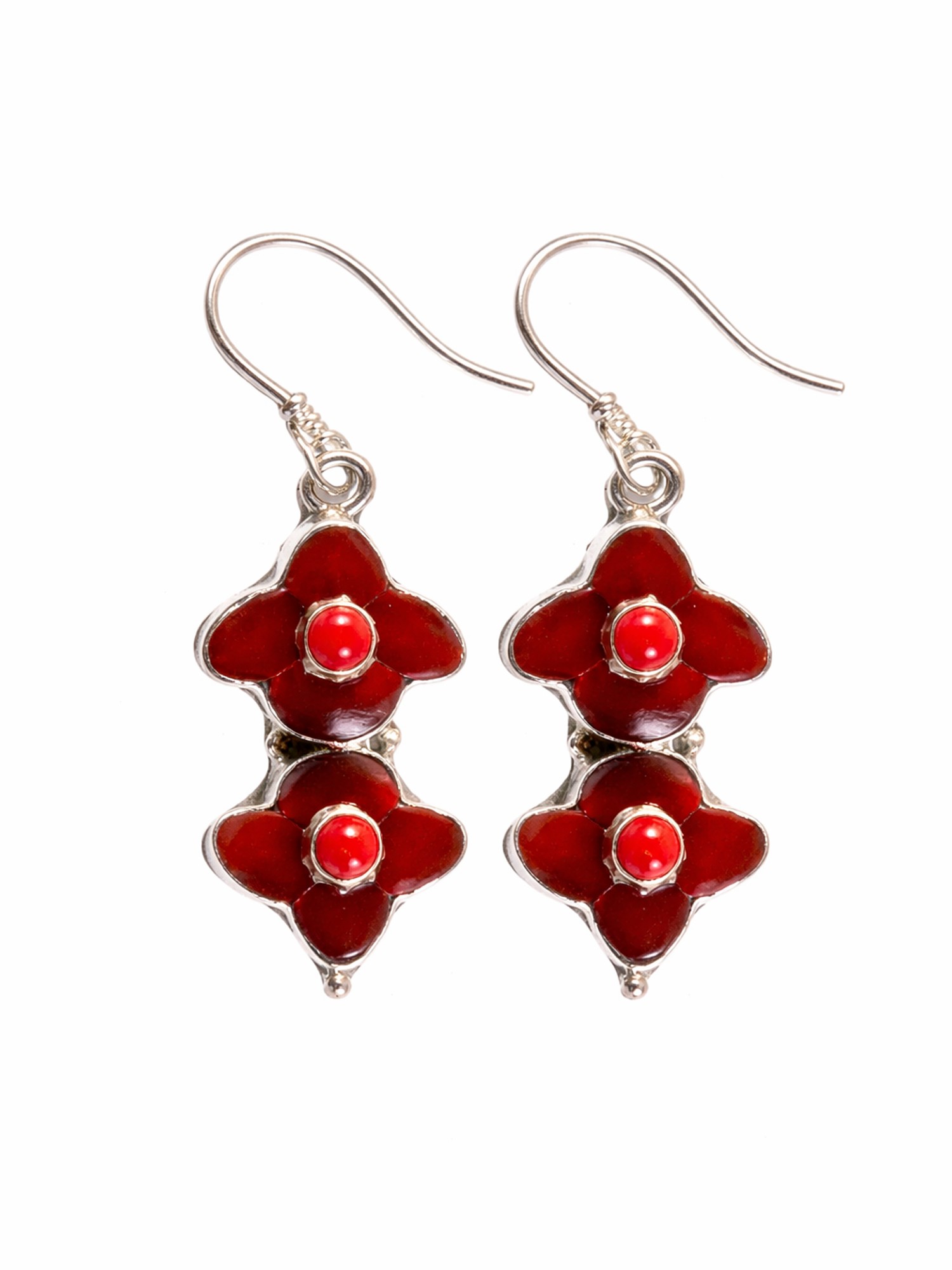 Dual Clover Design Coral Stone Centered Sterling Silver Earrings