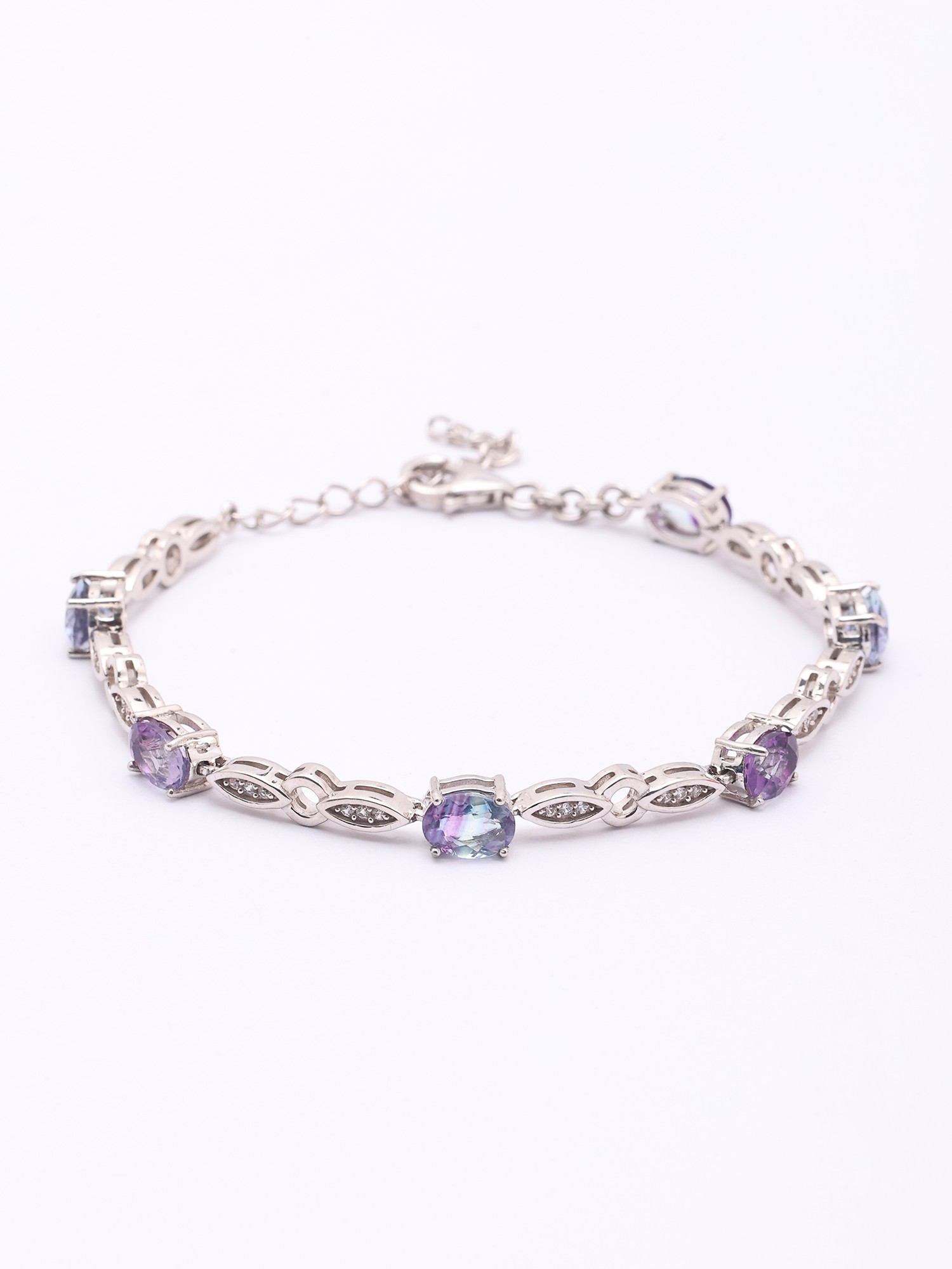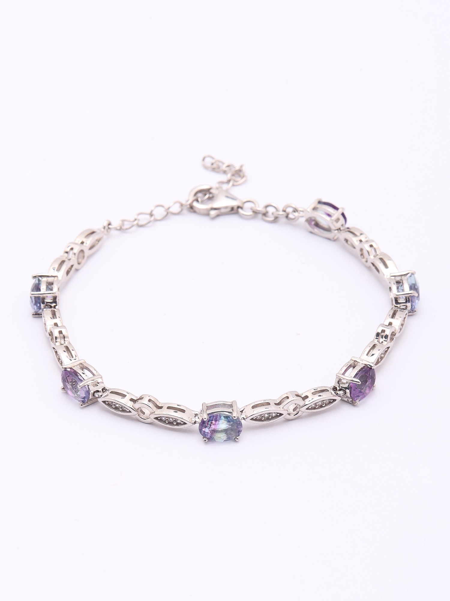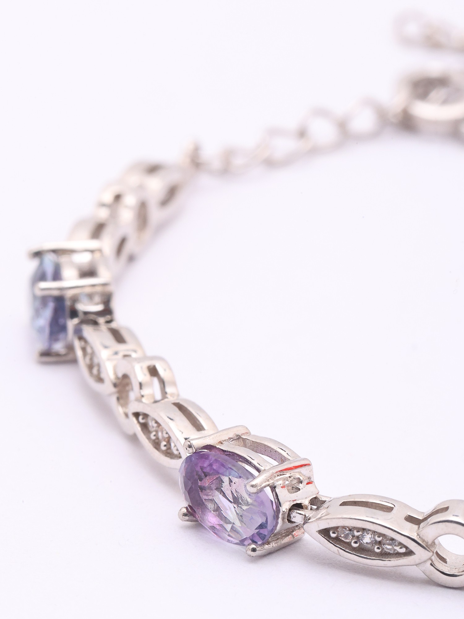 You'll be mesmerized by the alluring hues of the faceted gemstones, reminiscent of a twilight sky transitioning into dawn. These vibrant stones are thoughtfully interspersed with sparkling accents, each carefully placed to amplify the brilliance of the central gems. The cool, radiant gleam of the sterling silver provides a perfect, sophisticated canvas, highlighting the unique character of each stone.