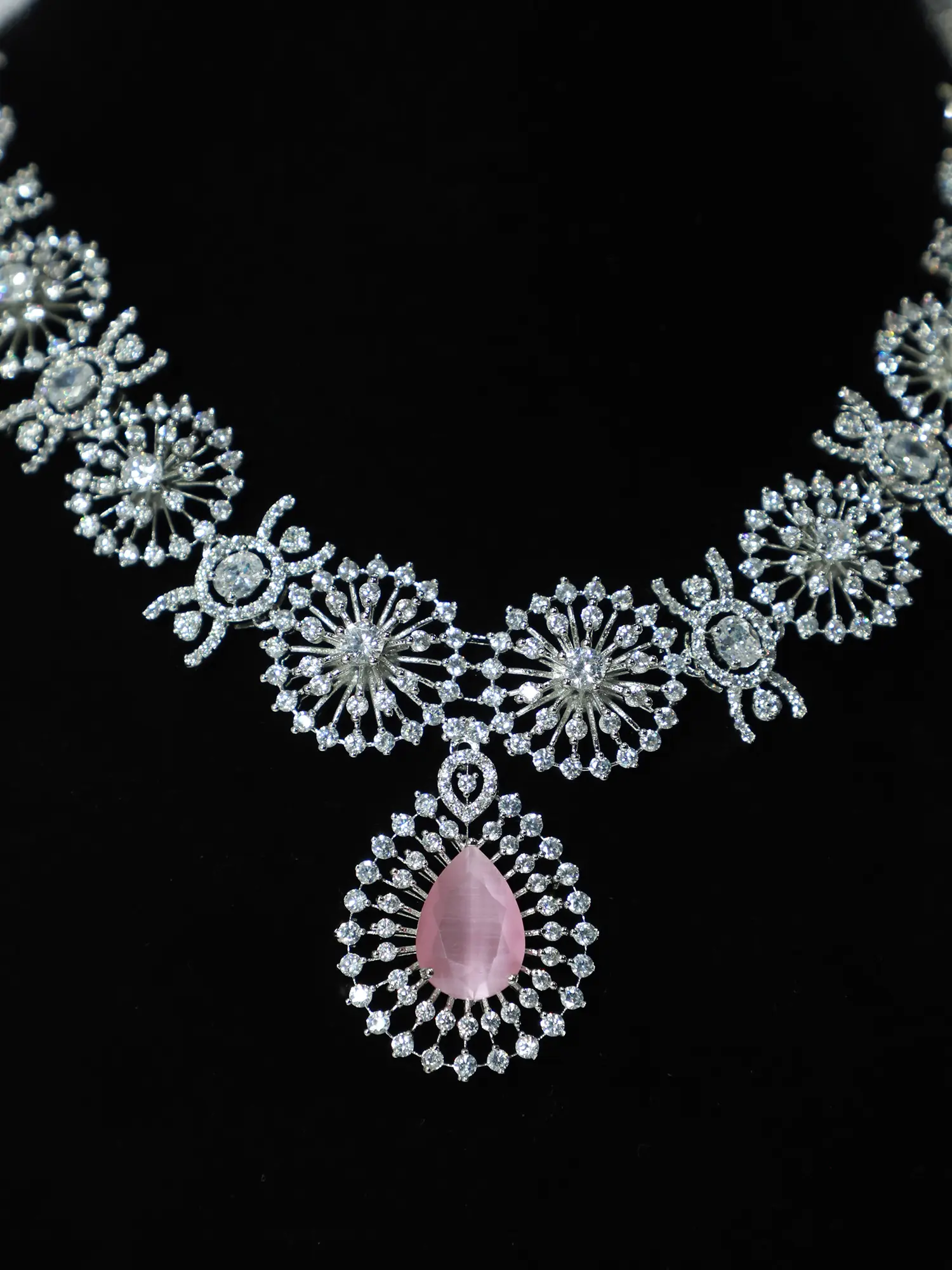 Stunning Floral Design Stone Studded Silver-Tone American Diamond Necklace Set With Earrings