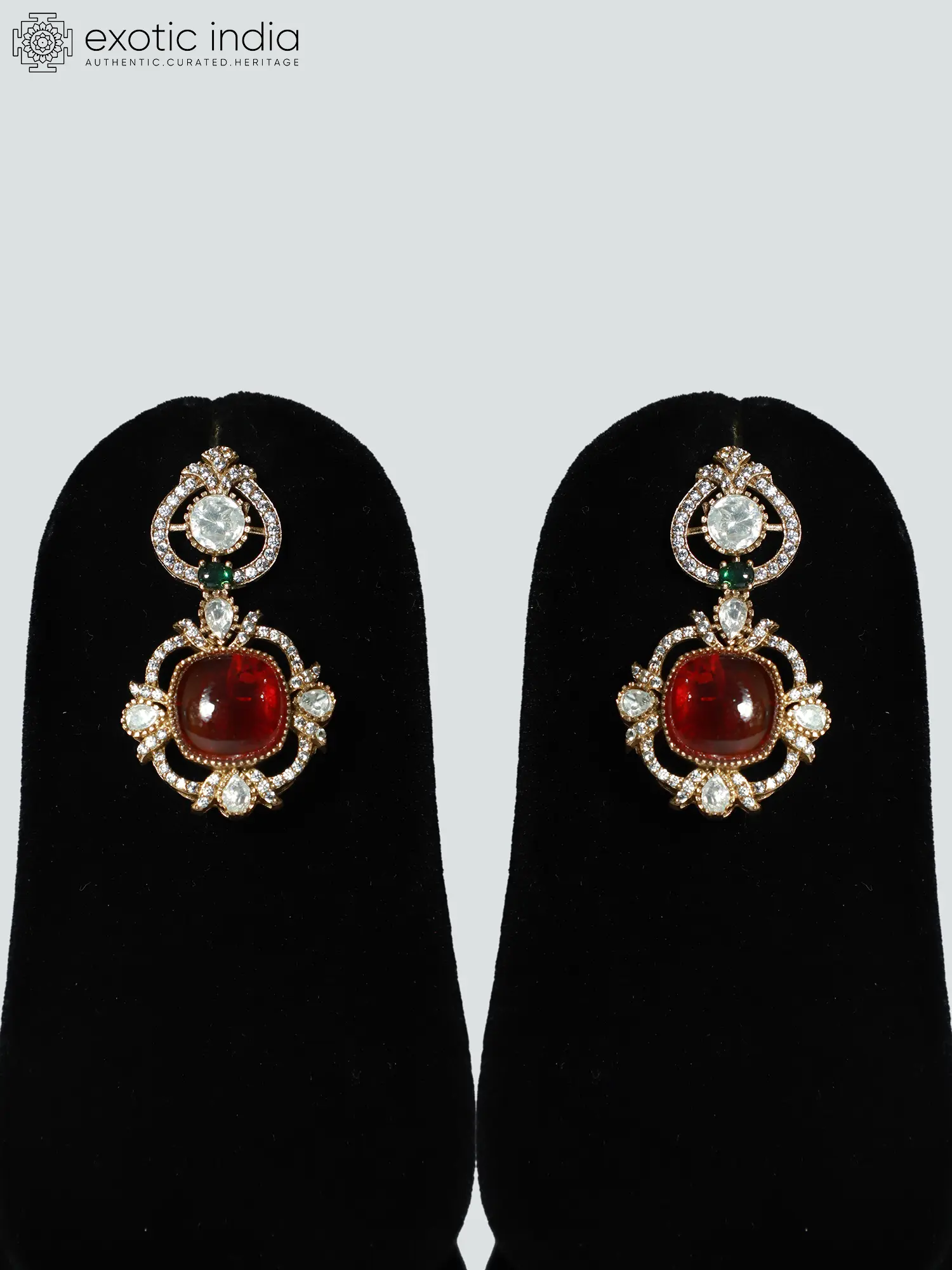 Measuring 15 inches in length, the choker necklace sits comfortably around the neck, creating a flattering and sophisticated silhouette. The earrings, at 1.7 inches in height and 0.9 inches in width, are the perfect size for adding a touch of glamour without being too ostentatious. This set is remarkably versatile – it can effortlessly elevate a simple outfit to a stunning ensemble, perfect for weddings, festivals, or any event where you want to make a statement. Its timeless design means you can treasure this piece for years to come, knowing that it will always remain both fashionable and elegant. The beautiful red stones are complemented beautifully by the glistening cubic zirconia and subtle green accents, making this a truly breathtaking piece of jewellery.