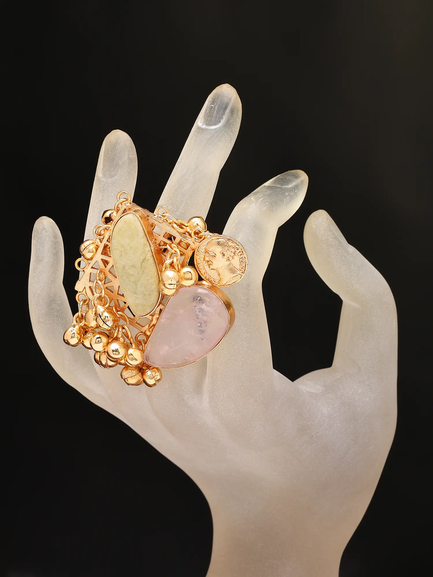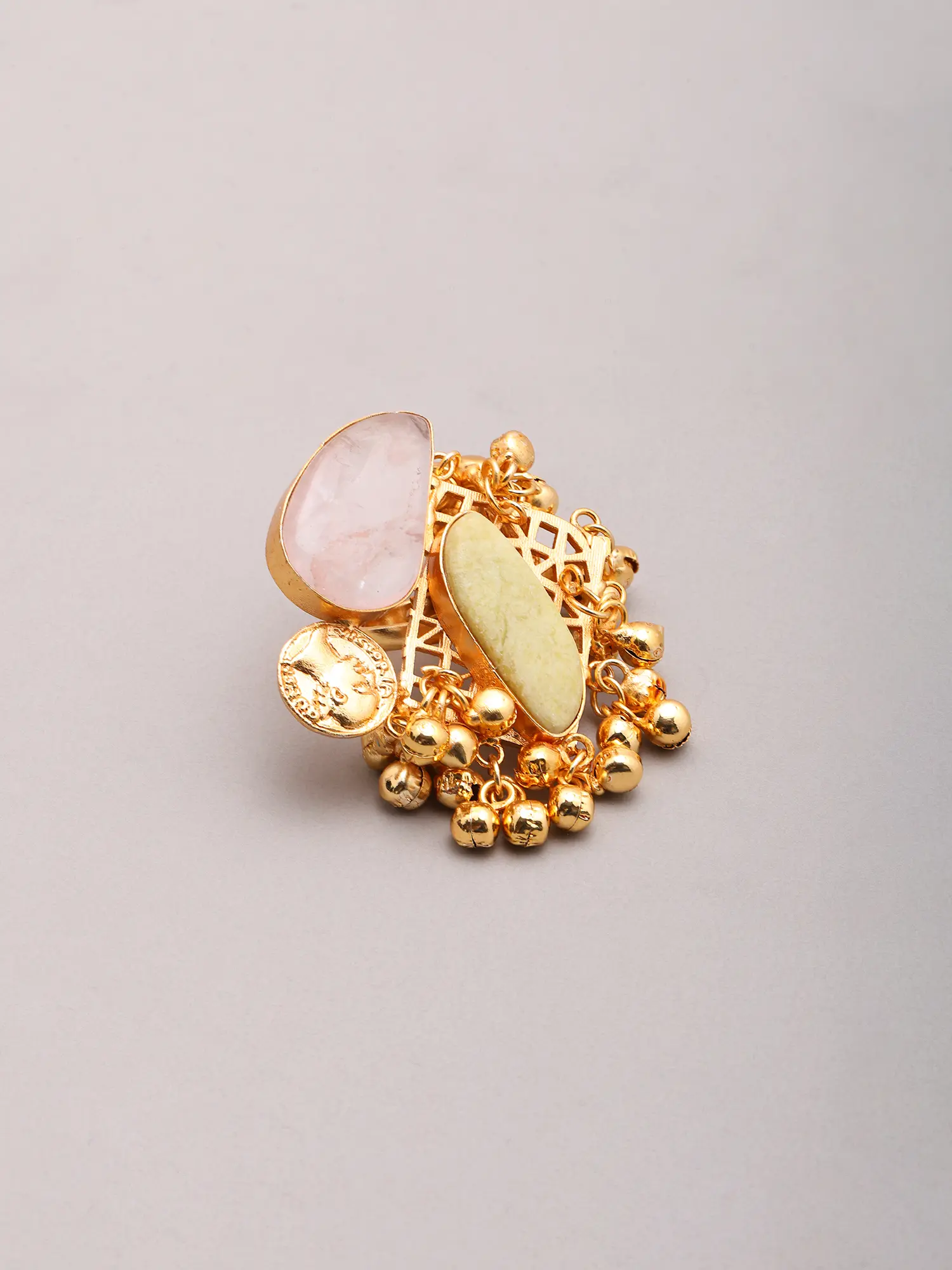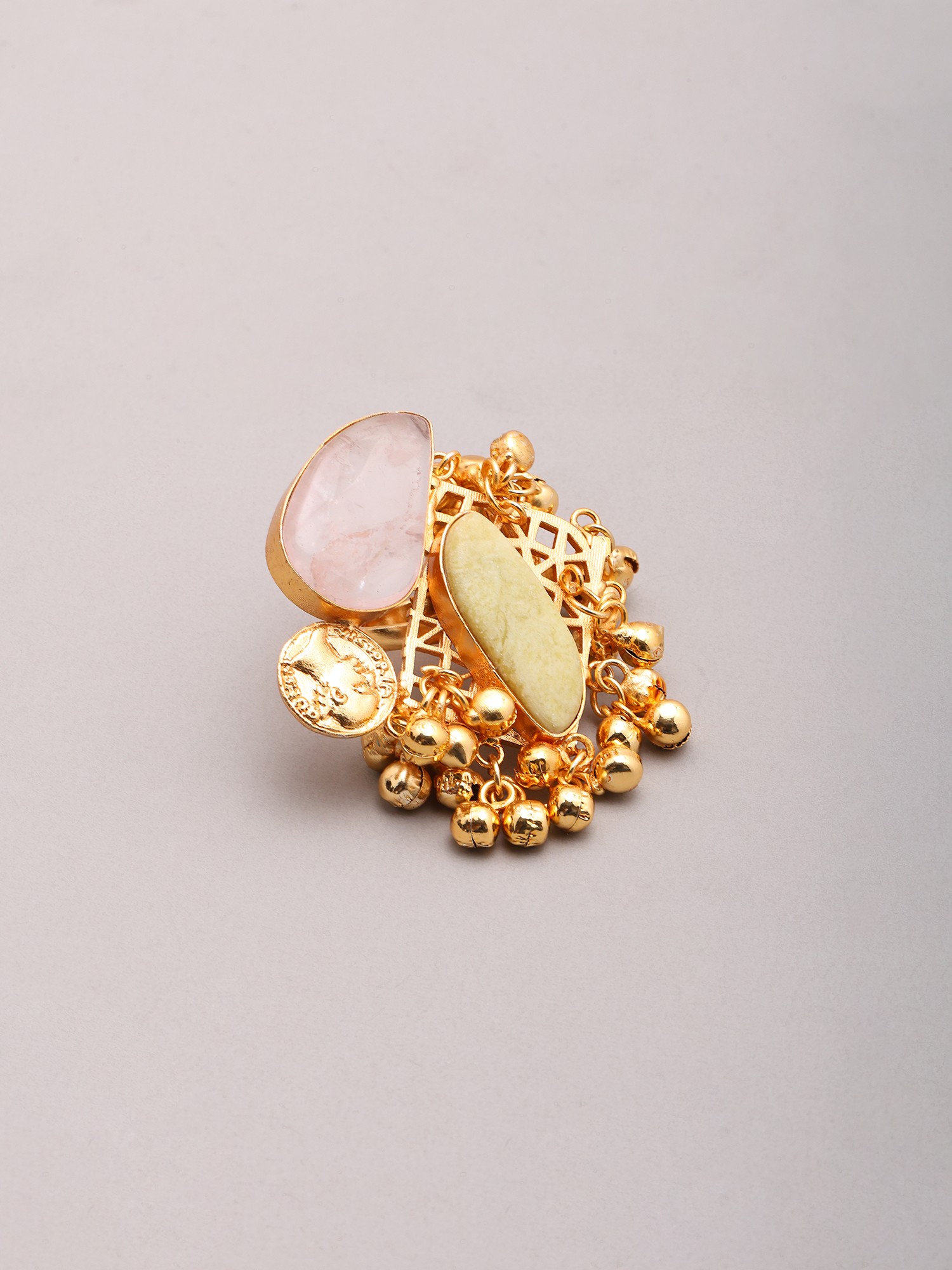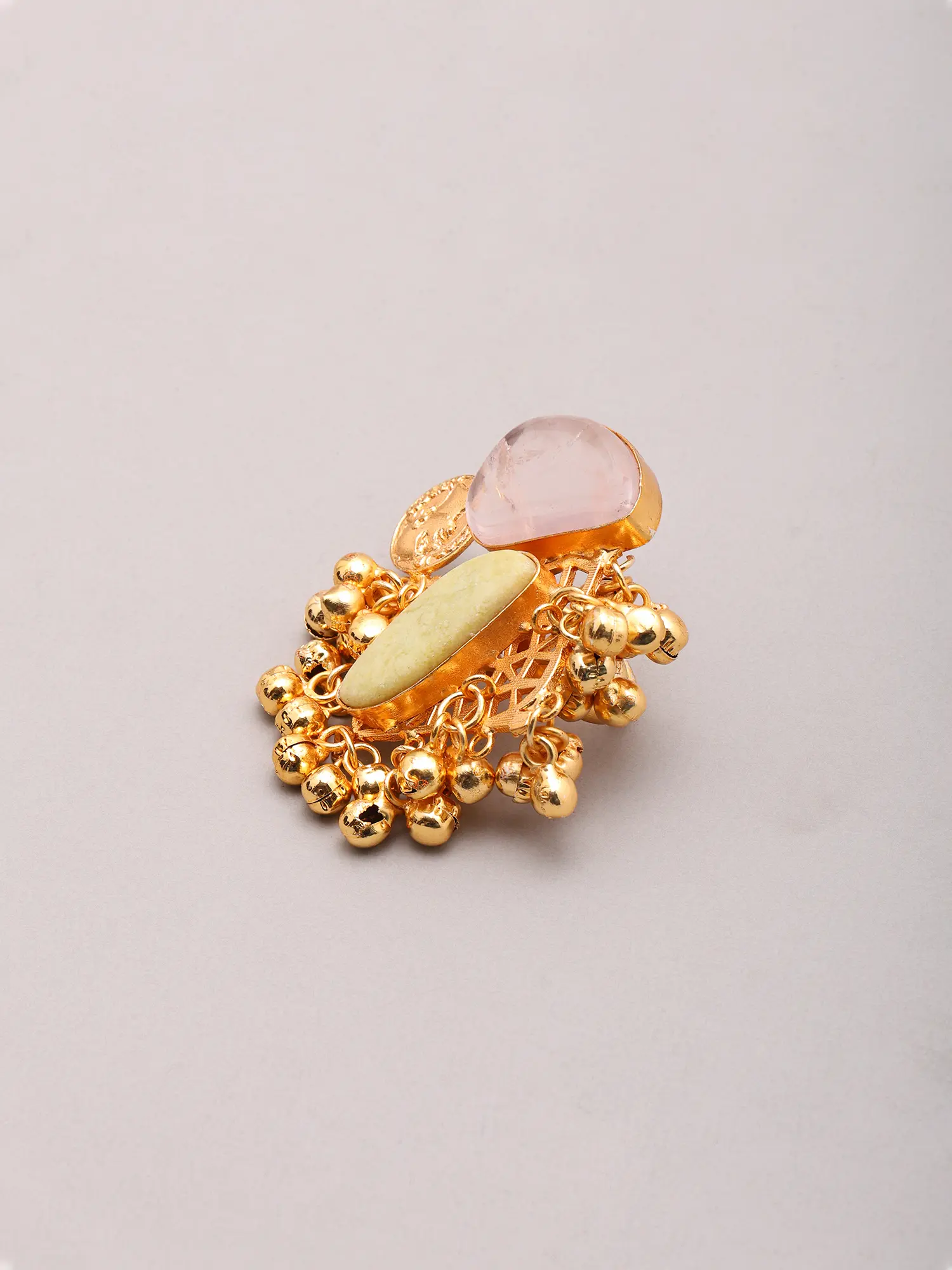 You'll be captivated by the interplay of textures and shapes that define this remarkable ring. Two unique semi-precious stones, one a serene rosy quartz and the other a gentle pale jade, are expertly embraced by the warm gleam of brass. Measuring an impressive 1.85 inches in height, its generous scale ensures it commands attention. A delightful cluster of tiny, jingly ghungroos adds a playful, melodic element, responding with a subtle chime to your every movement, evoking a sense of festivity.