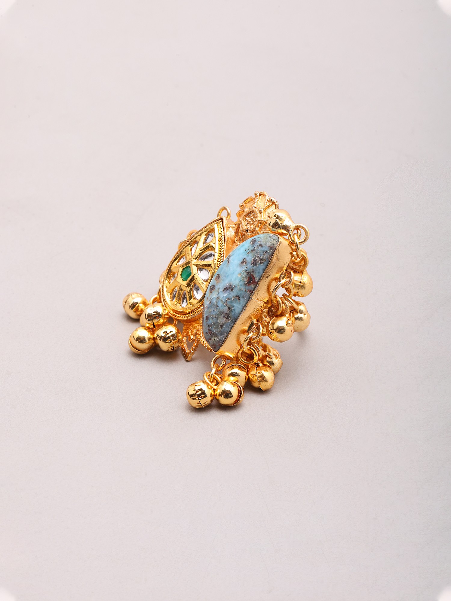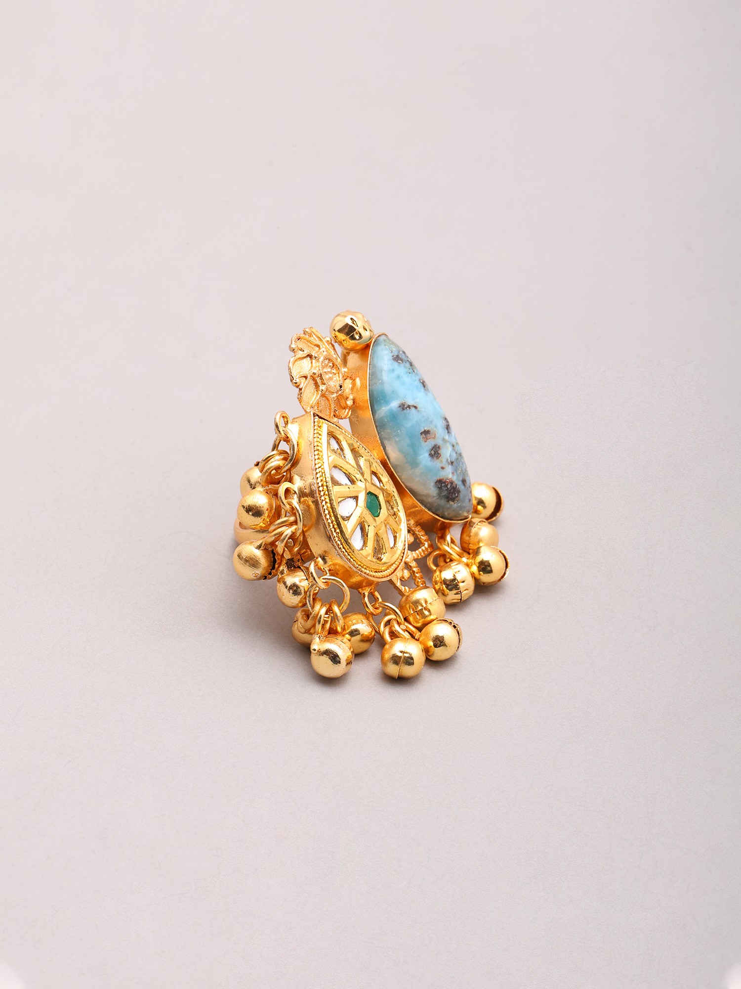 Imagine the gentle sway of the ghungroos as you gesture during a lively conversation at a festive gathering, or the way the light dances off the larimar as you grace a sophisticated evening soiree. This statement ring effortlessly transitions from daytime elegance to evening glamour, perfect for adding a distinctive touch to casual outfits or complementing your finest attire. It’s an ideal choice for those who appreciate jewelry that tells a story and makes a personal statement.