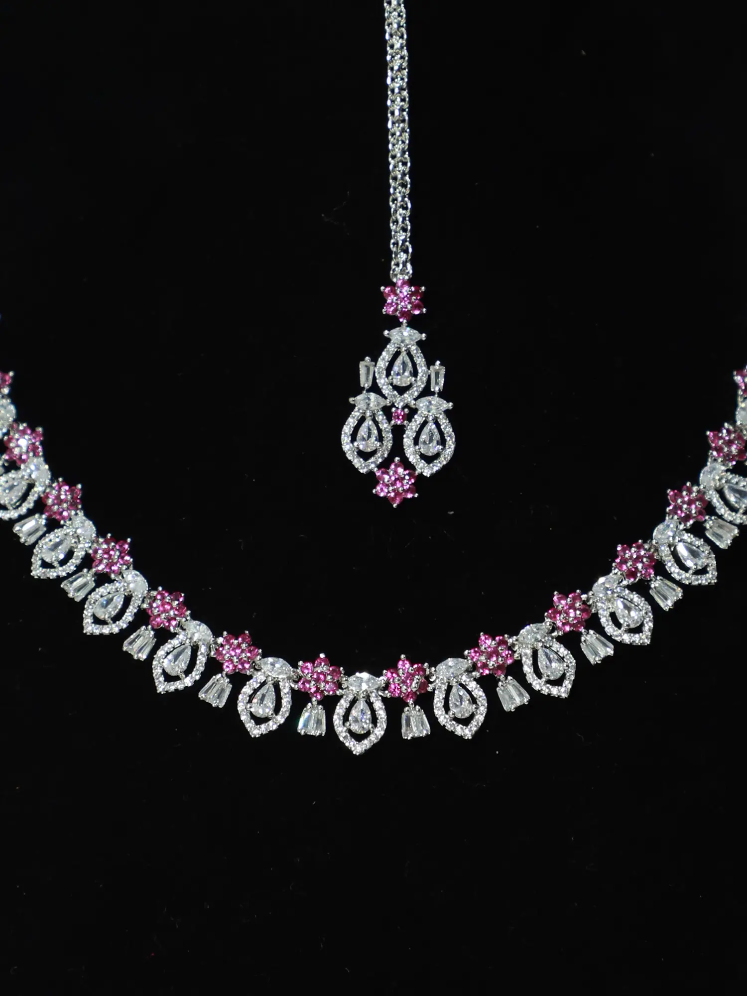 Complementing the necklace are the beautifully designed earrings. Mirroring the intricate pattern of the necklace, these earrings dangle with a graceful movement, enhancing the brilliance of the overall set. They are the perfect size to be noticeable without being overwhelming, striking a harmonious balance between statement and subtlety. The secure fastenings ensure comfortable wear throughout the day or night, allowing you to shine with confidence at any occasion. To complete the ensemble, a stunning maang tikka is included. This traditional piece adds a touch of cultural richness and elegance. It perfectly complements the necklace and earrings, creating a cohesive and unforgettable look. - - - - - - - - - -