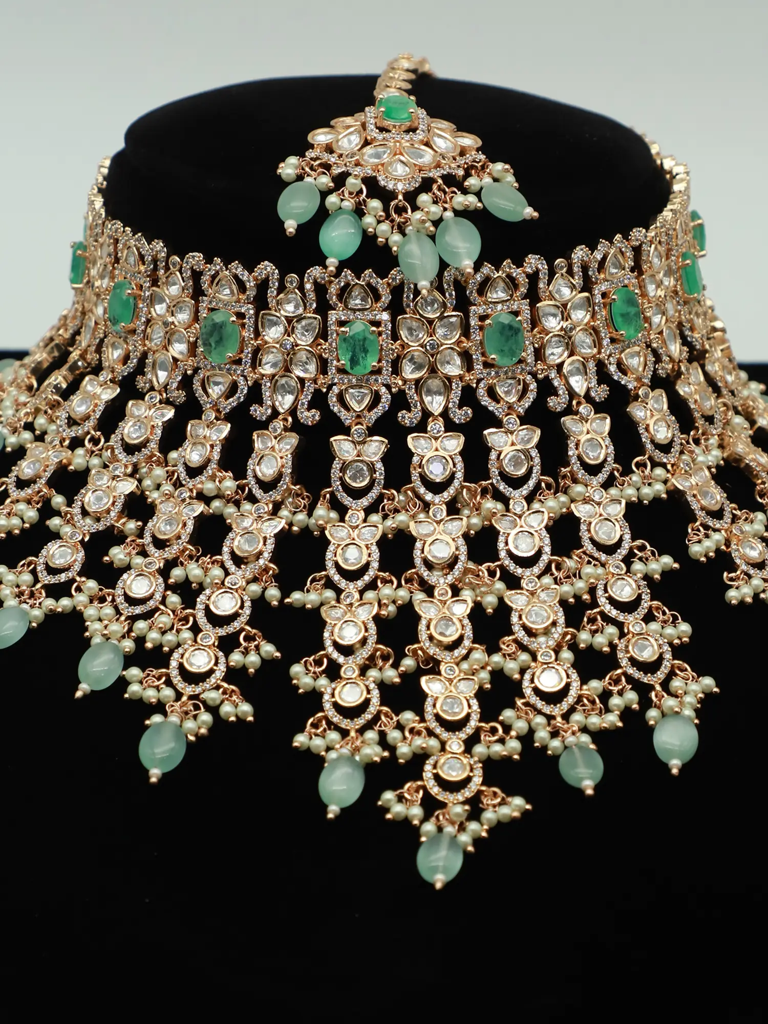Indulge in the allure of this stunning jewelry set, a testament to timeless artistry and meticulous craftsmanship. This ensemble, featuring a choker necklace, matching earrings, and a graceful mangtika, is designed to elevate your look with a touch of regal sophistication. Each piece is a work of art, intricately detailed and carefully assembled to create a harmonious and breathtaking effect. The design evokes a sense of classic beauty, reimagined for the modern woman. It is the perfect accessory for special occasions, from weddings and festivals to elegant evening events. Let this jewelry set be the statement piece that completes your ensemble, adding a touch of glamour and refinement.