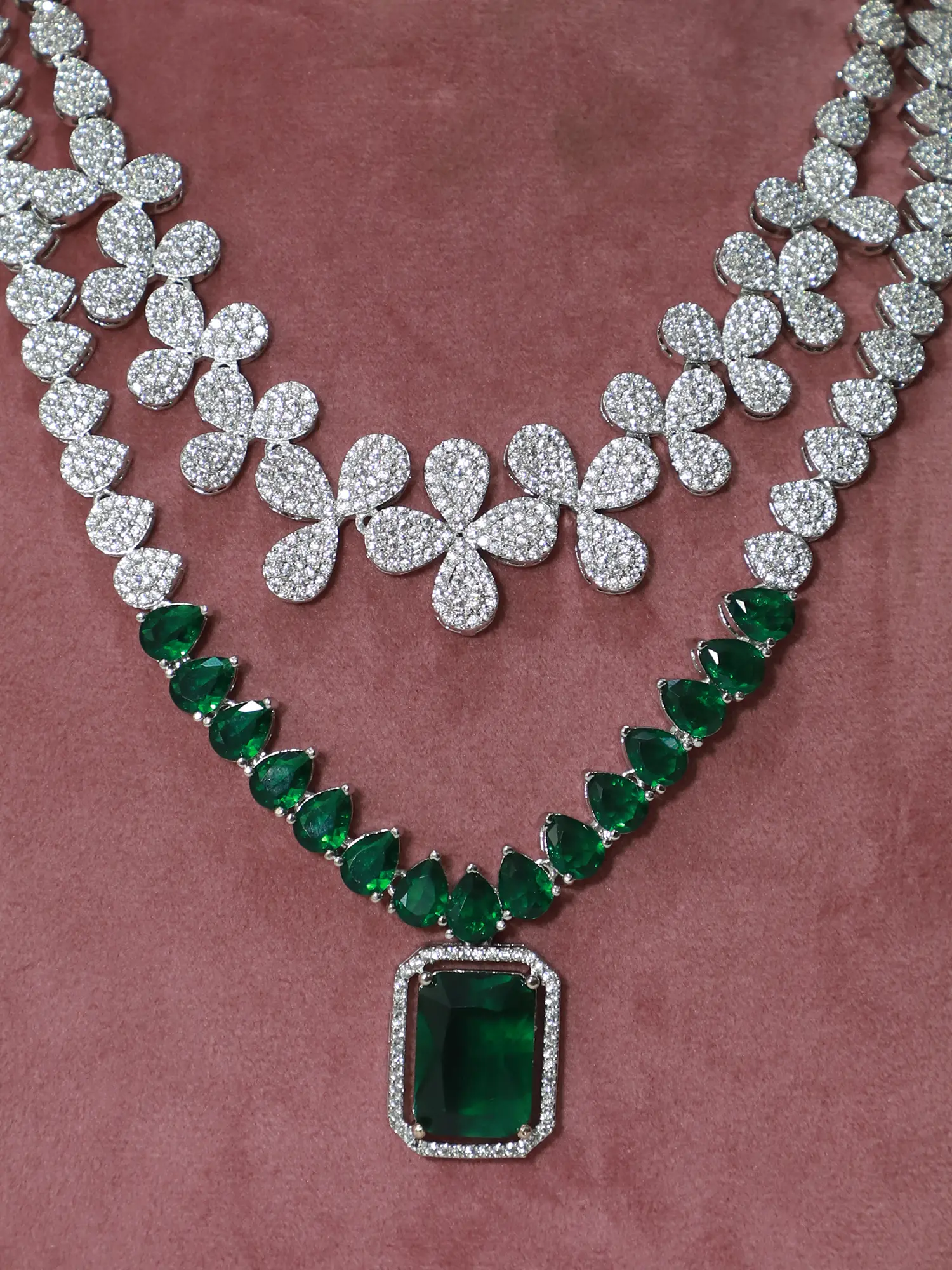 Exquisite Floral Design Two Layered American Diamond Necklace Set With Earrings