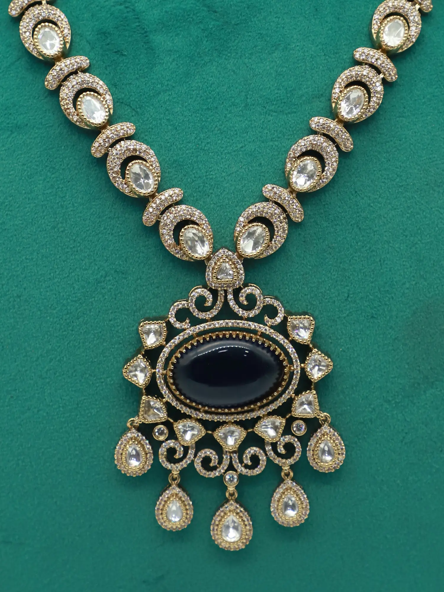 The set features a harmonious arrangement of stones, carefully placed to maximize their brilliance and sparkle. The central pendant of the necklace boasts a captivating dark stone, surrounded by a halo of shimmering accents that catch the light with every movement. This focal point is further enhanced by delicate stone-studded drops that dangle gracefully, adding a touch of playfulness to the overall design. The coordinating earrings echo the same aesthetic, featuring a similar stone arrangement and intricate detailing, creating a cohesive and balanced look. The warm tone of the brass provides a beautiful canvas for the sparkling stones, adding a subtle touch of vintage charm. The metalwork is meticulously crafted, ensuring both durability and aesthetic appeal. The design is both visually striking and comfortable to wear, making it a piece you'll reach for again and again.