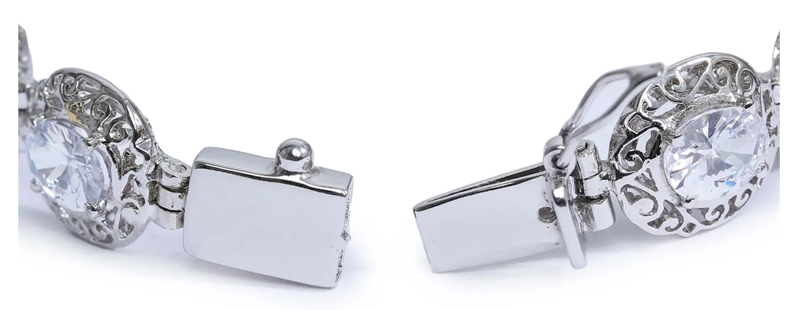 What truly sets this bracelet apart is the delicate lattice work that surrounds each captivating stone. The open filigree design, reminiscent of antique lace, adds a layer of sophisticated detail and visual intrigue. This ornate metalwork creates a beautiful contrast with the clean, sparkling facets of the cubic zirconia, drawing the eye to the center of each link and enhancing the overall opulence of the piece. The detailed craftsmanship speaks to a dedication to quality, making this bracelet a treasured addition to any jewelry collection.