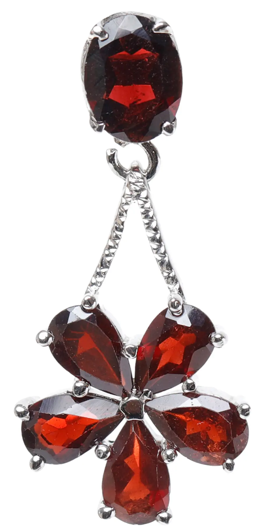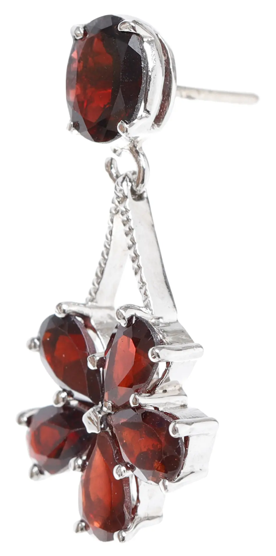 The design features a delicate, dangling arrangement. A single, oval-shaped garnet sits atop a striking geometric connector, creating a dynamic visual flow. Below, the main focal point is a floral arrangement of pear-shaped garnets. The combination of shapes and angles creates a sense of movement and depth, enhancing the visual impact of the gemstones. Each stone is carefully faceted to maximize its brilliance and light reflection, catching the eye with every turn of the head.