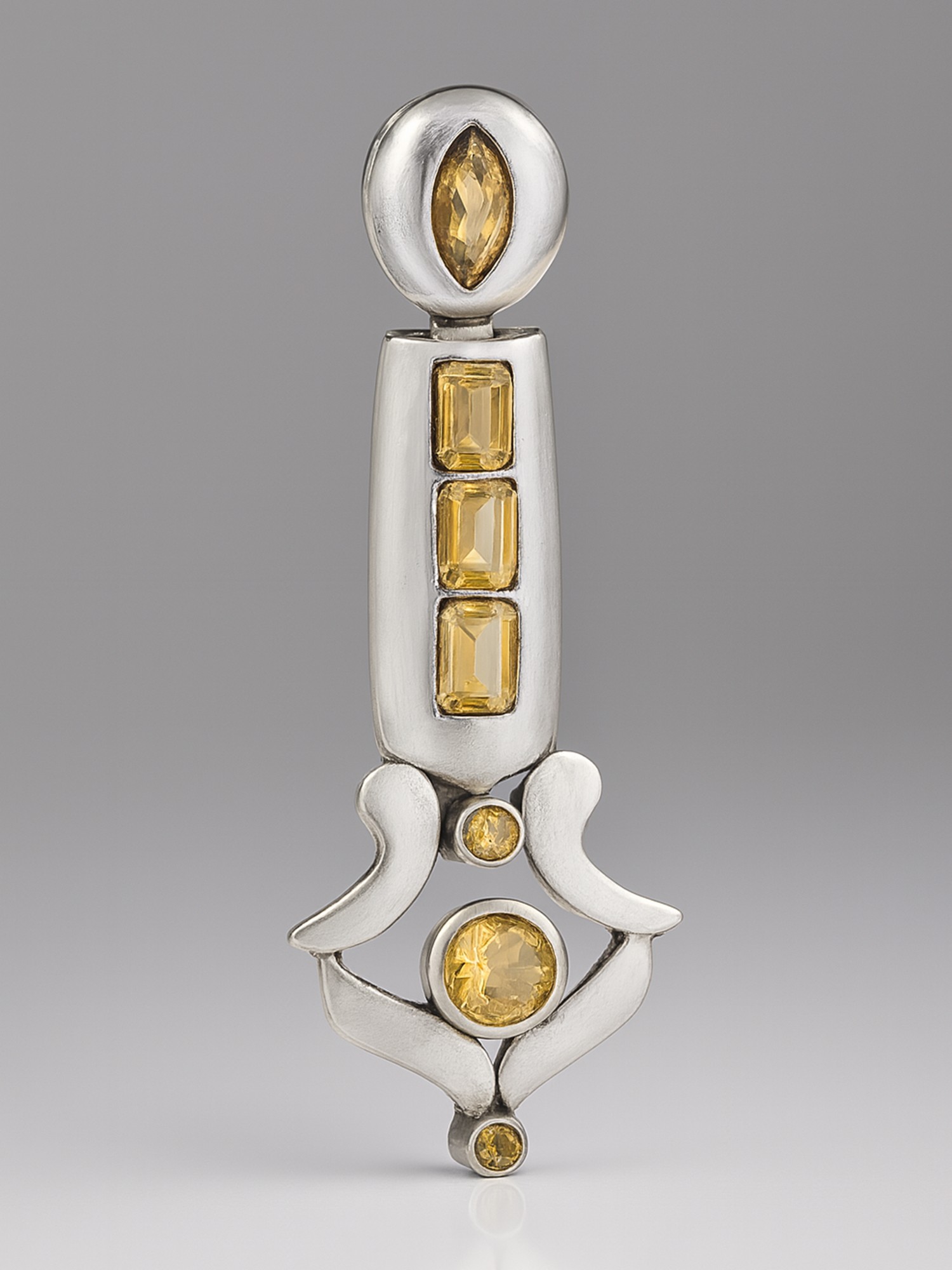 This uniquely-shaped pendant is available in 4 different types of gemstones. They are namely citrine, garnet, peridot and rainbow moonstone. These gemstones are popular known to increase vitality, improve blood circulation, detox and soothe nerves. The pendant is 2.5 inch in height, 0.8 inch wide, and weighs 14.9 grams. Starting from the top, the pendant is slightly-ovalish with a gem stone of similar shape in the centre. It then extends downwards into a rectangular shape, with three gemstones of similar lined vertically, and finally, it ends off with a reverse ""bracketed"" structure with 2 other gemstones in the centre and one just right at the bottom.