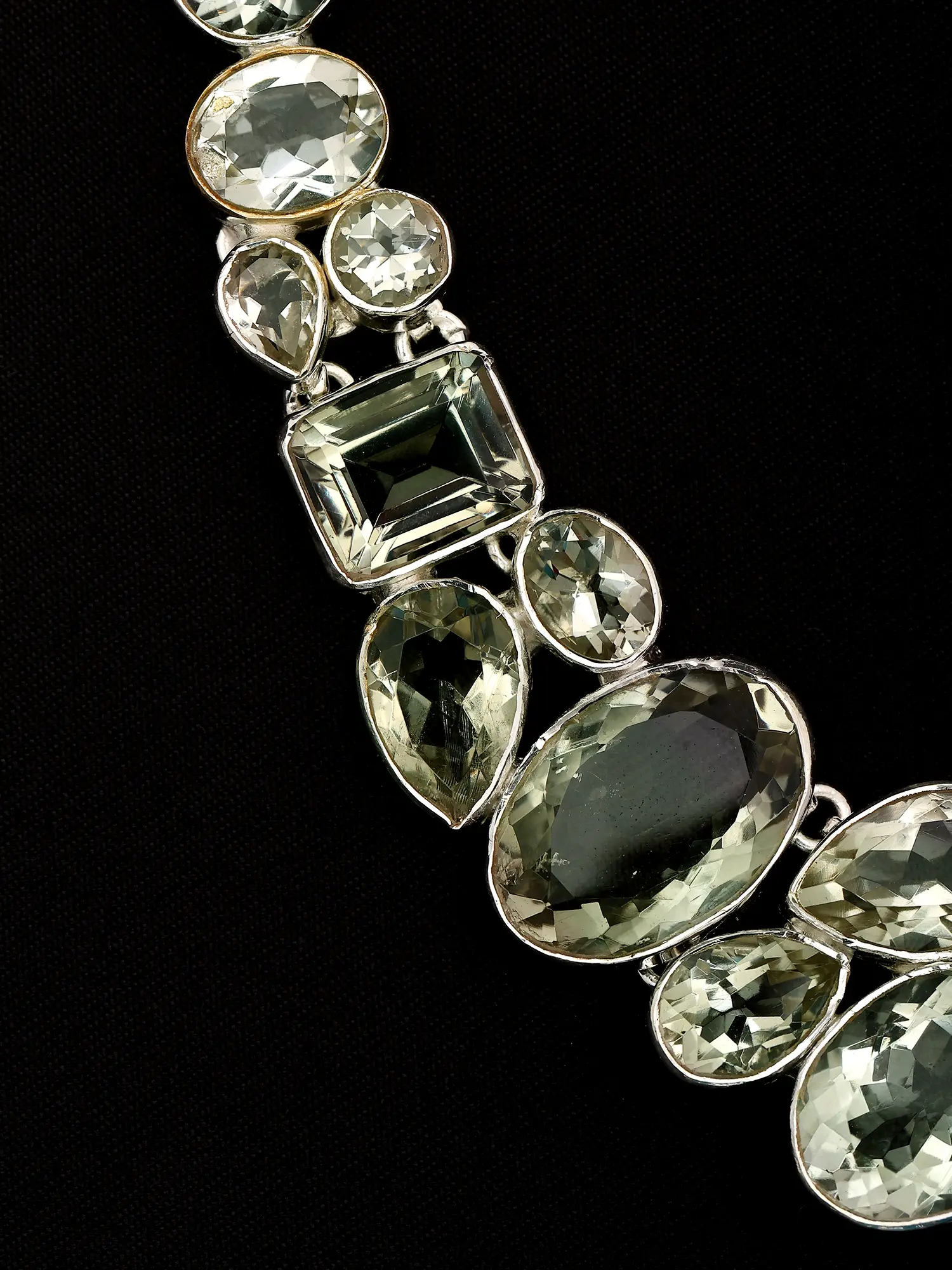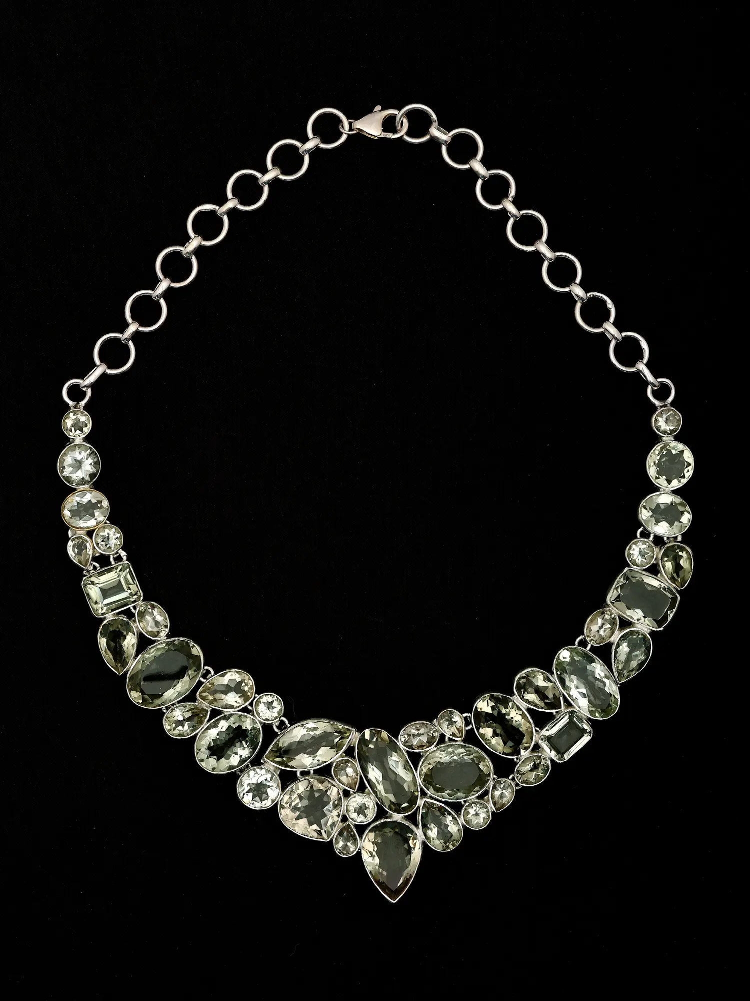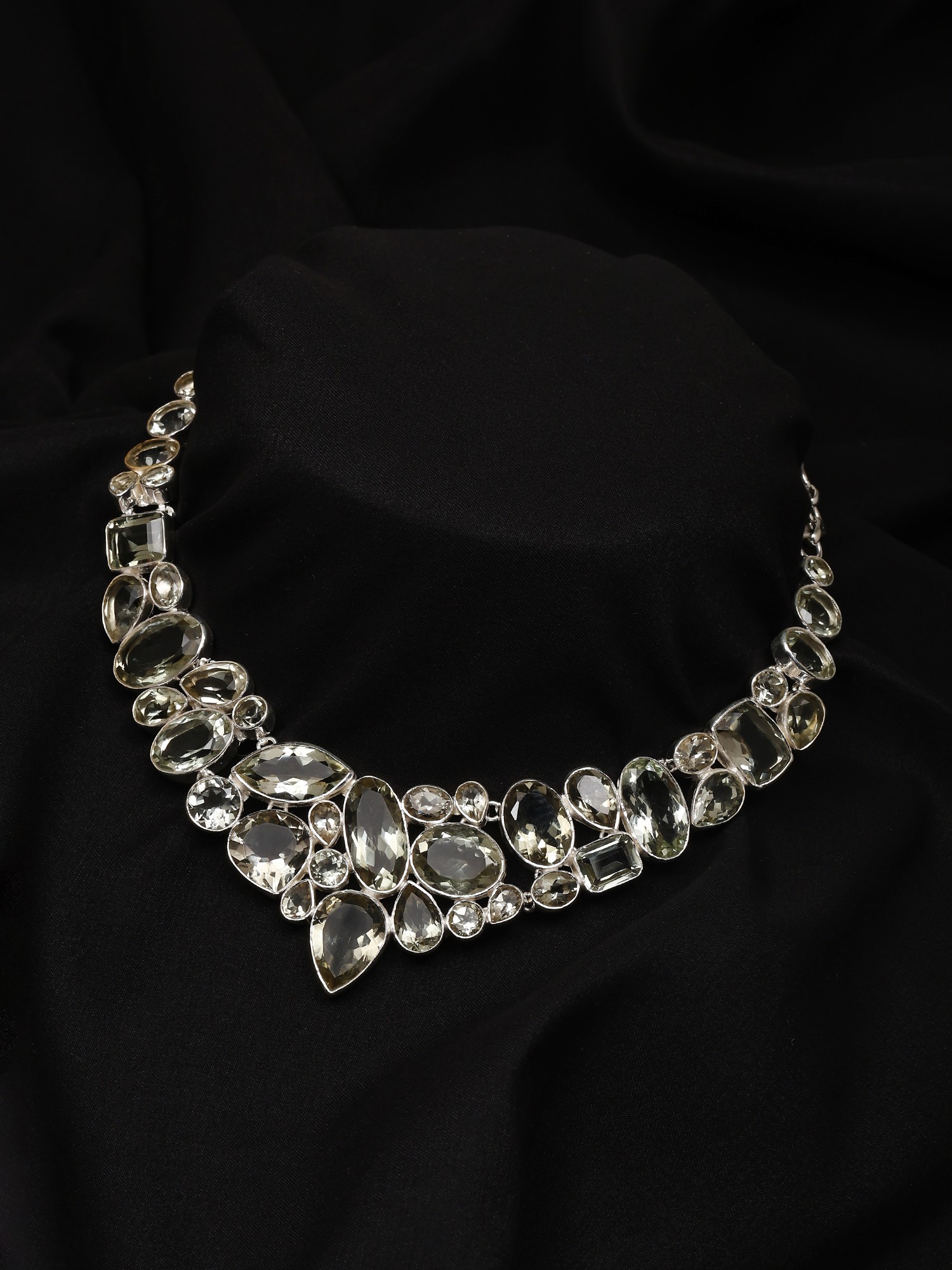 Adorn yourself with a truly captivating piece that captures the essence of refined elegance. This exquisite sterling silver necklace is meticulously crafted, showcasing a stunning arrangement of faceted green amethyst gemstones. Each stone, hand-selected for its clarity and brilliance, is expertly cut to maximize the play of light, creating a mesmerizing dance of subtle green hues. The varied shapes and sizes of the amethyst, from graceful marquises to classic ovals and sharp rectangles, are artfully juxtaposed, forming a dynamic and organic design that cascades down the neckline. The sterling silver setting provides a cool, lustrous backdrop that enhances the natural beauty of the gemstones. Its intricate detailing and polished finish speak to the craftsmanship and attention to detail invested in this piece. This necklace is more than just an accessory; it's a statement of sophisticated taste and an embodiment of natural wonder, brought to life through exceptional artistry.