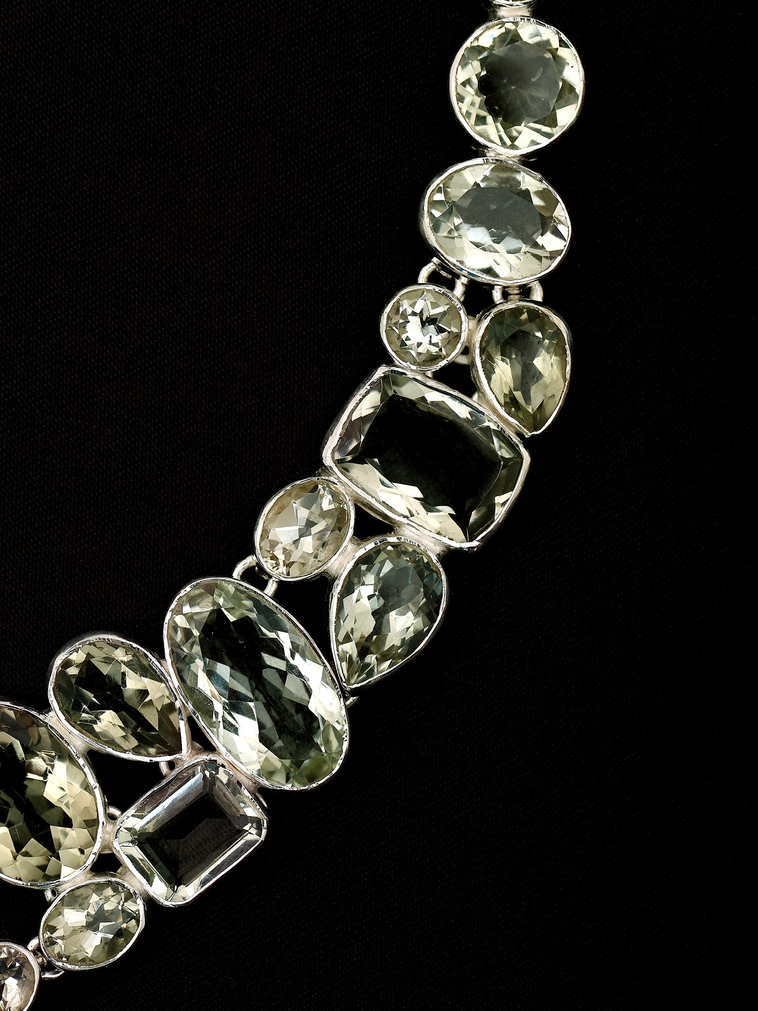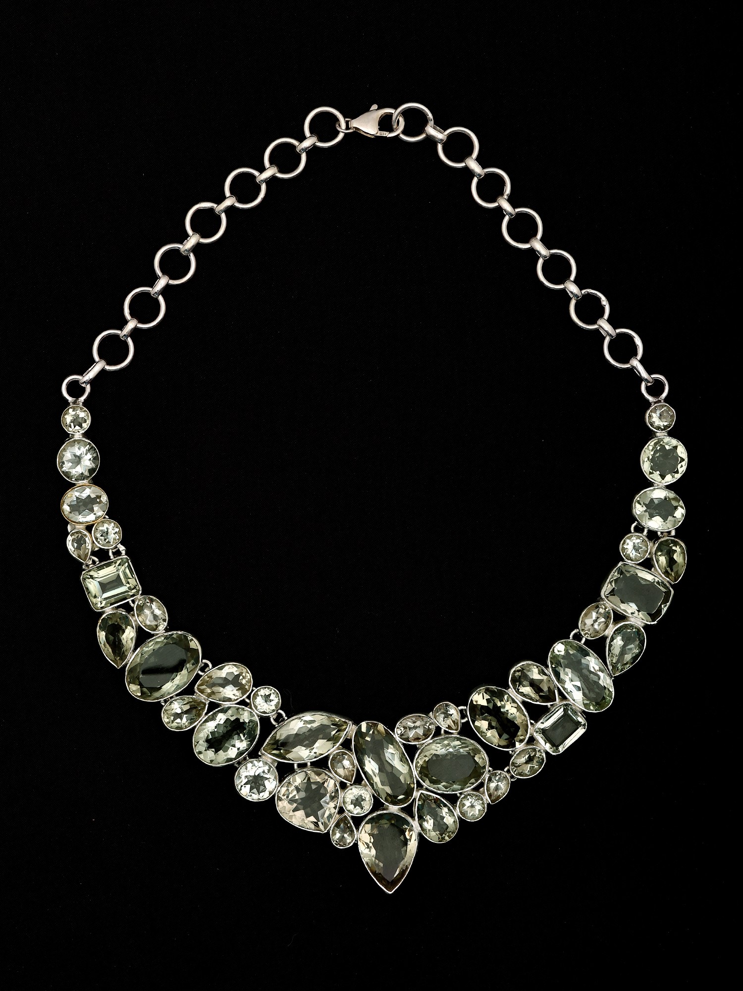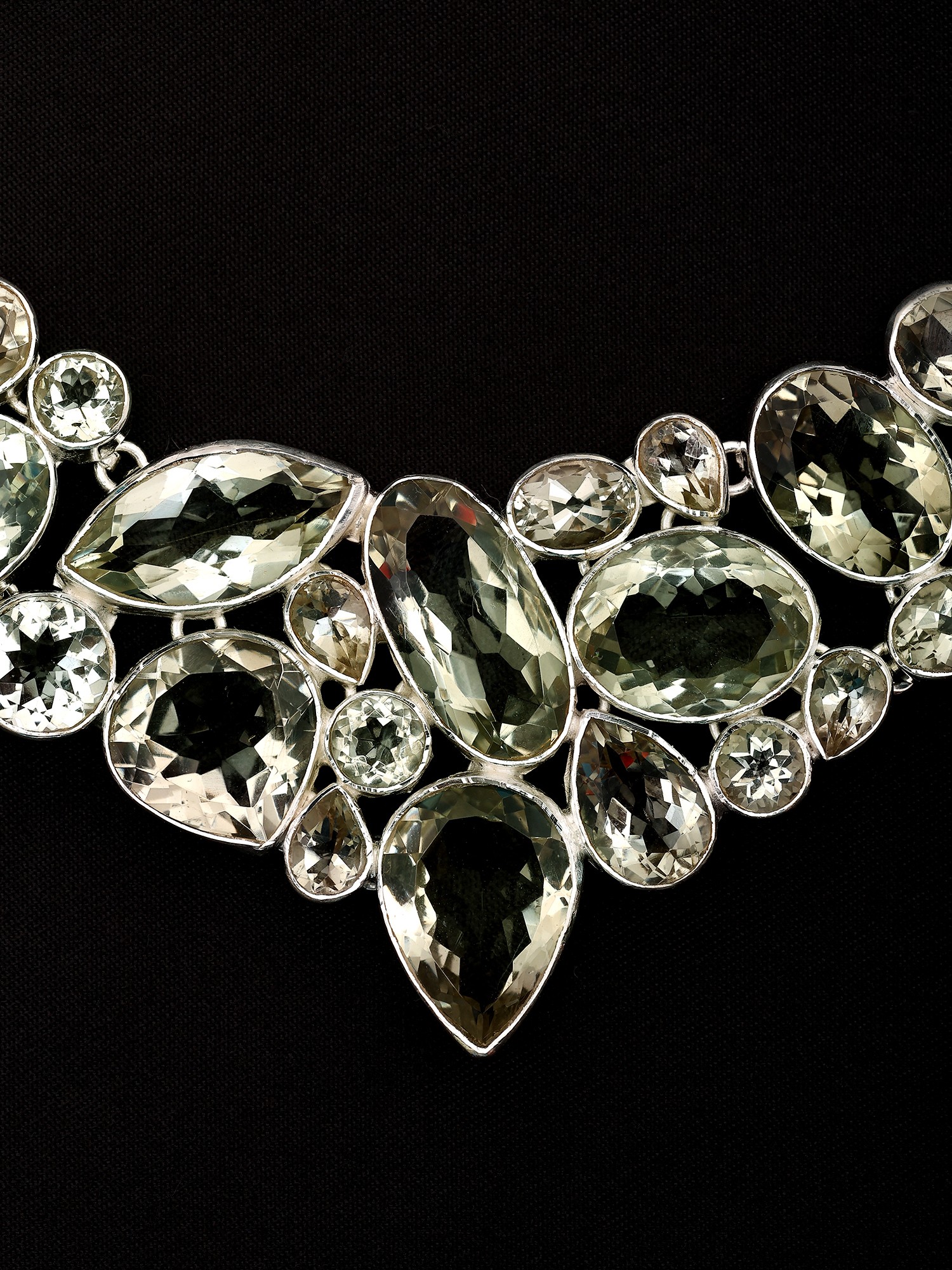 Adorn yourself with a truly captivating piece that captures the essence of refined elegance. This exquisite sterling silver necklace is meticulously crafted, showcasing a stunning arrangement of faceted green amethyst gemstones. Each stone, hand-selected for its clarity and brilliance, is expertly cut to maximize the play of light, creating a mesmerizing dance of subtle green hues. The varied shapes and sizes of the amethyst, from graceful marquises to classic ovals and sharp rectangles, are artfully juxtaposed, forming a dynamic and organic design that cascades down the neckline. The sterling silver setting provides a cool, lustrous backdrop that enhances the natural beauty of the gemstones. Its intricate detailing and polished finish speak to the craftsmanship and attention to detail invested in this piece. This necklace is more than just an accessory; it's a statement of sophisticated taste and an embodiment of natural wonder, brought to life through exceptional artistry.
