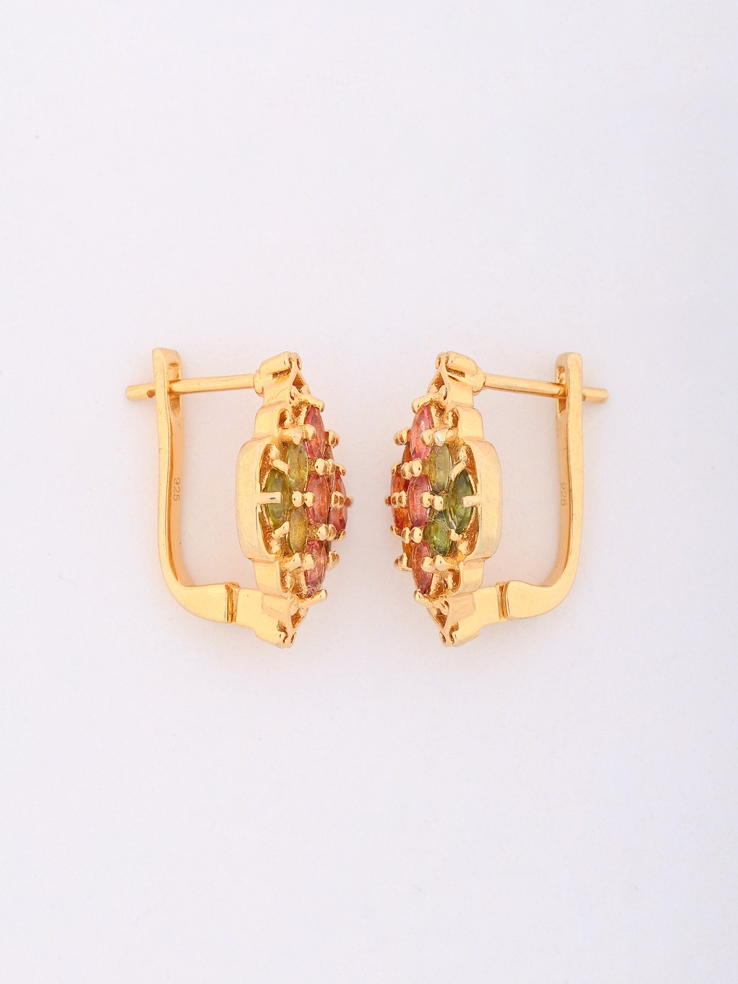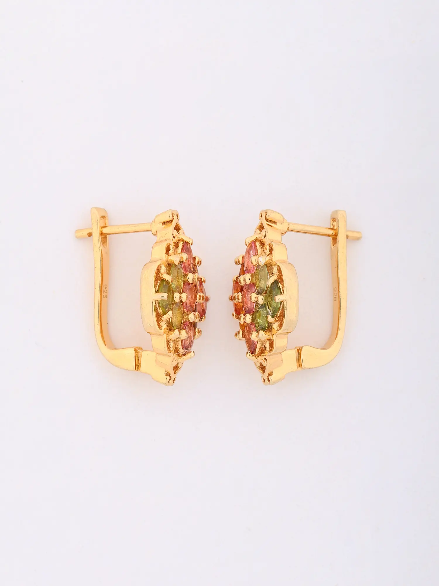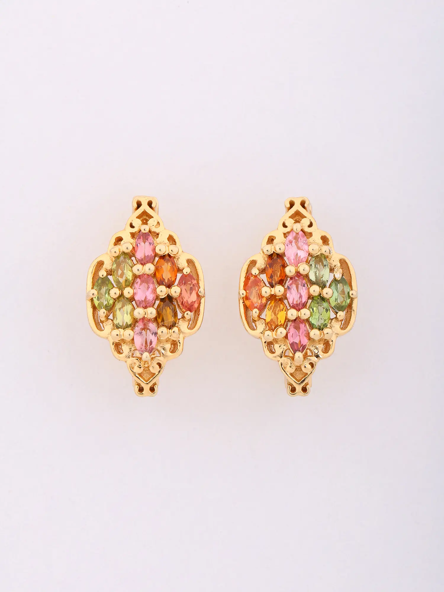 Adorning these creations are carefully selected multi-coloured tourmalines, each precisely faceted to capture and refract light with mesmerizing brilliance. The arrangement of these vibrant marquise-cut stones creates a dynamic visual appeal, reminiscent of a garden in full bloom. Subtle yet eye-catching, their dimensions of approximately 0.3 inches in height and 0.35 inches in width ensure a delicate presence that complements any ensemble without overwhelming it.