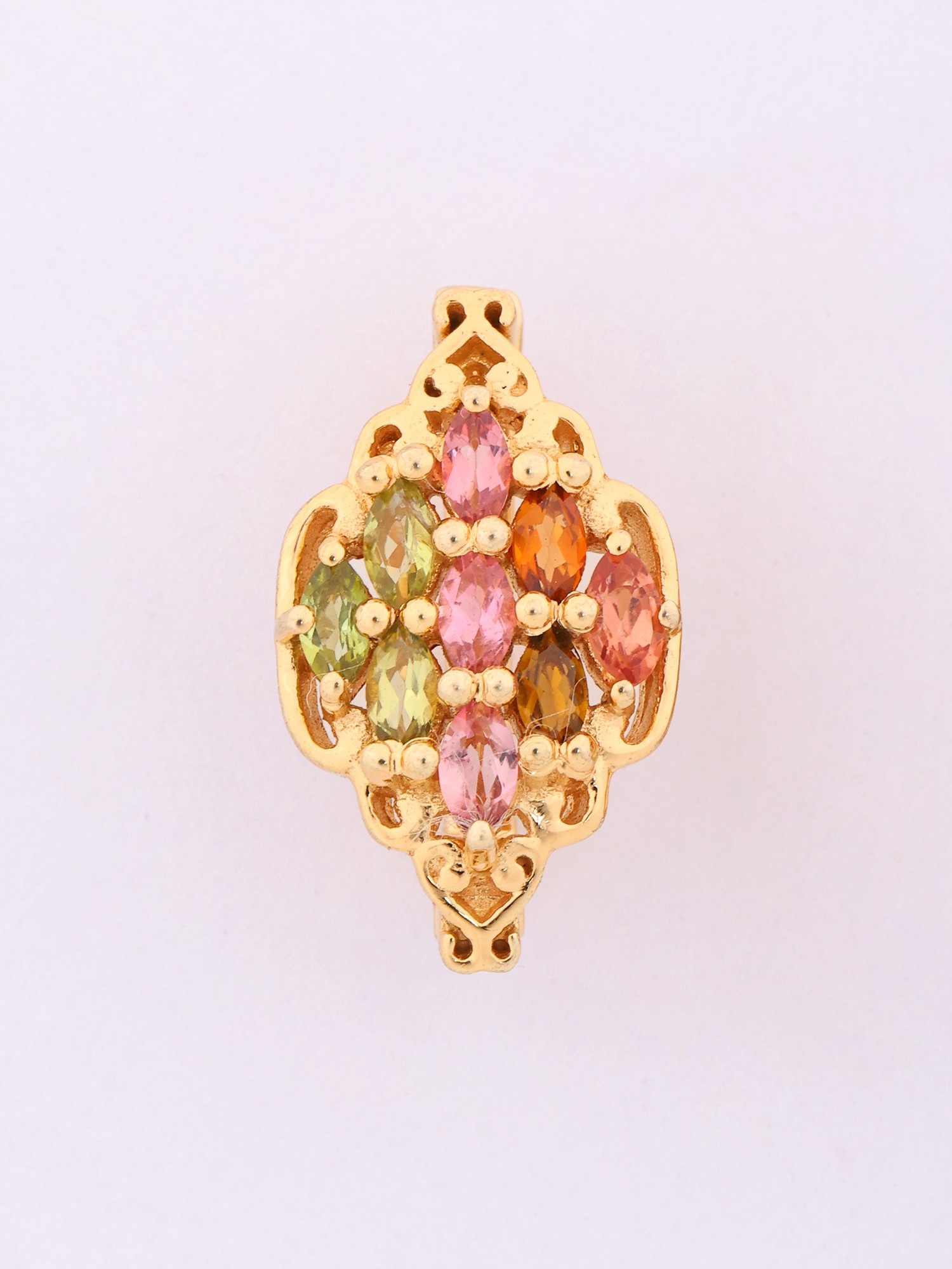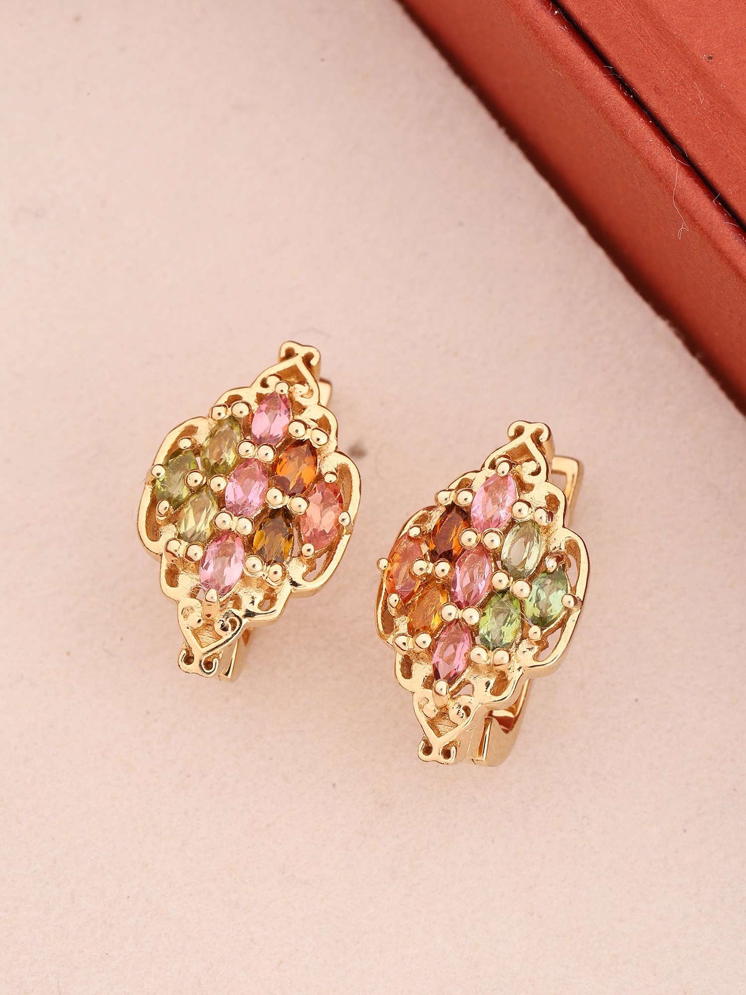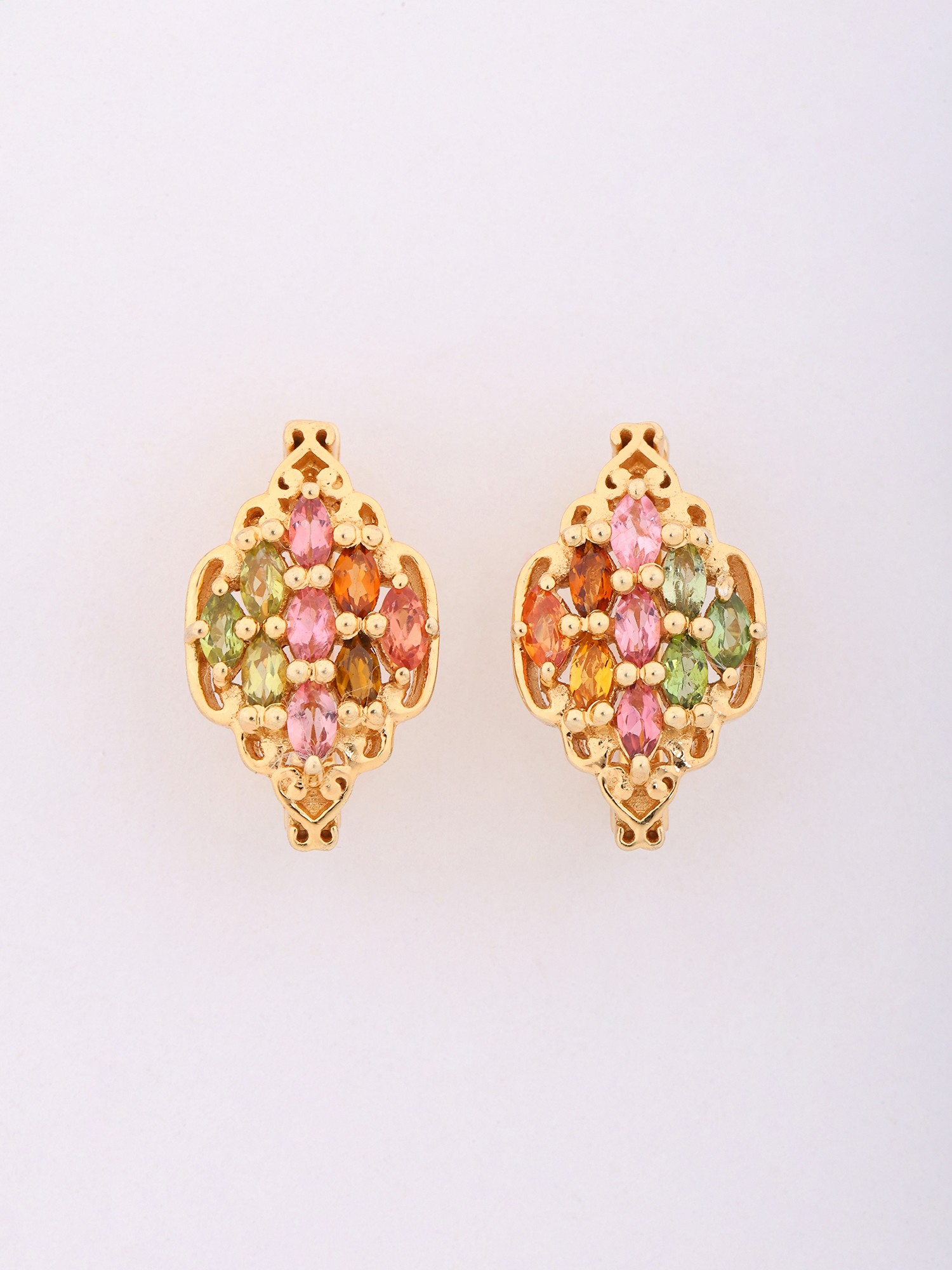 Adorning these creations are carefully selected multi-coloured tourmalines, each precisely faceted to capture and refract light with mesmerizing brilliance. The arrangement of these vibrant marquise-cut stones creates a dynamic visual appeal, reminiscent of a garden in full bloom. Subtle yet eye-catching, their dimensions of approximately 0.3 inches in height and 0.35 inches in width ensure a delicate presence that complements any ensemble without overwhelming it.
