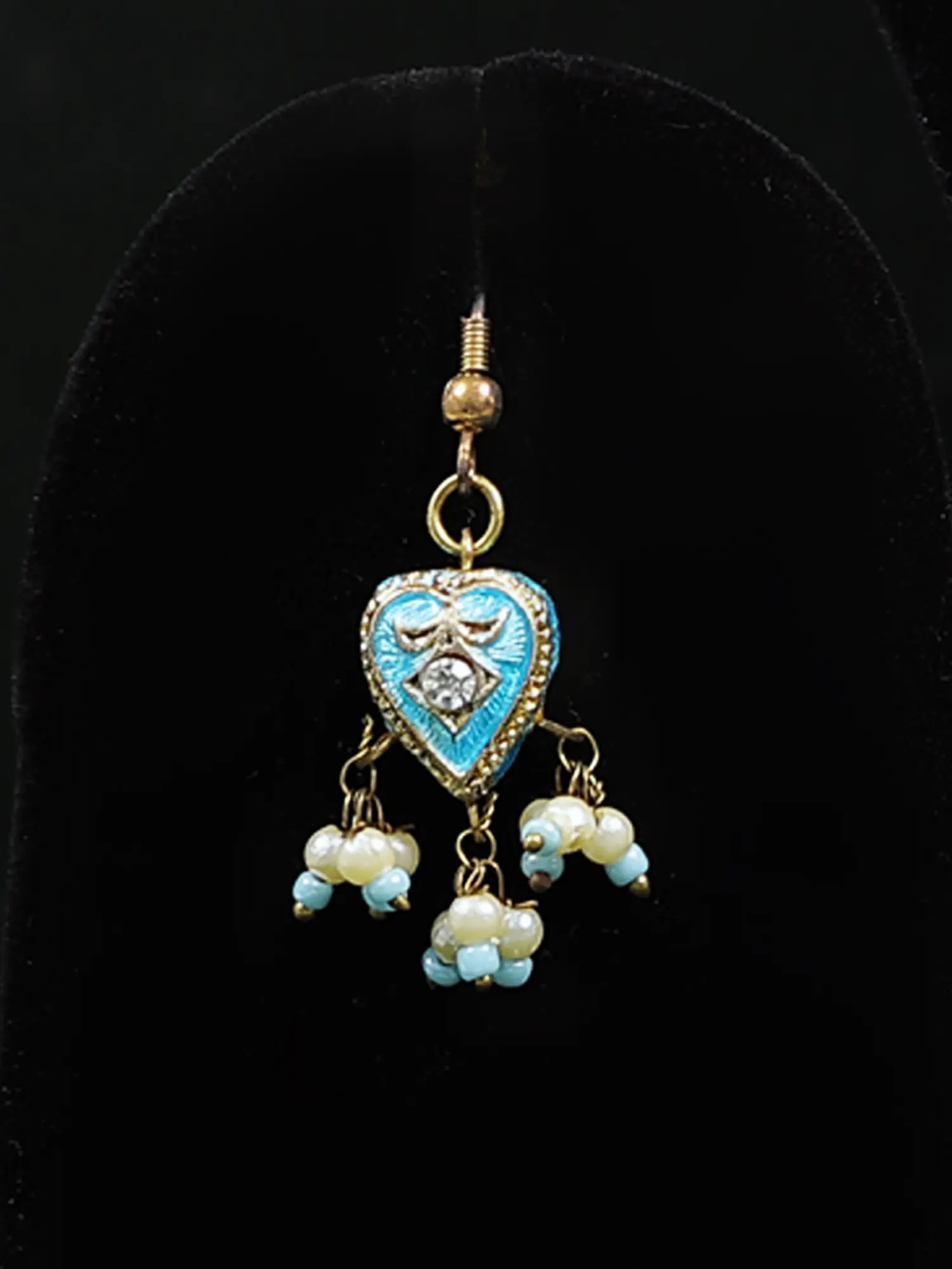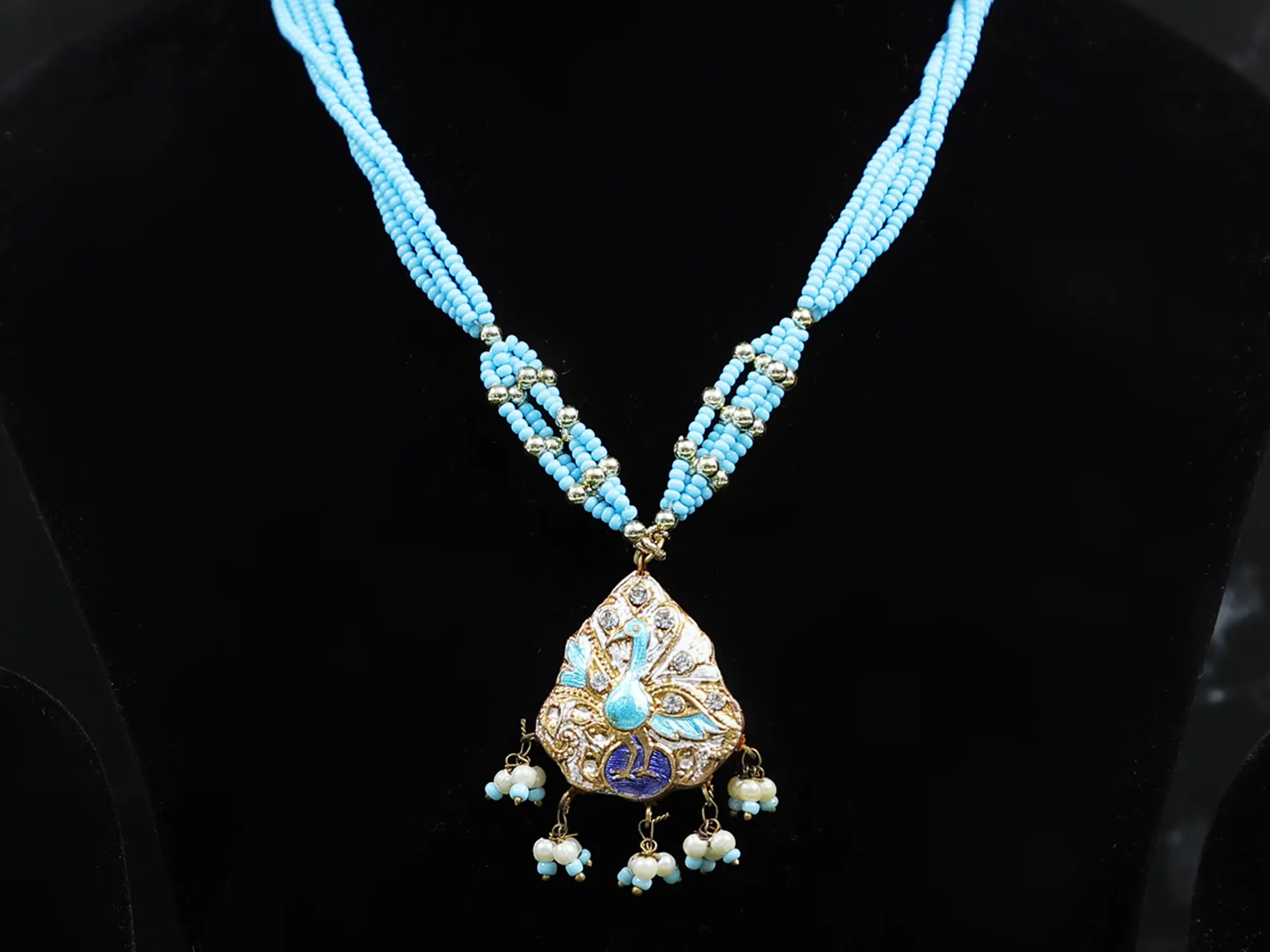 The necklace features a cascade of delicate beads in a soothing hue, woven together to create a multi-strand effect that adds depth and texture. The pendant is the focal point of the design, showcasing intricate metalwork and a captivating arrangement of embellishments. Small, dainty pearl-like dangles add a touch of whimsy, catching the light with every movement. The earrings echo the design of the pendant, offering a coordinated and polished look. The earrings also feature the pearl-like dangles that compliment the necklace.