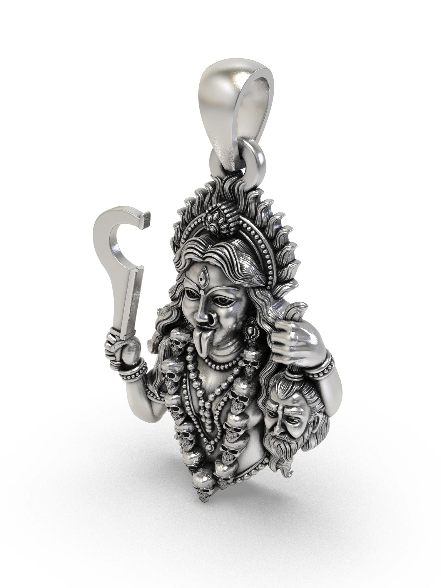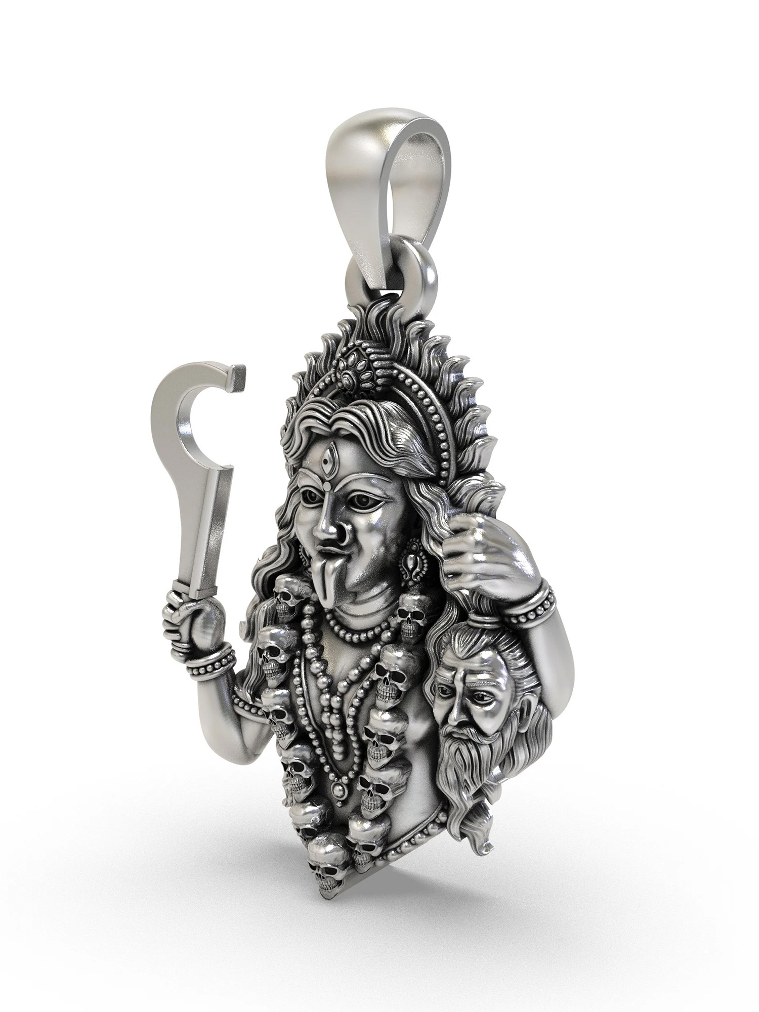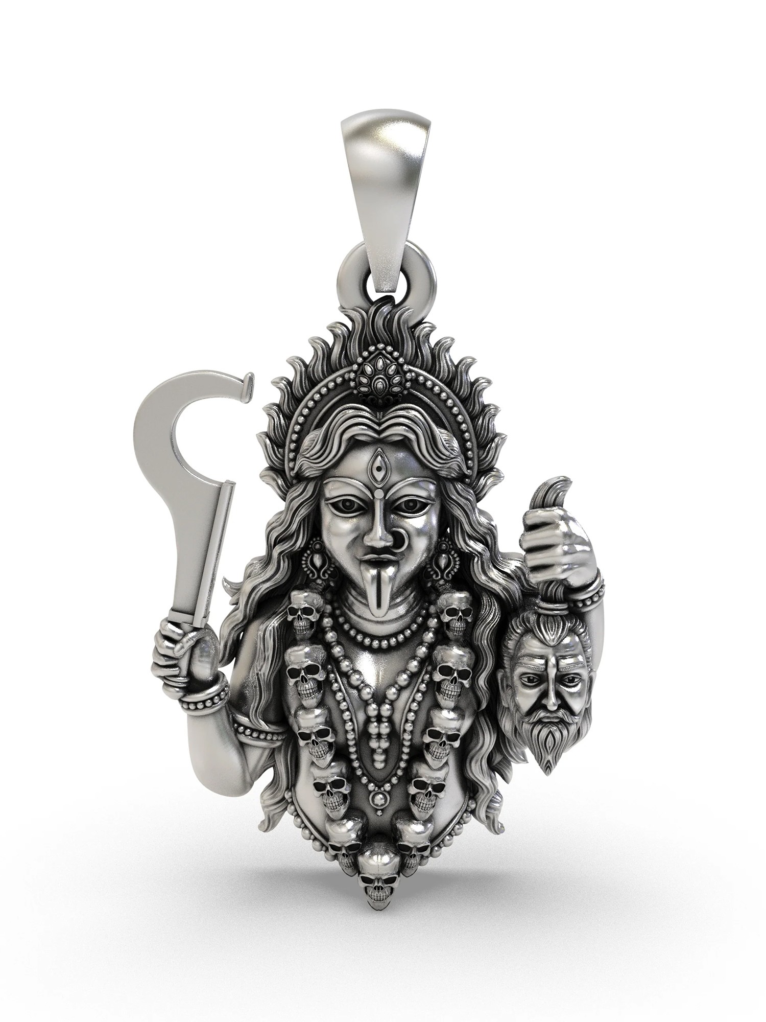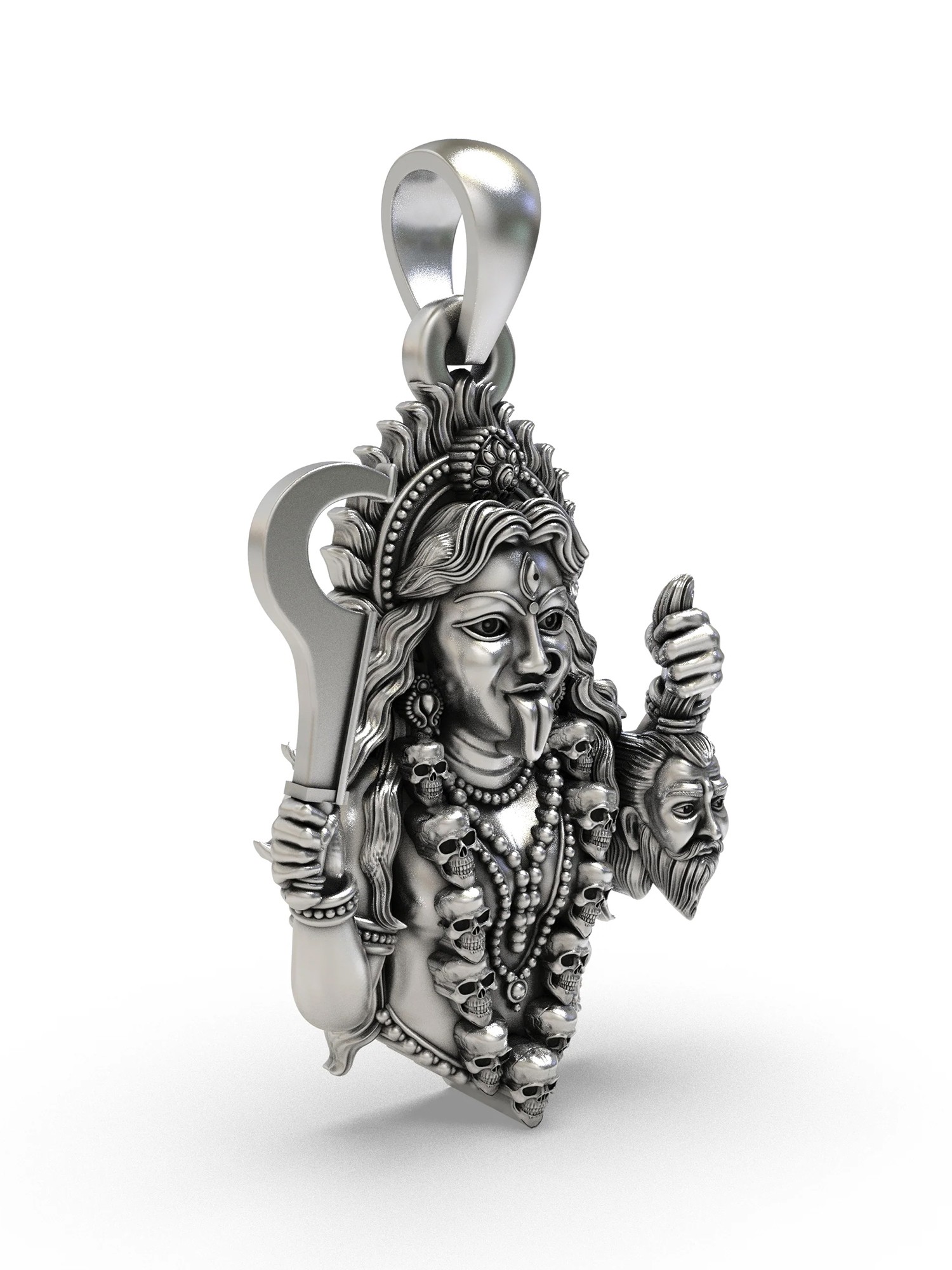 This exquisite pendant is a powerful representation of Goddess Kali, a deity revered for her fierce protection, transformative energy, and her role in transcending illusion. Crafted with meticulous detail, this piece captures the intensity and profound symbolism associated with this formidable goddess. The pendant showcases Kali in her iconic form, with her striking gaze, flowing hair, and the potent symbols she wields, all rendered in lustrous sterling silver.