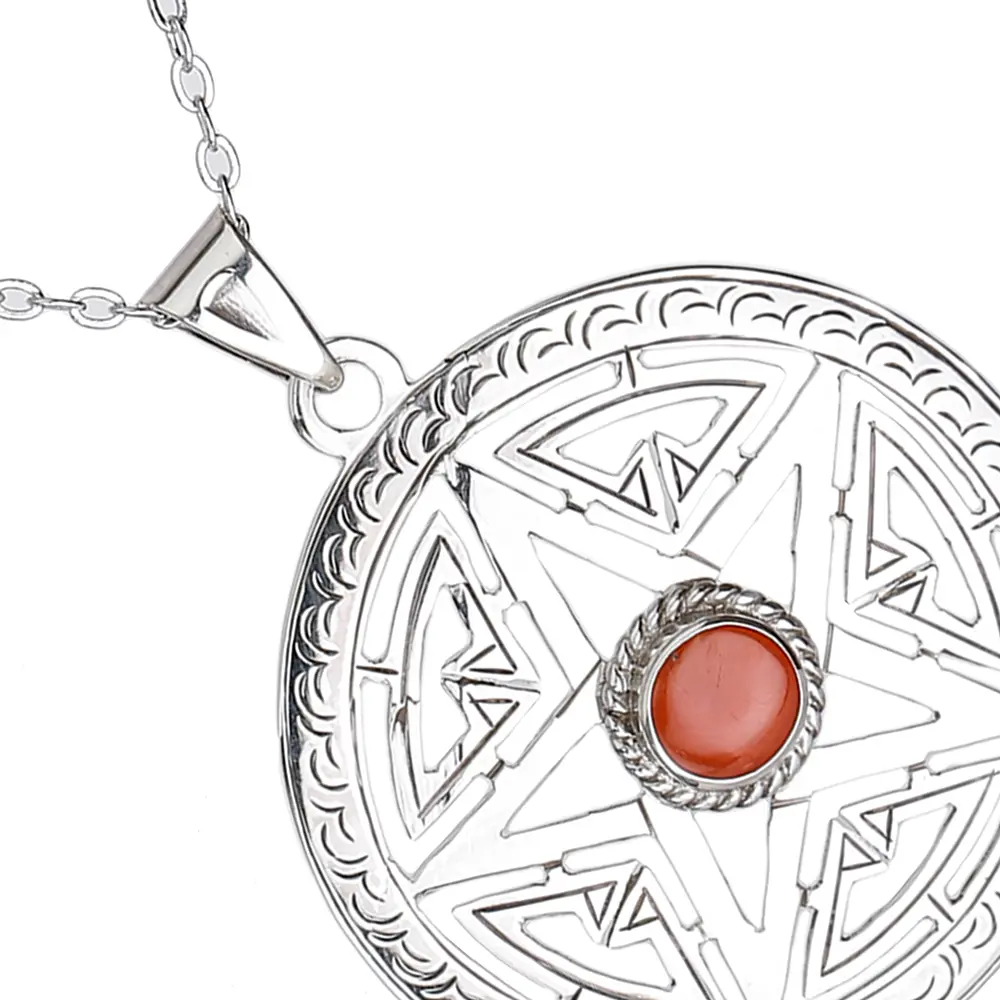 Discover a piece that resonates with ancient wisdom and captivating beauty. This exquisite pendant, meticulously crafted from sterling silver, features a striking five-pointed star at its heart. The star, an enduring symbol of harmony, protection, and the interconnectedness of all things, is intricately carved with a captivating geometric pattern that evokes the labyrinthine pathways of spiritual exploration.