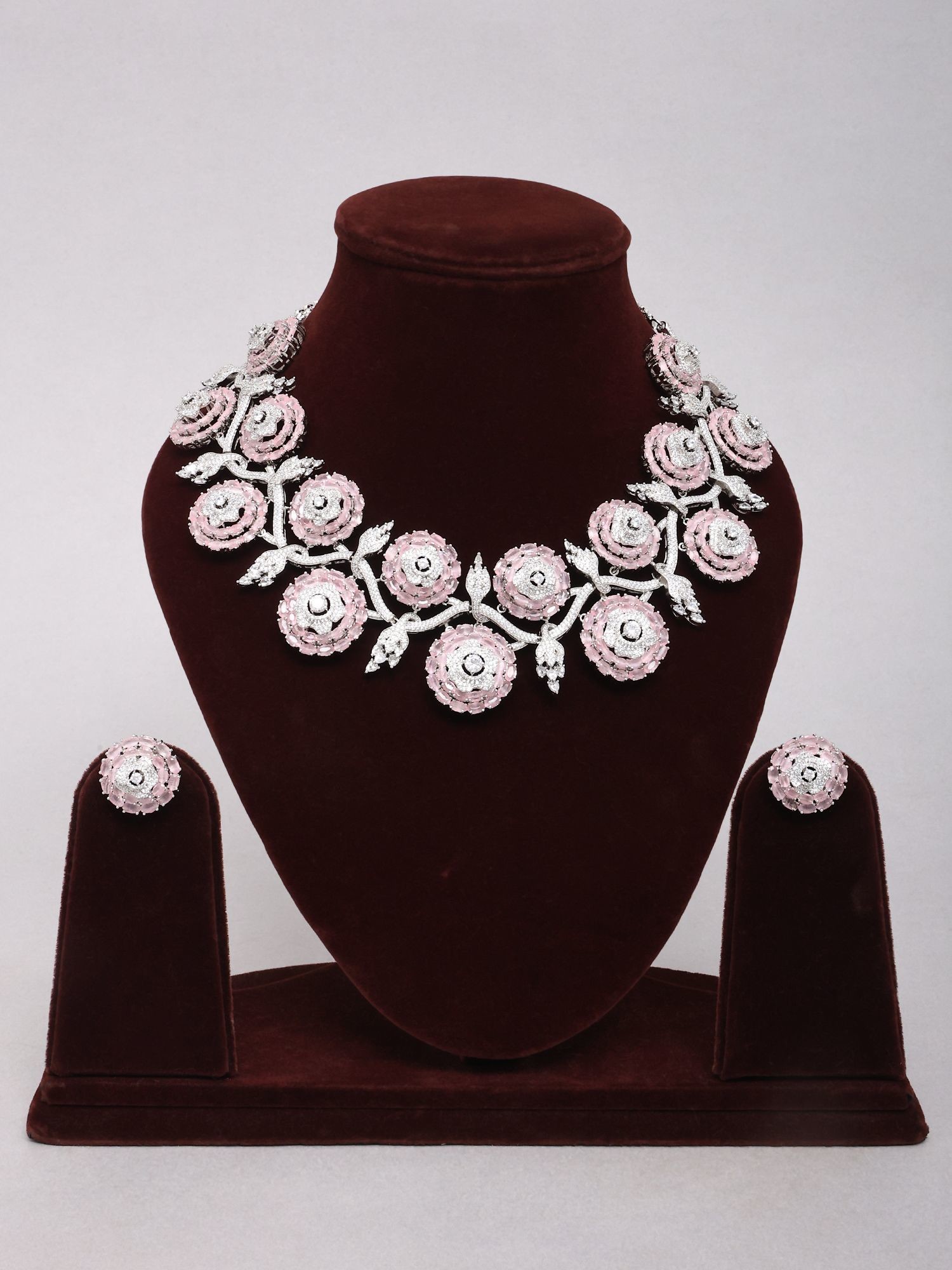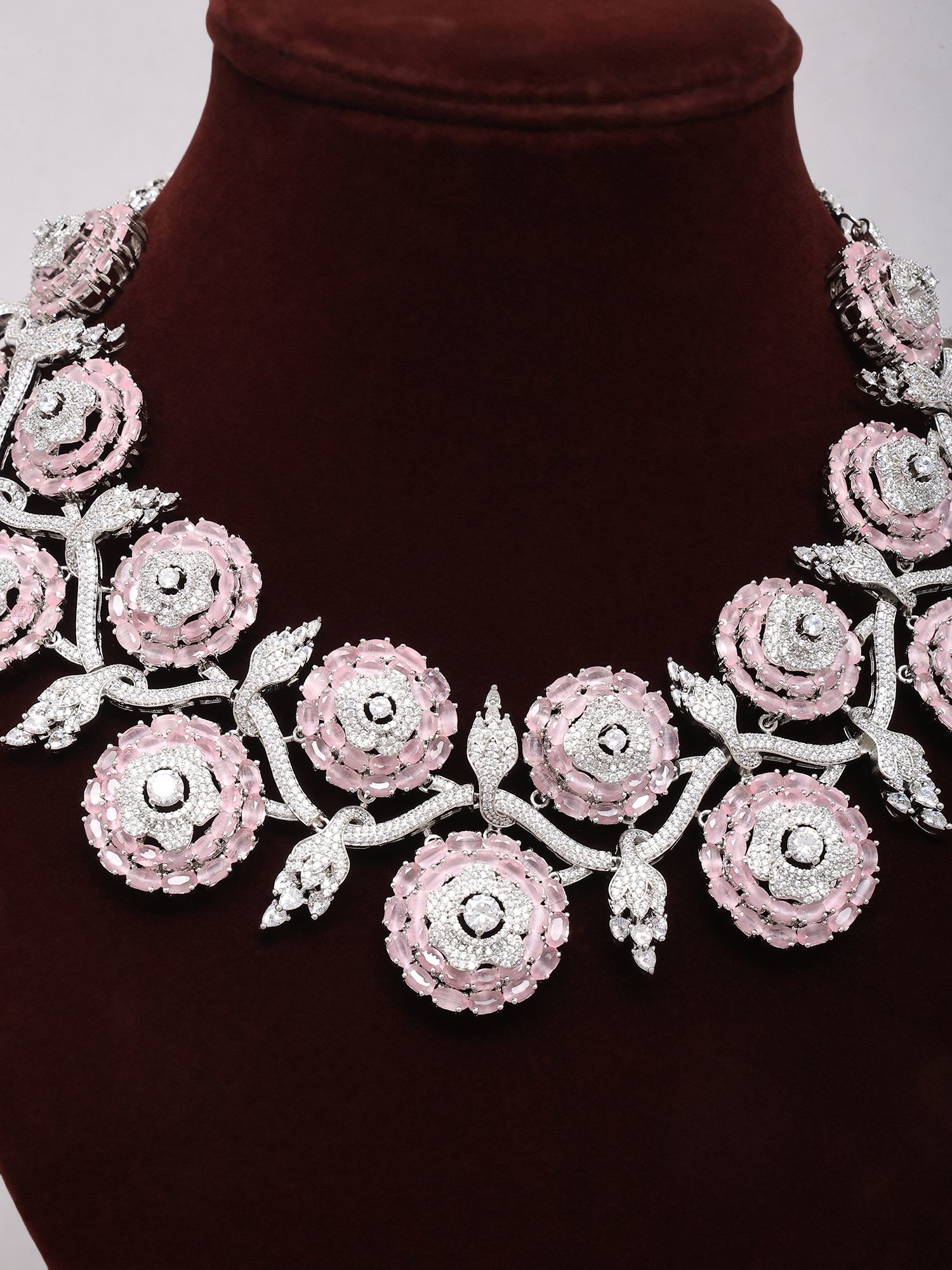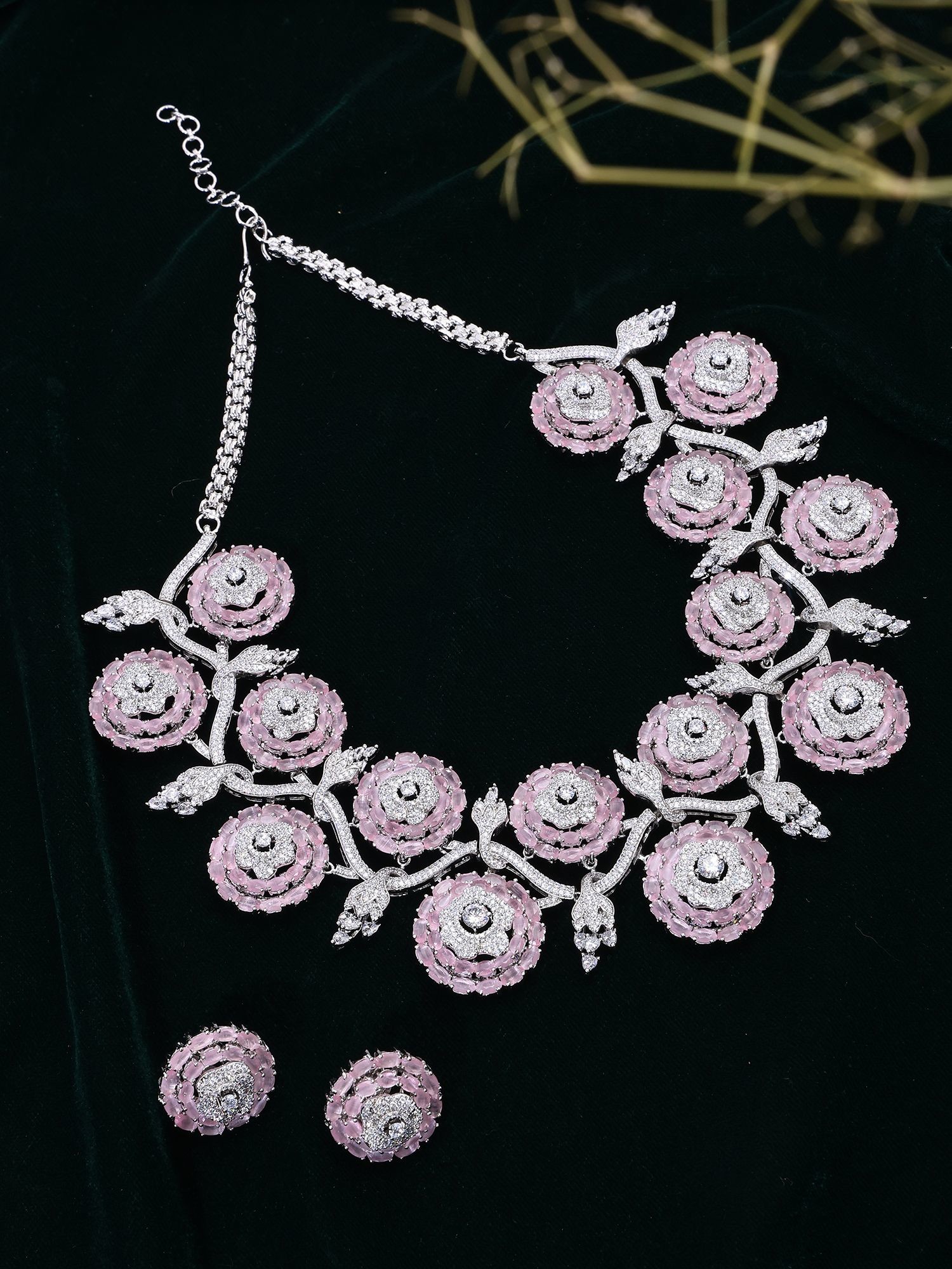 Floral American Diamond Bridal Statement Necklace Set with Stud Earrings