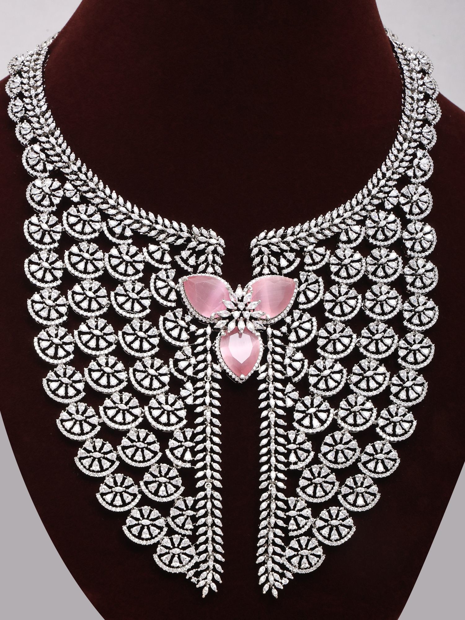 Multi-Strand American Diamond Bridal Necklace Set with Pink Stone Earrings
