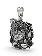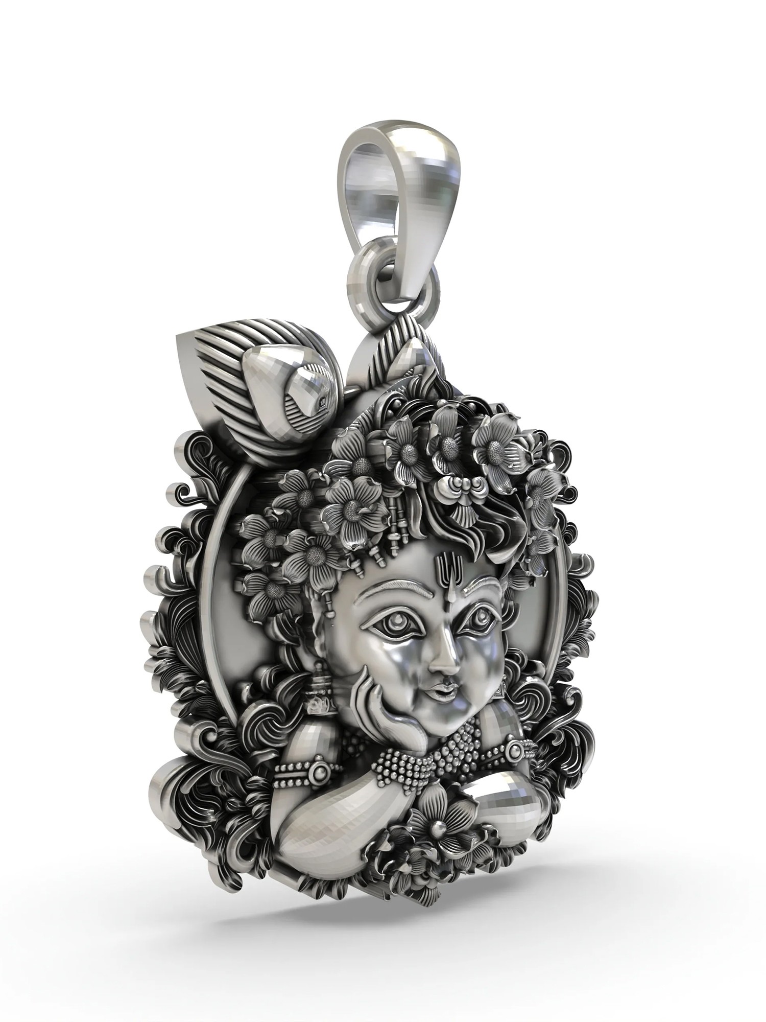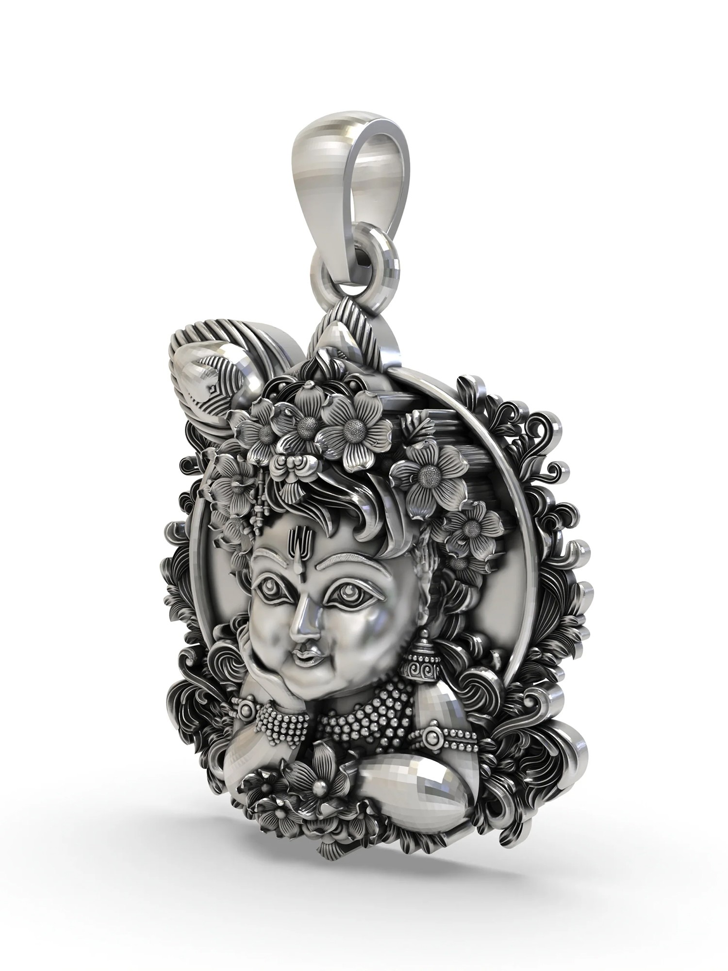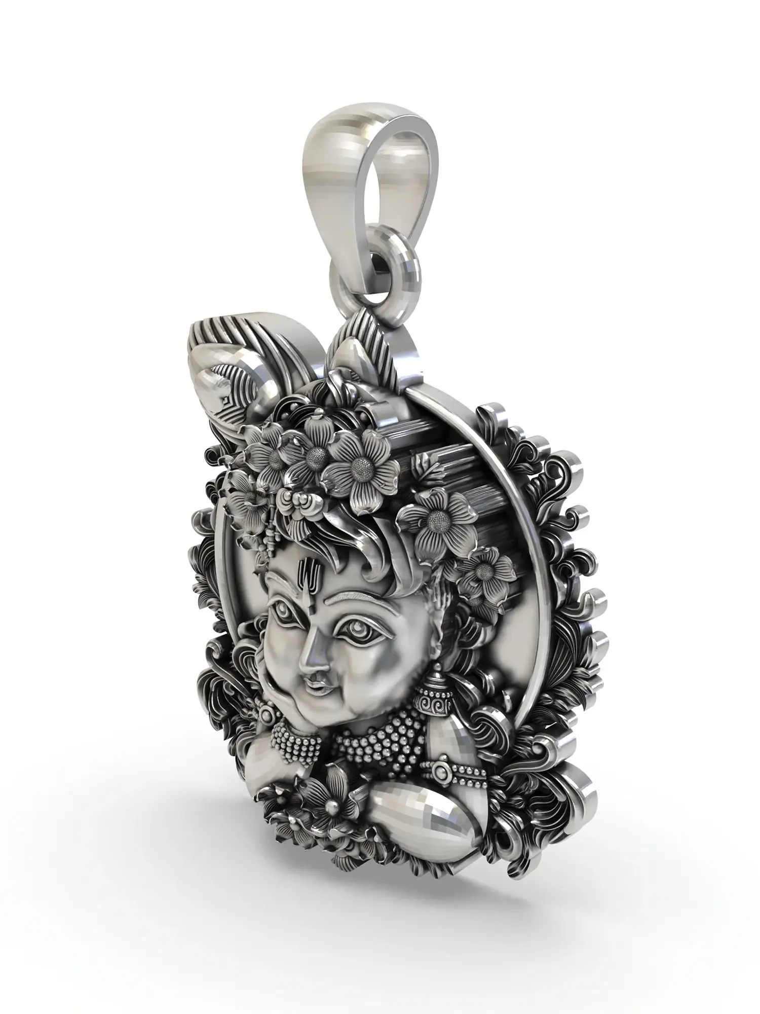 Every facet of this pendant speaks of meticulous craftsmanship. The delicate rendering of Bal Krishna’s features, from the soulful eyes to the subtle curve of his lips, evokes a sense of serenity and playful divinity. He is adorned with traditional jewelry, including a beaded necklace that lies gracefully around his neck and a bracelet that highlights the delicate turn of his wrist. Surrounding his serene visage is a breathtaking floral arrangement, bursting with intricately sculpted blossoms and leaves, symbolizing purity, beauty, and the vibrant unfolding of life. Peeking out from behind the blossoms is a majestic peacock feather, a signature emblem of Krishna, adding an iconic touch of his divine presence and his connection to nature. The swirling, ornate border frames the central imagery, reminiscent of traditional Indian motifs, enhancing the overall regal and spiritual aura of the pendant. ––––––––––––––––––––
